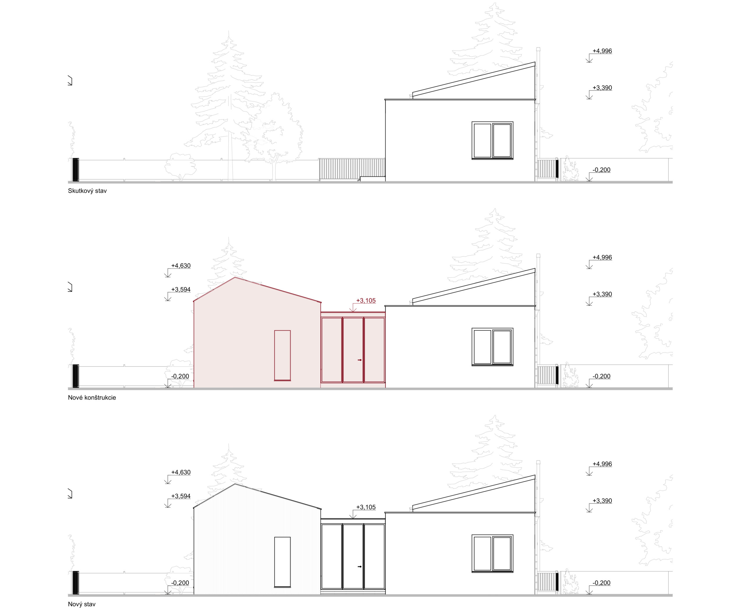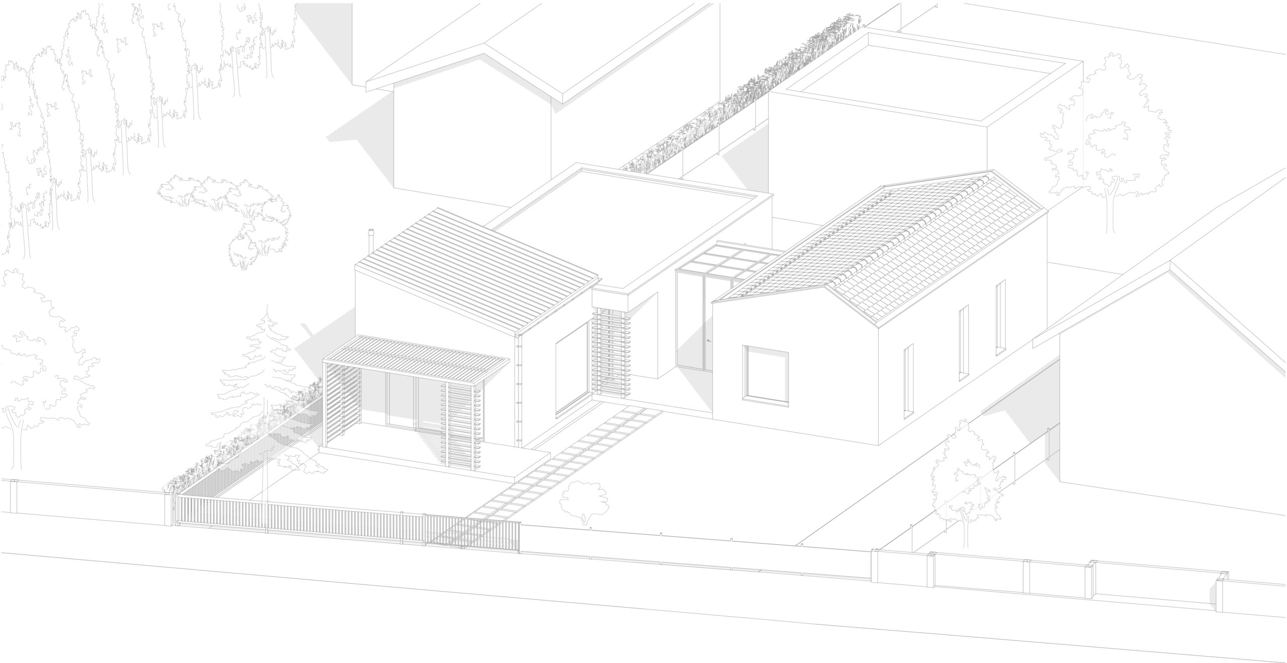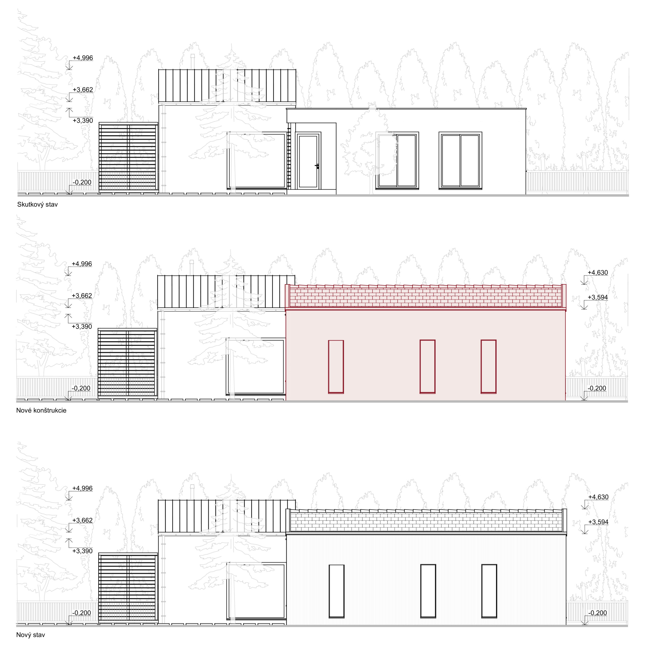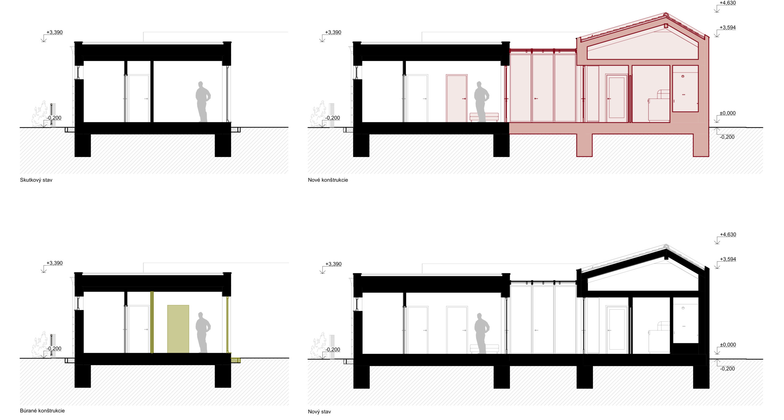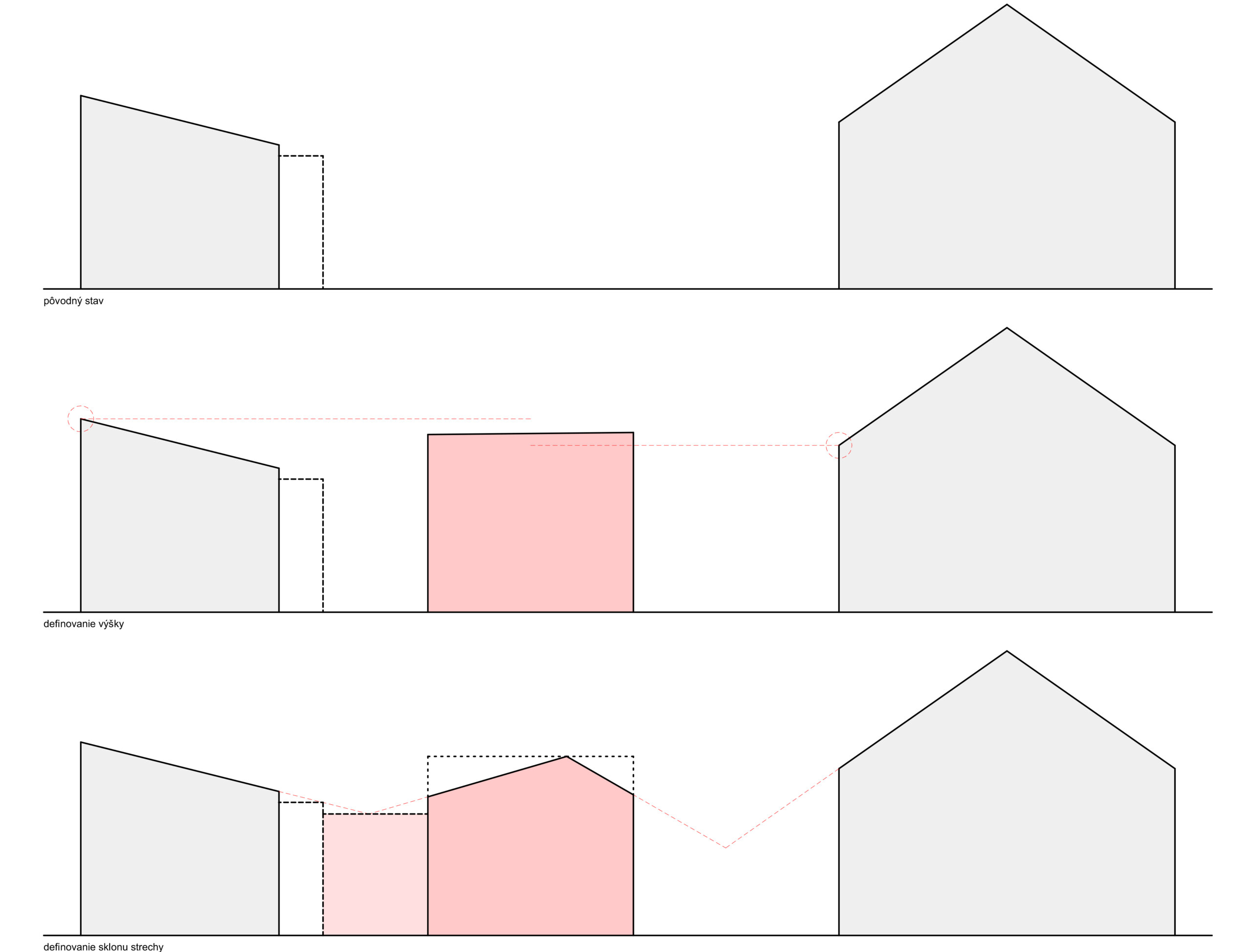 Hmotový koncept prístavby bol primárne navrhnutý v kontexte s okolitou zástavbou. Nadväzuje na tvar najbližších šikmých striech vďaka priesečníkom, ktoré sa pomyselne pretínajú medzi objektami – existujúcim RD, ku ktorému bude prístavba pristavená a susedným rodinným domom na vedľajšom pozemku. Strecha je navrhnutá ako sedlová s rôznym sklonom strešných rovín, ktorých sklon závisí od daného kontextu vedľajšieho objektu. Hrebeň prístavby sa nachádza vo výške, ktorá je v priemernej výške medzi hrebeňom pultovej strechy pristavovaného objektu a rímsou susedného objektu. Objekt je navrhnutý so zaatikovým žľabom. Vďaka tomu je hlavná hmota prístavby v minimalistickom prevedení. Medzi prístavbou so sedlovou strechou a pôvodnou hmotou rodinného domu je navrhnutý medzipriestor s plochou strechou, ktorá nadväzuje na plochú strechu existujúcej časti domu. Výška medzipriestoru je nižšia ako rímsa navrhovanej prístavby a nižšia ako horná hrana atiky pôvodného rodinného domu. Vďaka tomu je hmota zádveria menej výrazná, čo bolo aj zámerom. Priečelie medzipriestoru je navrhnuté ako celopresklené s oceľoou nosnou konštrukciou. Fasáda prístavby so šikmou strechou je navrhnutá z dekoračnej omietky v bielom prevedení, vďaka čomu sa prístavba odlíši od pôvodnej substancie.