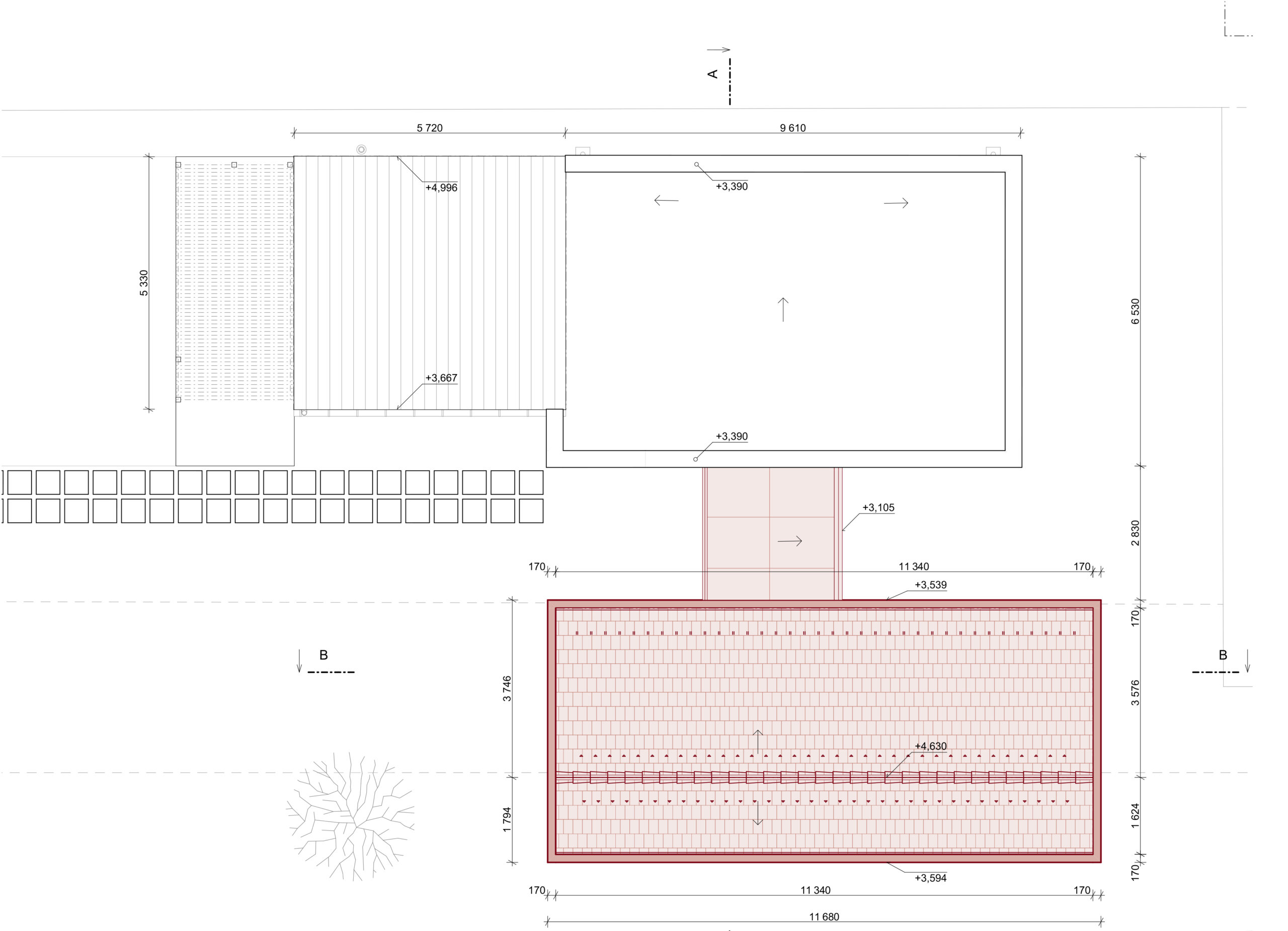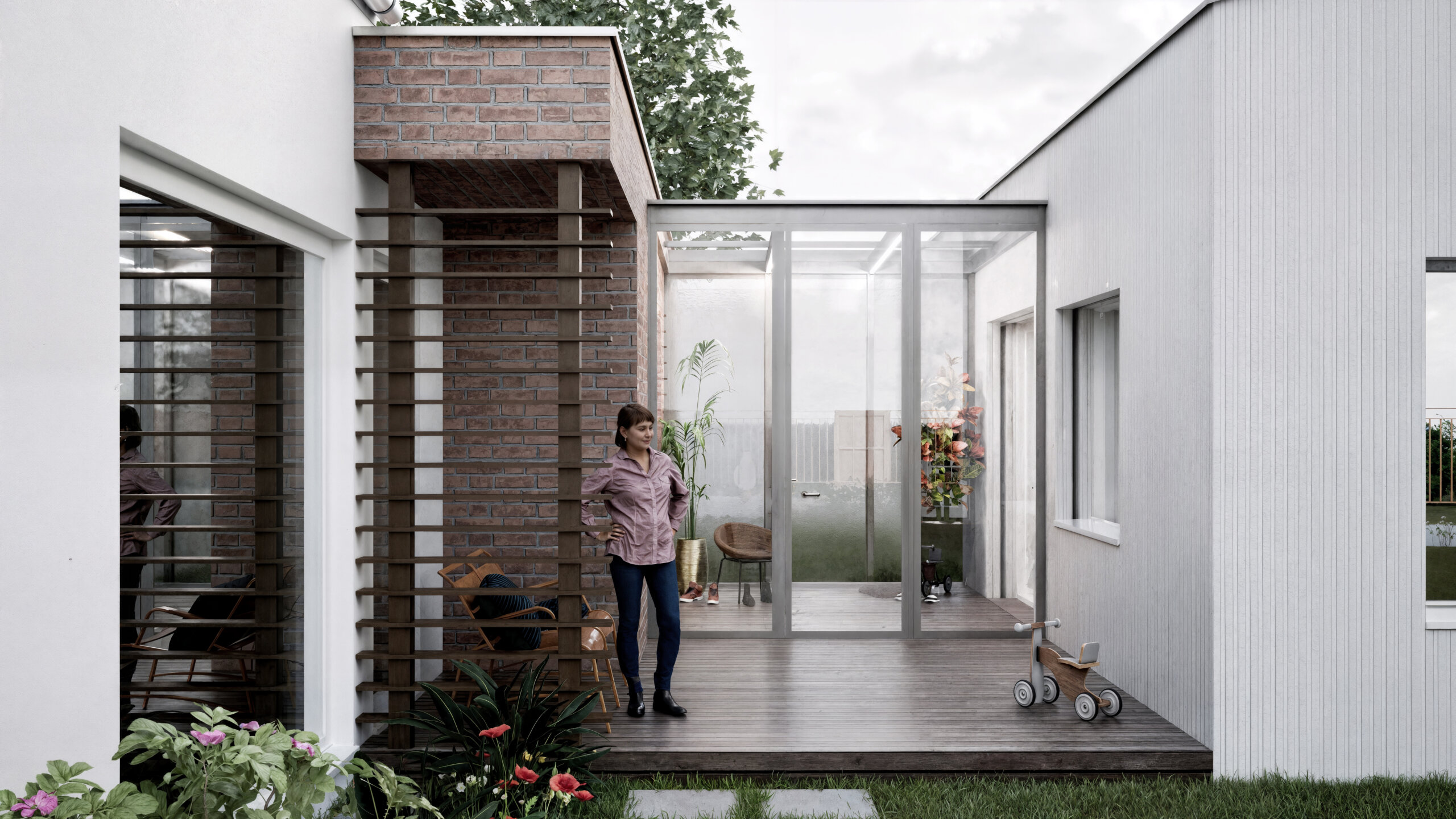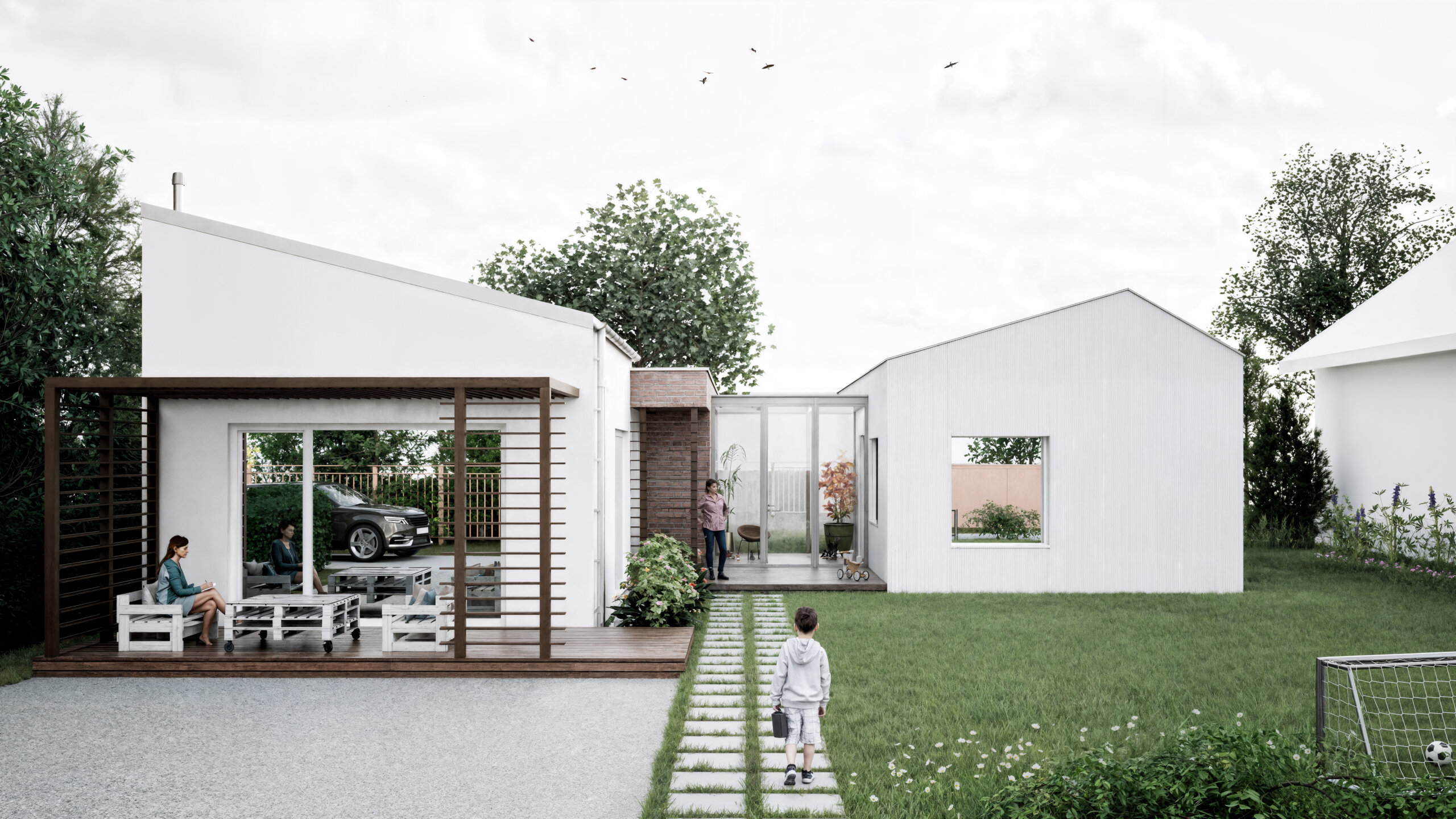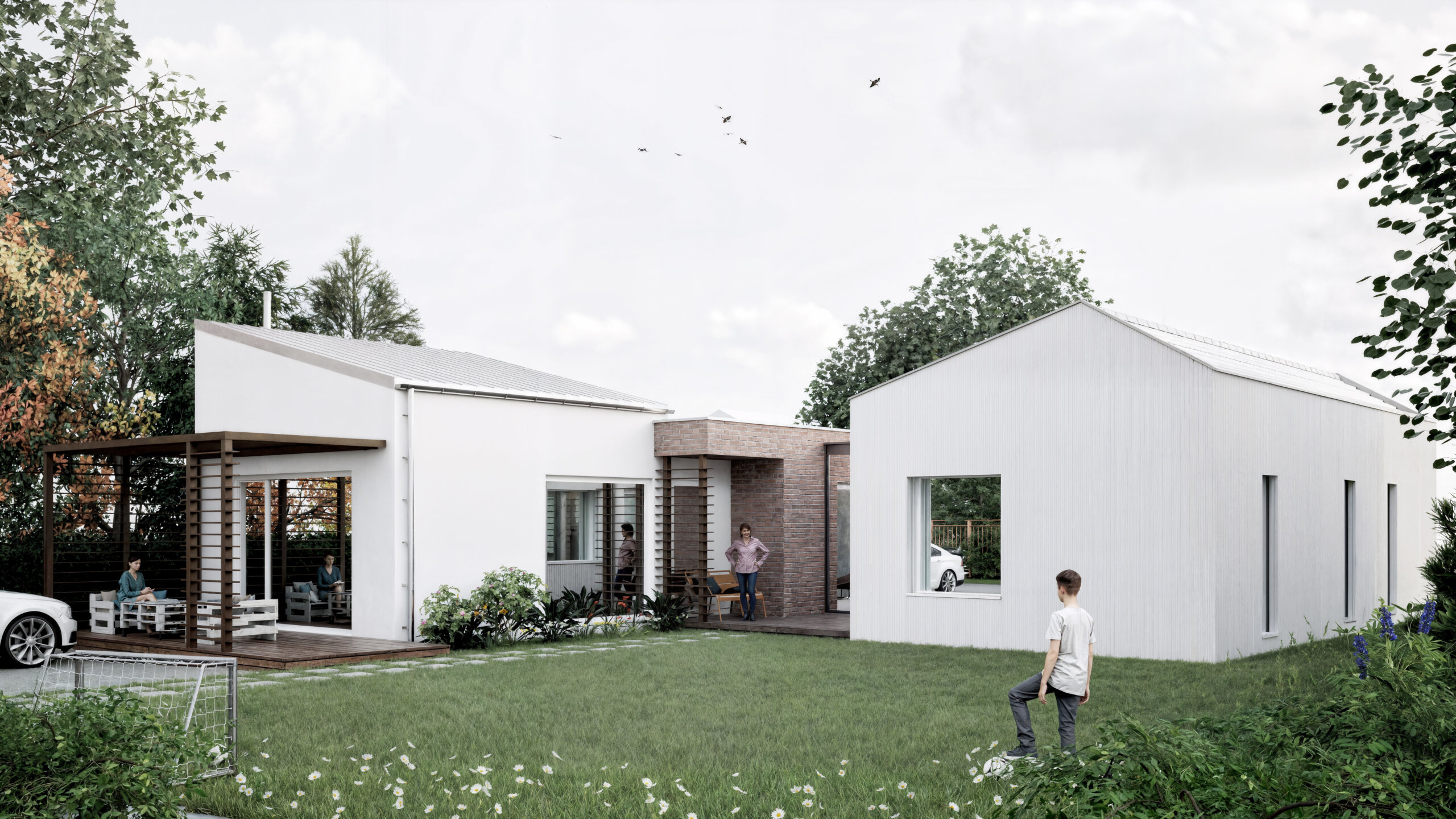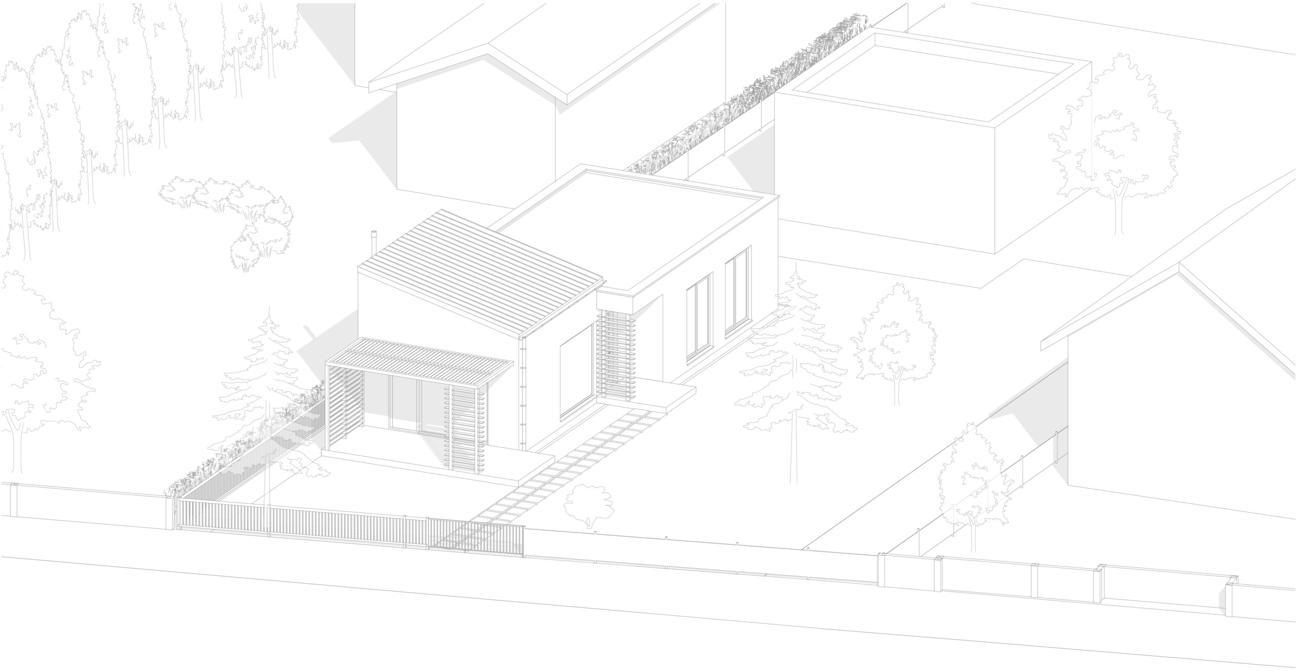 Hmotový koncept prístavby bol primárne navrhnutý v kontexte s okolitou zástavbou. Nadväzuje na tvar najbližších šikmých striech vďaka priesečníkom, ktoré sa pomyselne pretínajú medzi objektami – existujúcim RD, ku ktorému bude prístavba pristavená a susedným rodinným domom na vedľajšom pozemku. Strecha je navrhnutá ako sedlová s rôznym sklonom strešných rovín, ktorých sklon závisí od daného kontextu vedľajšieho objektu. Hrebeň prístavby sa nachádza vo výške, ktorá je v priemernej výške medzi hrebeňom pultovej strechy pristavovaného objektu a rímsou susedného objektu. Objekt je navrhnutý so zaatikovým žľabom. Vďaka tomu je hlavná hmota prístavby v minimalistickom prevedení. Medzi prístavbou so sedlovou strechou a pôvodnou hmotou rodinného domu je navrhnutý medzipriestor s plochou strechou, ktorá nadväzuje na plochú strechu existujúcej časti domu. Výška medzipriestoru je nižšia ako rímsa navrhovanej prístavby a nižšia ako horná hrana atiky pôvodného rodinného domu. Vďaka tomu je hmota zádveria menej výrazná, čo bolo aj zámerom. Priečelie medzipriestoru je navrhnuté ako celopresklené s oceľoou nosnou konštrukciou. Fasáda prístavby so šikmou strechou je navrhnutá z dekoračnej omietky v bielom prevedení, vďaka čomu sa prístavba odlíši od pôvodnej substancie.