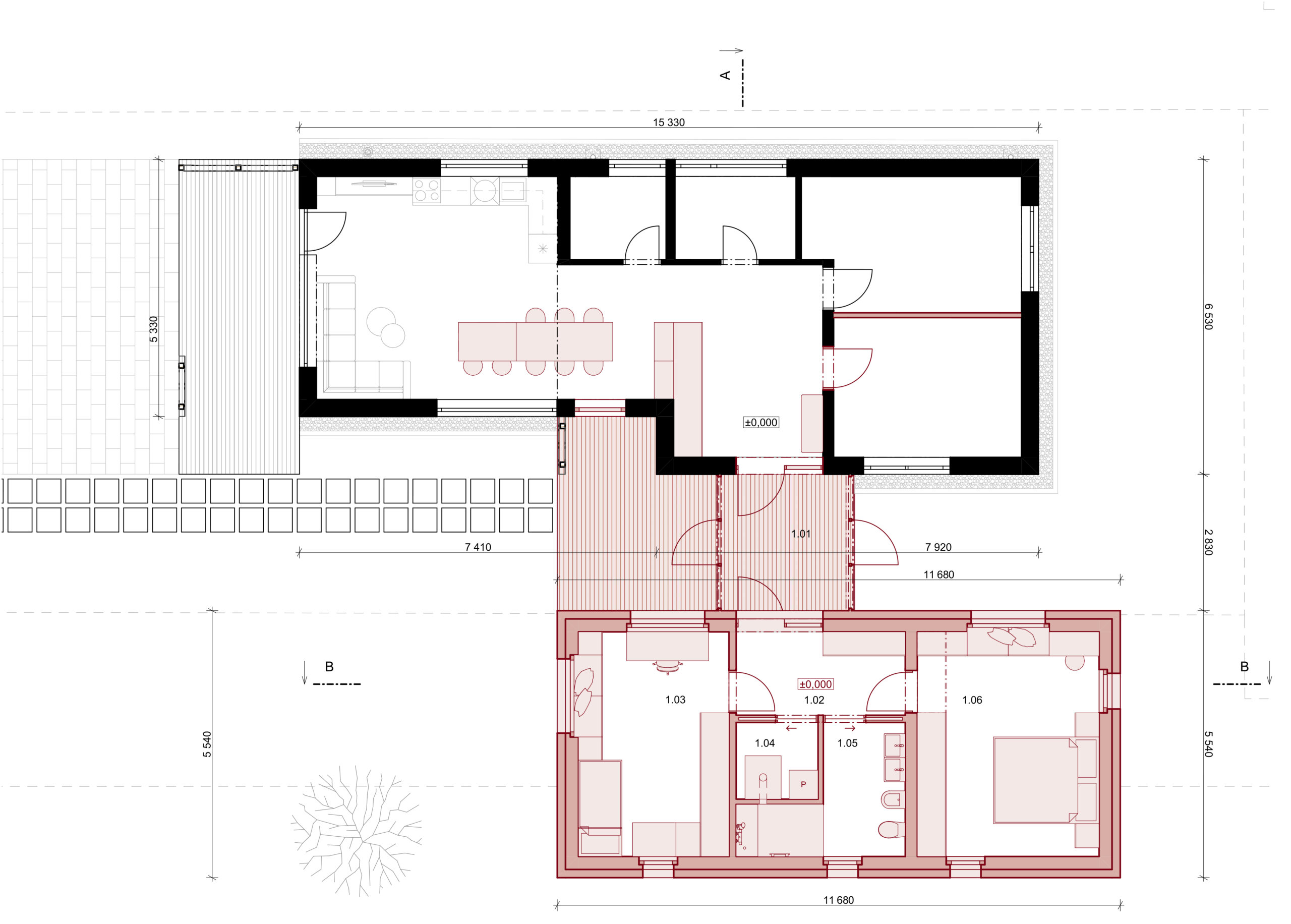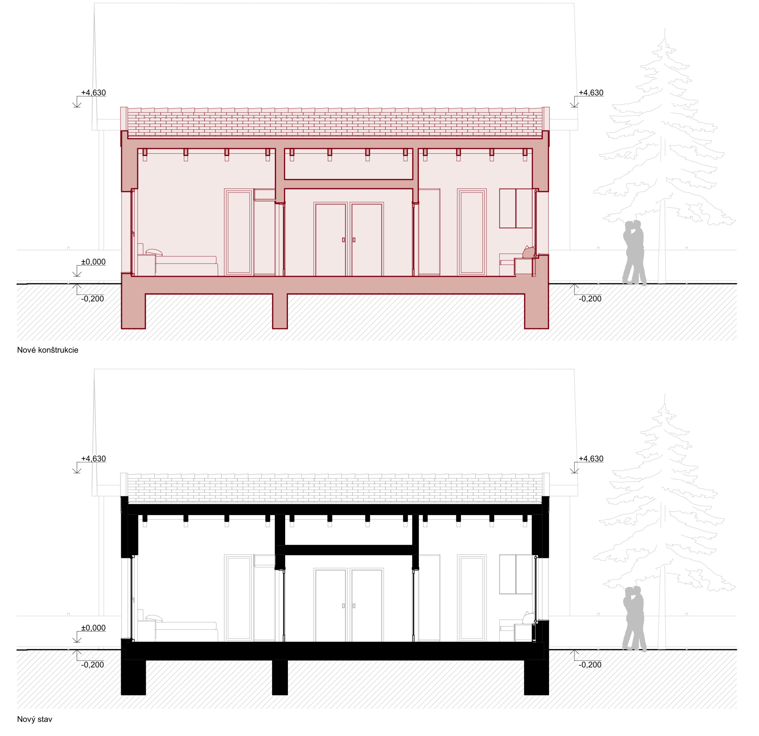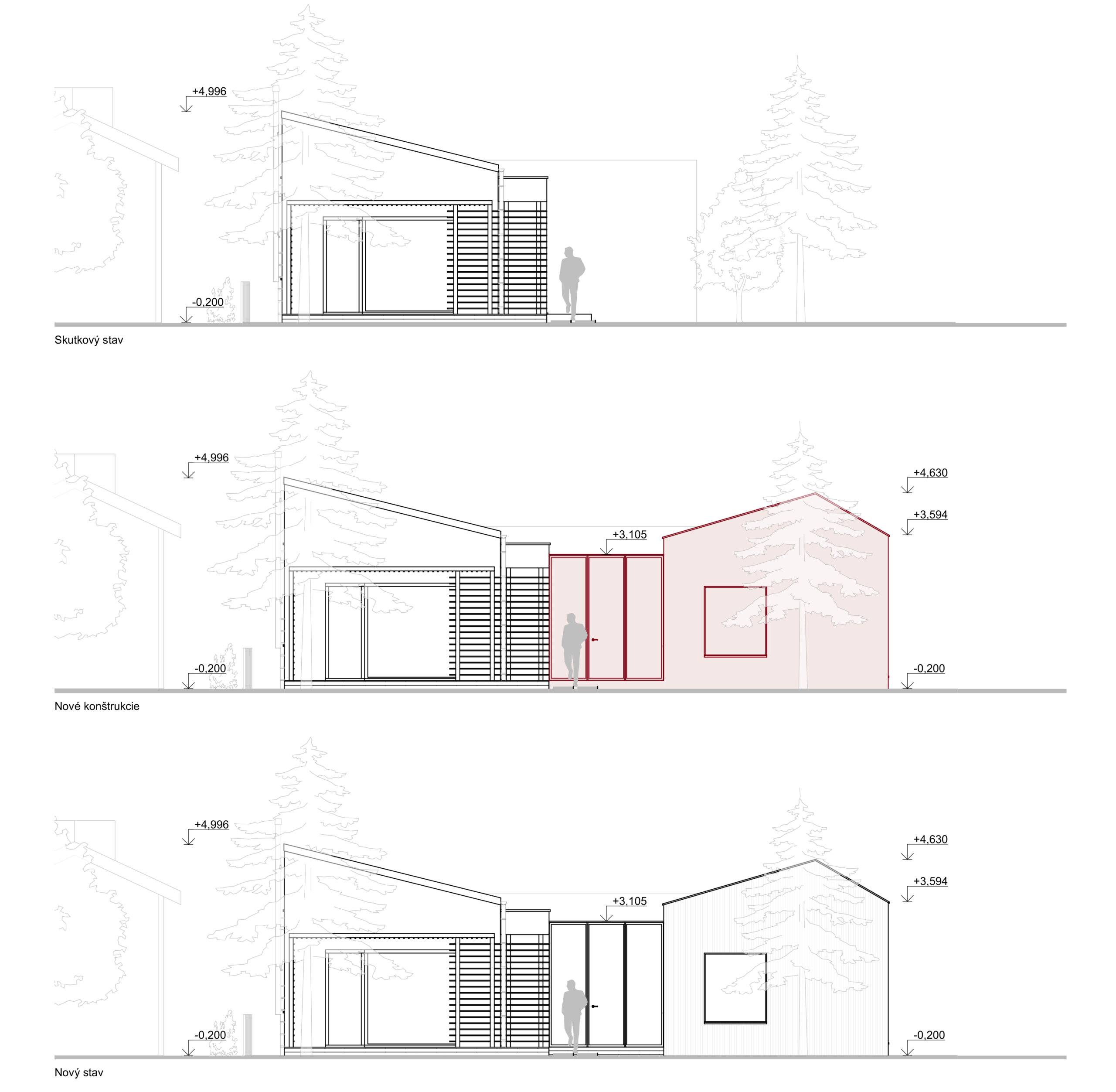 V navrhovanom stave je v pôvodnom dome rozdelená súčasná detská izba na dva menšie priestory. Existujúci hlavný vstup sa nahradí oknom a nový vstup bude riešený cez existujúce okno, ktoré v súčasnosti presvetľuje spálňu. Medzi prístavbou a pôvodným rodinným domom je navrhnutý presklený medzipriestor, ktorý by mal slúžiť ako zádverie pre obe hmoty. Vďaka tomu je možná eliminácia zádveria v pôvodnom objekte a zväčšenie spoločenskej zóny. V prístavbe sa bude nachádzať súkromná zóna pozostávajúca zo spálne pre rodičov, detská izba, kúpeľňa, technická miestnosť a chodba. Zo zádveria je prístupná chodba, kde môže byť umiestnený šatník. Chodba je ústredným priestorom, z ktorého sa dostávame do ostatných priestorov. V centre prístavby sa nachádza technická miestnosť a kúpeľňa, ktoré sú prístupné z chodby. Kúpeľňa obsahuje dvoj-umývadlo, bidet, toaletu a sprchovým kút s vymurovaným sedením. Navrhnutá spálňa je orientovaná na severozápadnú svetovú stranu. V spálni je navrhnutá manželská posteľ, „beauty“ stolík, sedenie v okne a úložný priestor. Podobne je koncipovaná aj detská izba, ktorá je navrhnutá smerom na juhozápad. V detskej izbe je navrhnutá posteľ, ktorá by mohla byť aj poschodová, pracovný stôl, sedenie v okne a úložný priestor.
