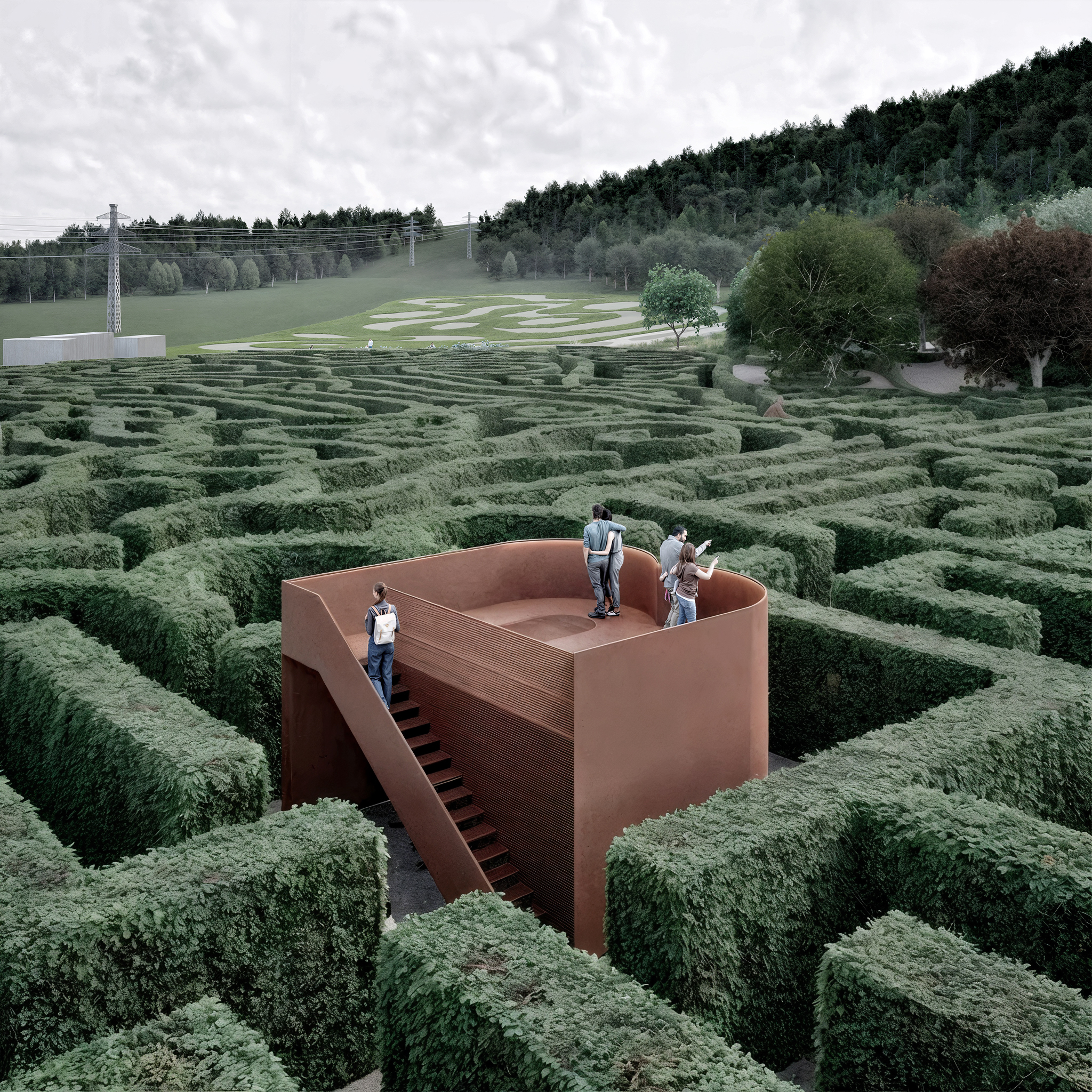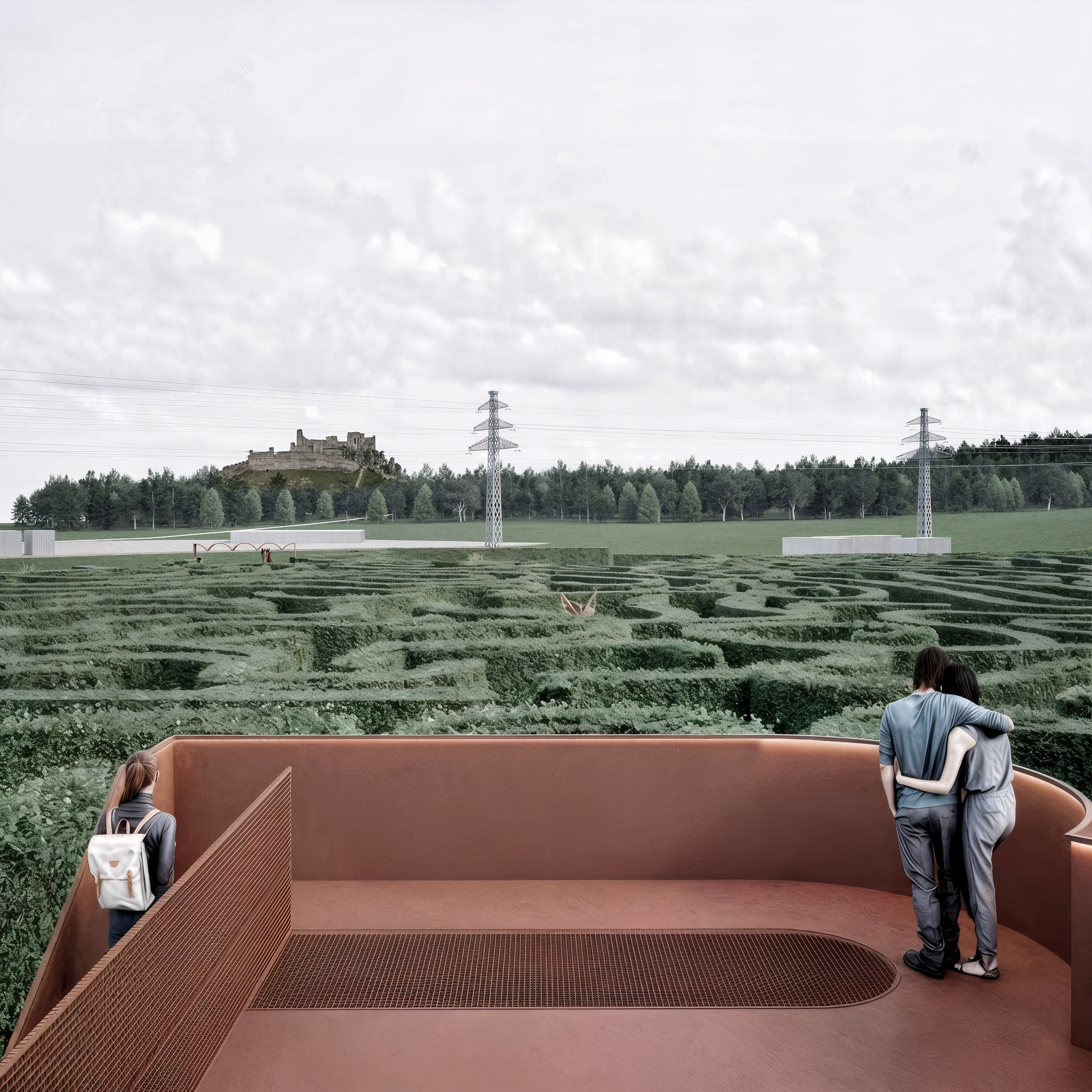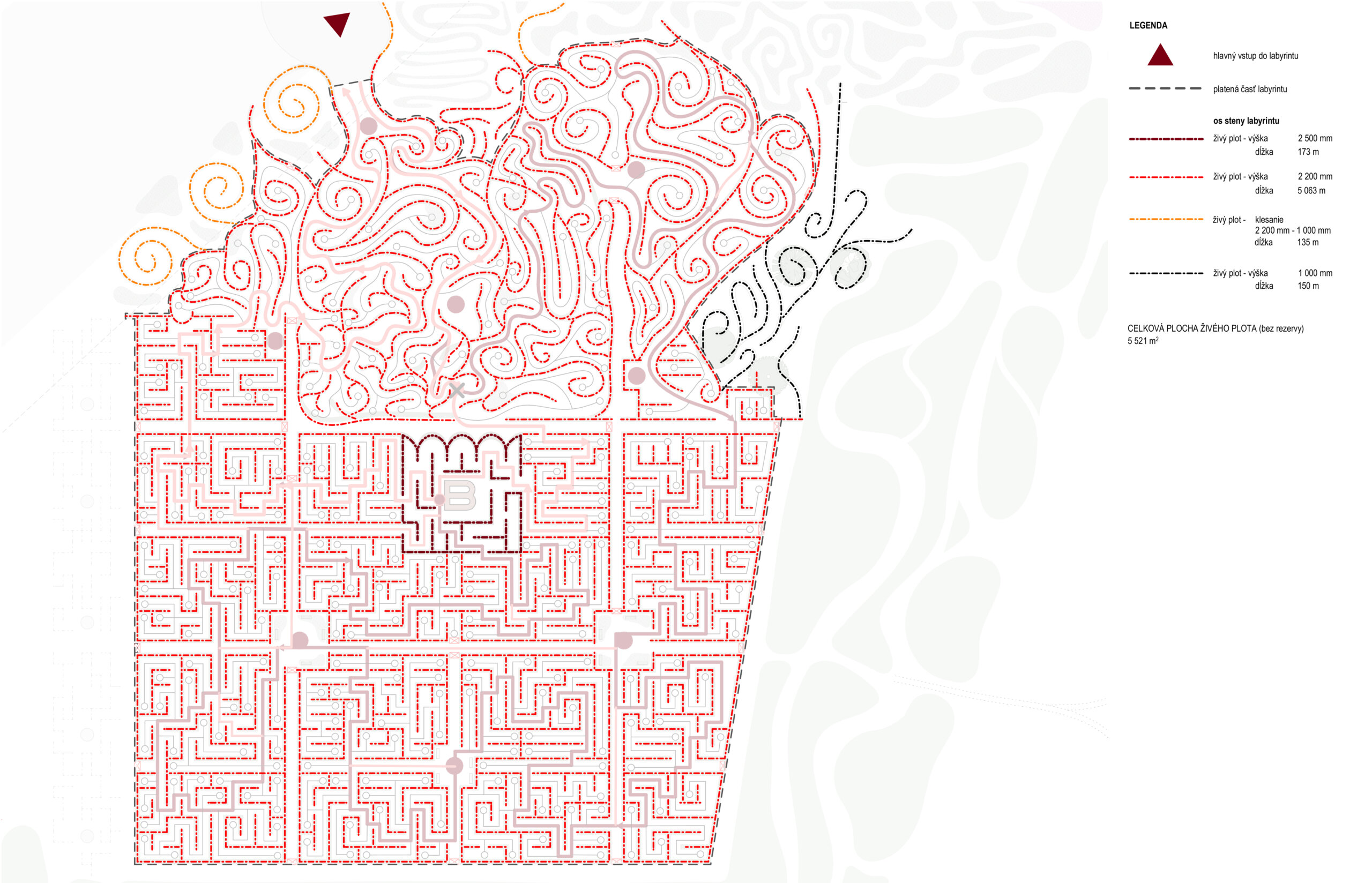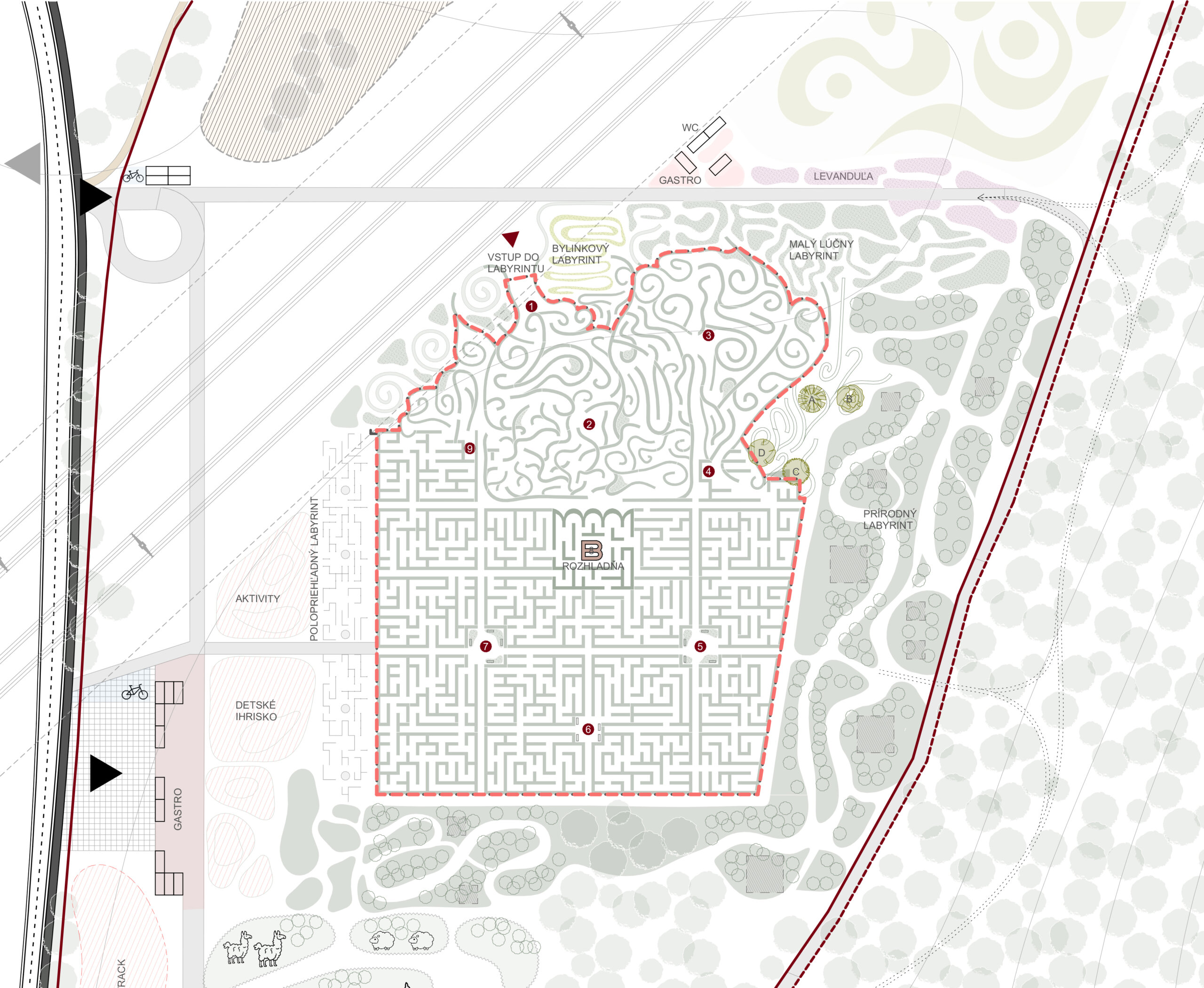 Dominantným prvkom riešeného územia je rozsiahly labyrint zo živého plota, ktorého kompozičným centrom bude rozhľadňa. Tá bude plniť funkciu orientačného bodu v rámci celého areálu a zároveň poskytne návštevníkom miesto oddychu a výhľadu na okolitú krajinu. Priestorové riešenie labyrintu je založené na kombinácii organických a ortogonálnych tvarov, ktoré spolu vytvárajú vyváženú kompozíciu prirodzene pôsobiacich línií a pravidelnej štruktúry, čím vzniká vizuálne aj funkčne zaujímavý priestorový celok. Vstup do labyrintu je situovaný na severnej strane, kde sa nachádza hlavná vstupná brána. Od vstupu sa živý plot postupne znižuje – v úvodnej časti dosahuje výšku približne 1,0 m, čím vytvára prirodzený nástup a vizuálne otvorenie priestoru. S postupom do vnútornej časti labyrintu výška živého plota narastá na 2,2 m, pričom v okolí rozhľadne sa ešte zvyšuje až na 2,4 m, čím sa zdôrazňuje centrálna dominanta a zvyšuje pocit uzavretosti v priestore. Chodníky medzi radmi živých plotov budú mať šírku 1,65 m. V dospelosti sa počíta so šírkou živého plotu 1 m. Vnútorná štruktúra labyrintu pozostáva z jednej hlavnej trasy, doplnenej o deväť tematických stanovíšť, na ktorých budú umiestnené sochy a interaktívne úlohy. Okrem hlavnej trasy je navrhnutá aj kratšia vedľajšia trasa, ktorá umožní alternatívne prechádzanie labyrintom. Z dôvodu bezpečnosti a komfortu návštevníkov sú v priestore labyrintu integrované únikové koridory vybavené bránkami a núdzovým osvetlením,