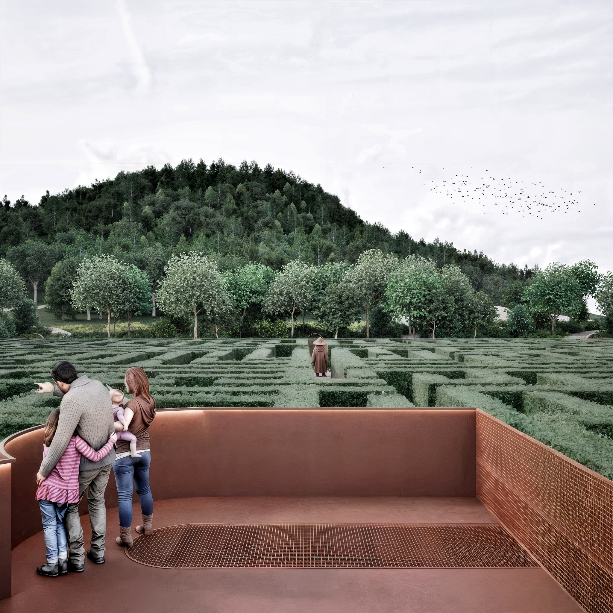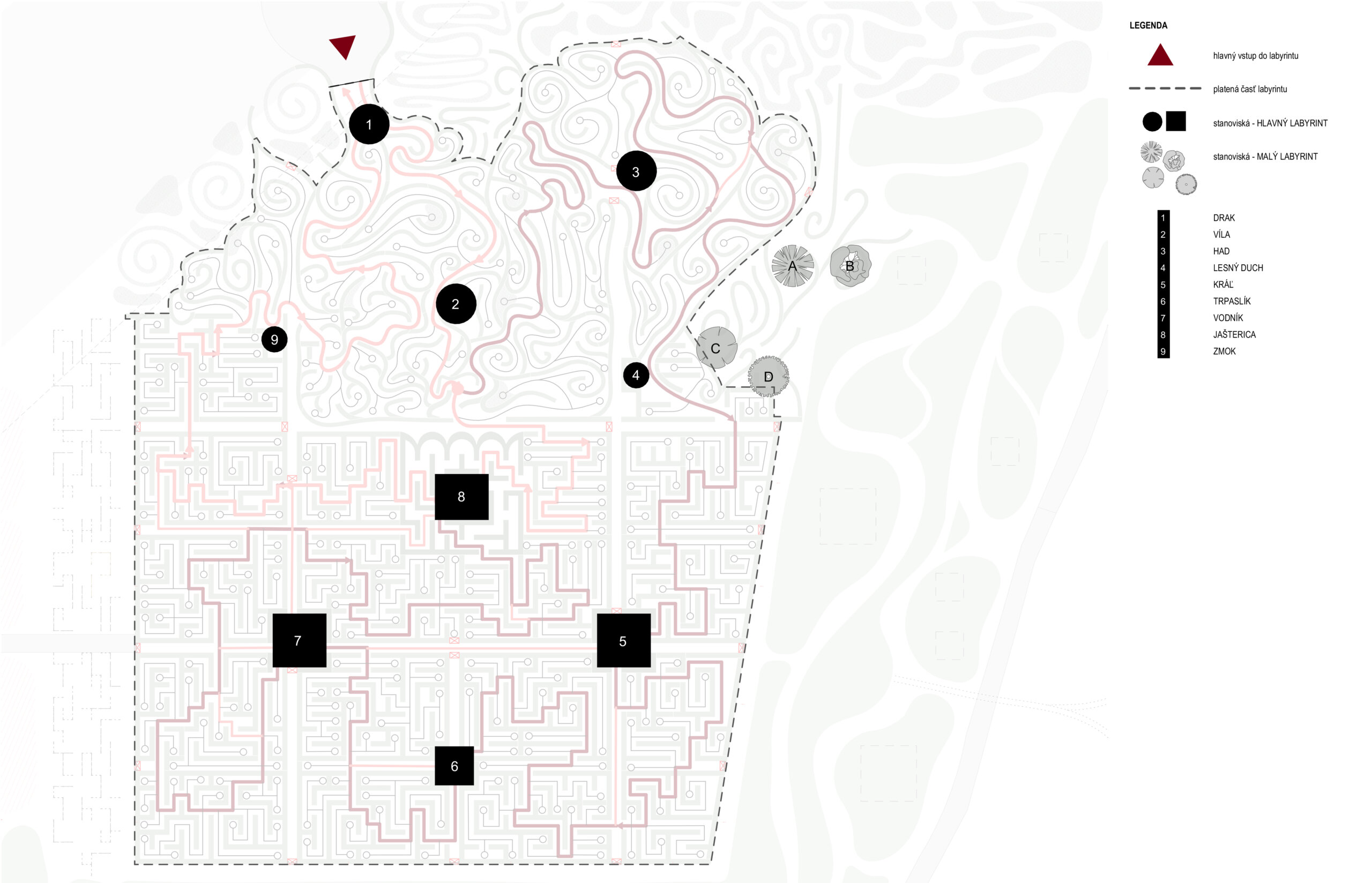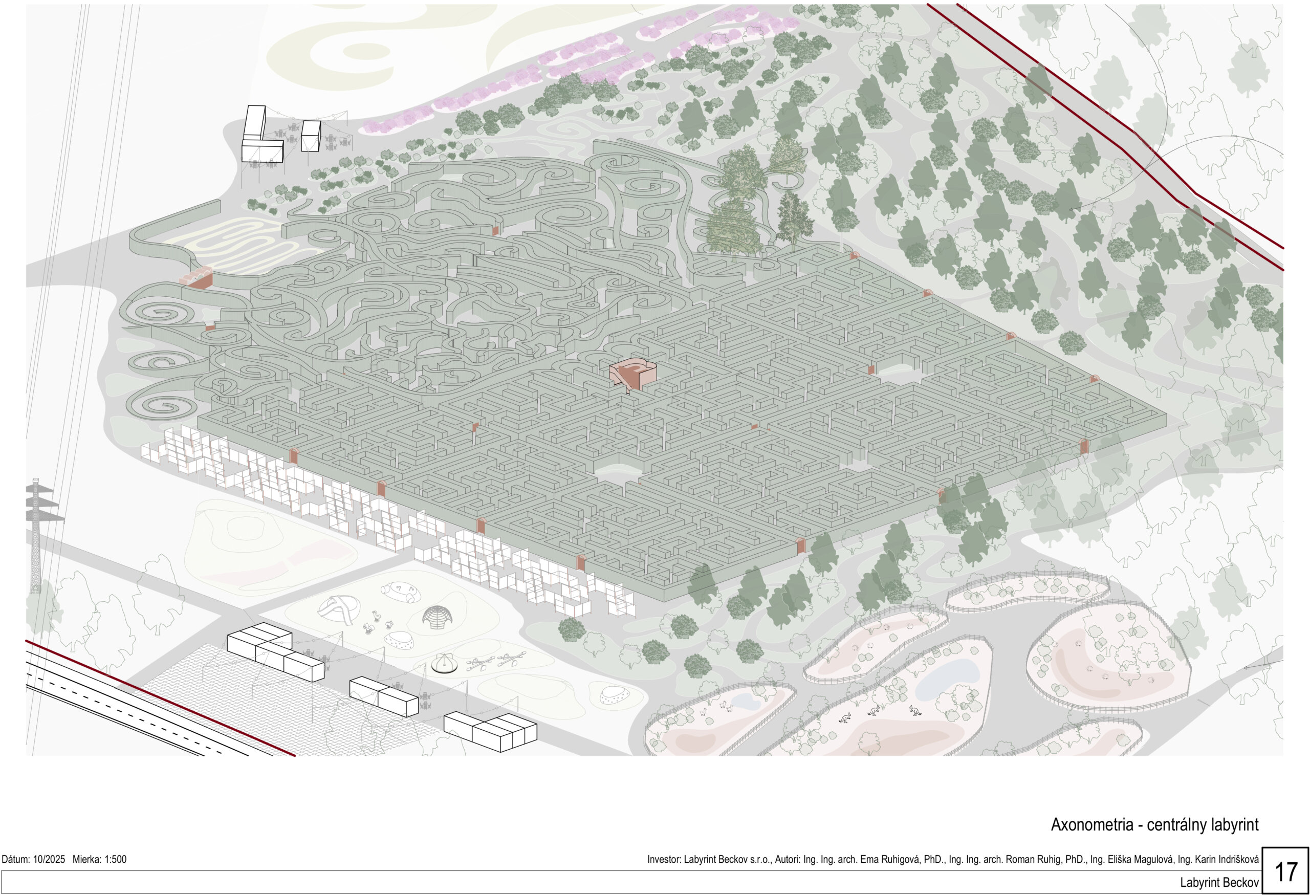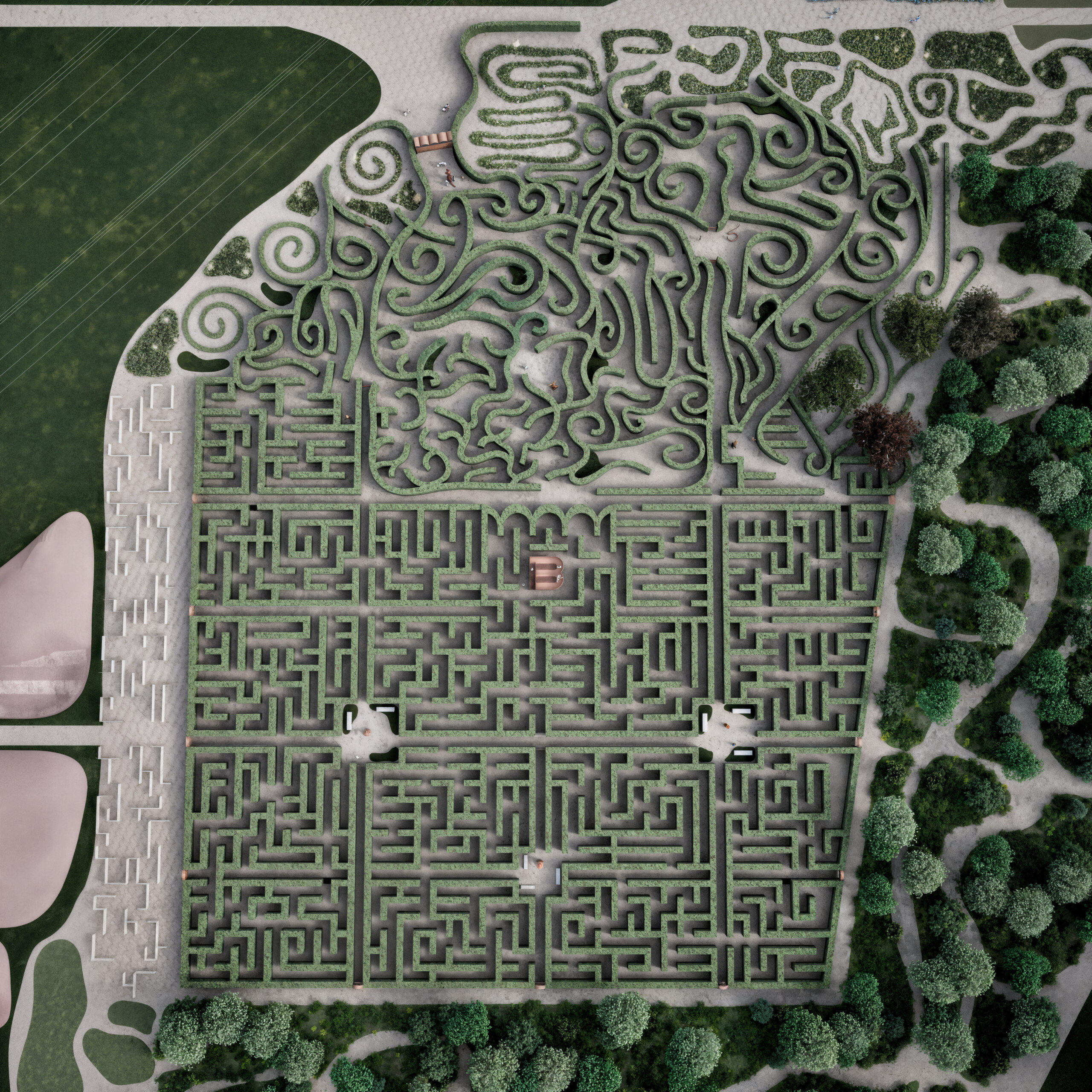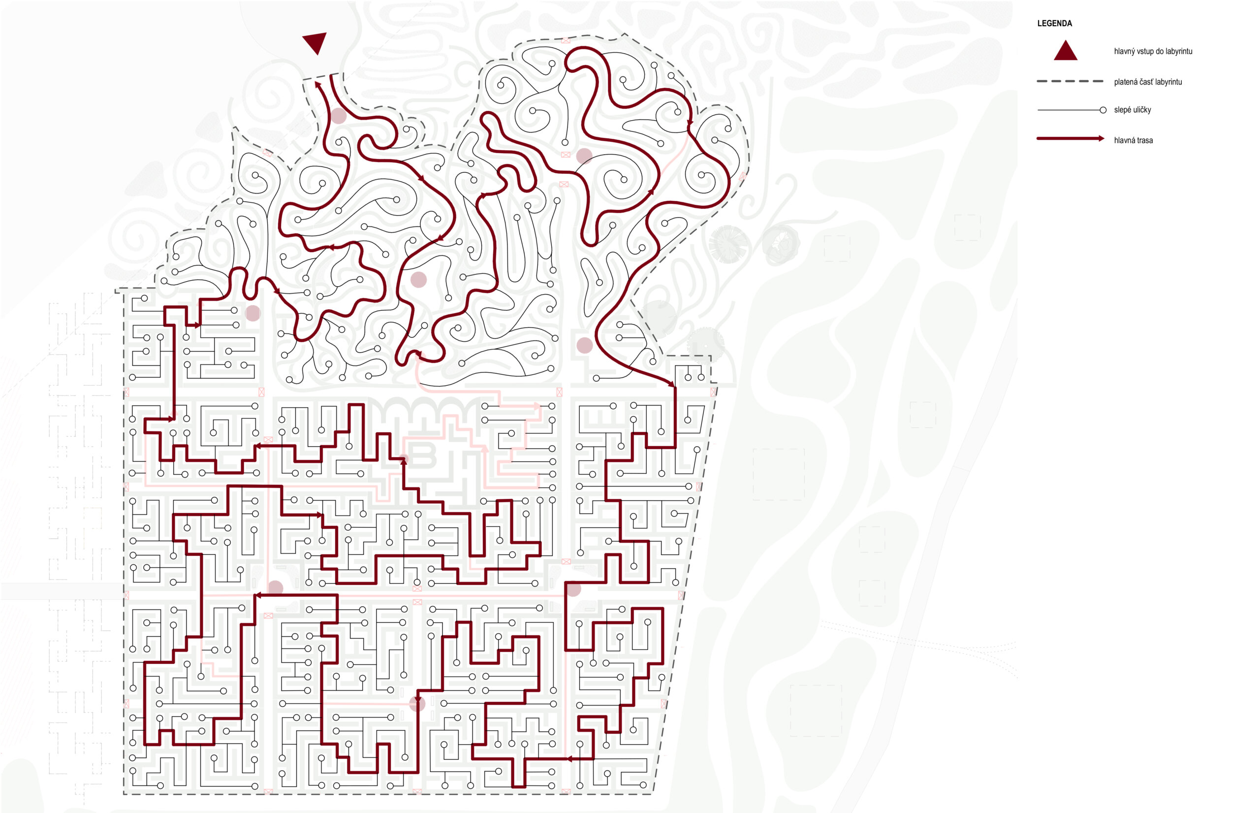 Dominantným prvkom riešeného územia je rozsiahly labyrint zo živého plota, ktorého kompozičným centrom bude rozhľadňa. Tá bude plniť funkciu orientačného bodu v rámci celého areálu a zároveň poskytne návštevníkom miesto oddychu a výhľadu na okolitú krajinu. Priestorové riešenie labyrintu je založené na kombinácii organických a ortogonálnych tvarov, ktoré spolu vytvárajú vyváženú kompozíciu prirodzene pôsobiacich línií a pravidelnej štruktúry, čím vzniká vizuálne aj funkčne zaujímavý priestorový celok. Vstup do labyrintu je situovaný na severnej strane, kde sa nachádza hlavná vstupná brána. Od vstupu sa živý plot postupne znižuje – v úvodnej časti dosahuje výšku približne 1,0 m, čím vytvára prirodzený nástup a vizuálne otvorenie priestoru. S postupom do vnútornej časti labyrintu výška živého plota narastá na 2,2 m, pričom v okolí rozhľadne sa ešte zvyšuje až na 2,4 m, čím sa zdôrazňuje centrálna dominanta a zvyšuje pocit uzavretosti v priestore. Chodníky medzi radmi živých plotov budú mať šírku 1,65 m. V dospelosti sa počíta so šírkou živého plotu 1 m. Vnútorná štruktúra labyrintu pozostáva z jednej hlavnej trasy, doplnenej o deväť tematických stanovíšť, na ktorých budú umiestnené sochy a interaktívne úlohy. Okrem hlavnej trasy je navrhnutá aj kratšia vedľajšia trasa, ktorá umožní alternatívne prechádzanie labyrintom. Z dôvodu bezpečnosti a komfortu návštevníkov sú v priestore labyrintu integrované únikové koridory vybavené bránkami a núdzovým osvetlením,
