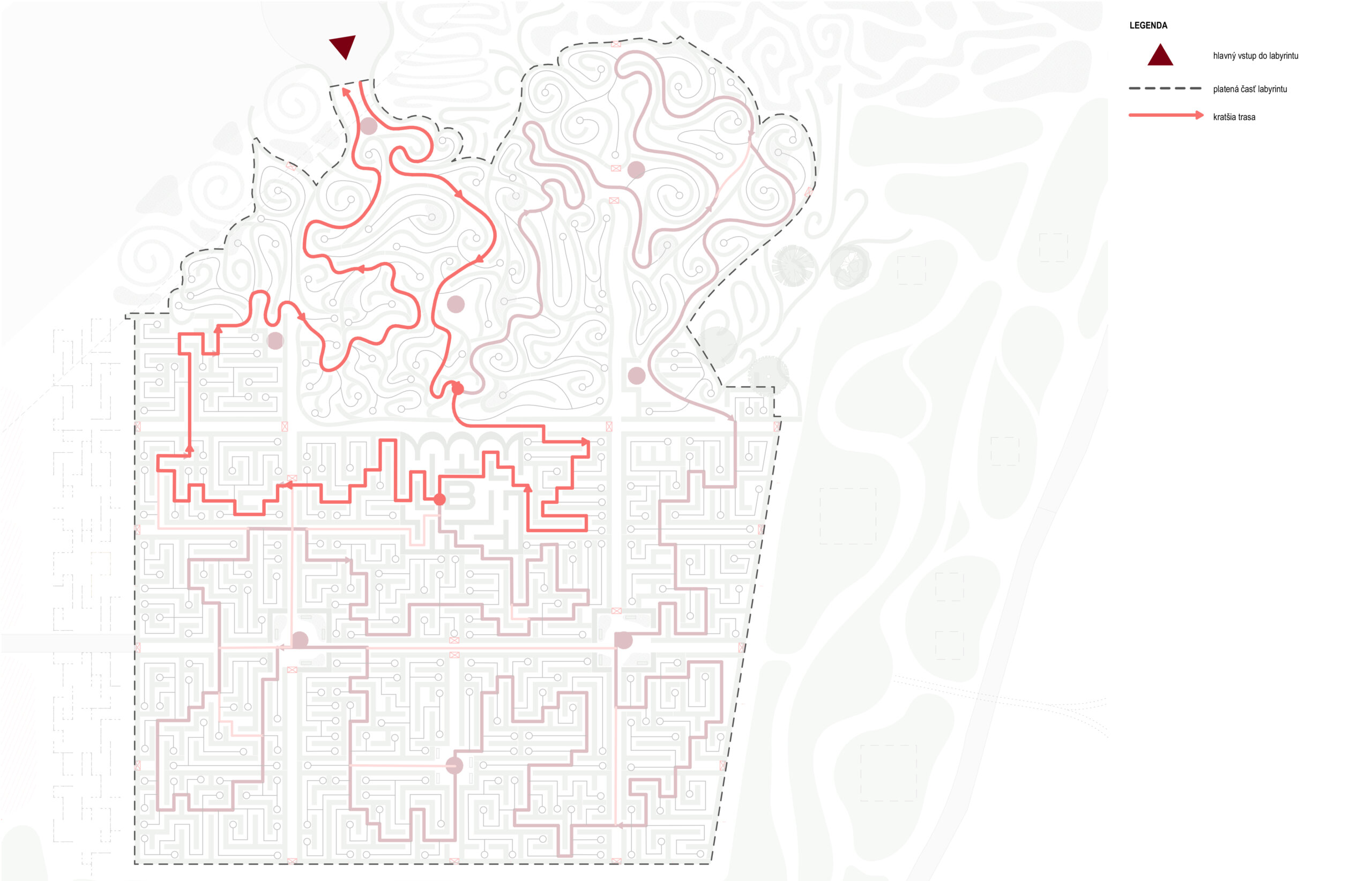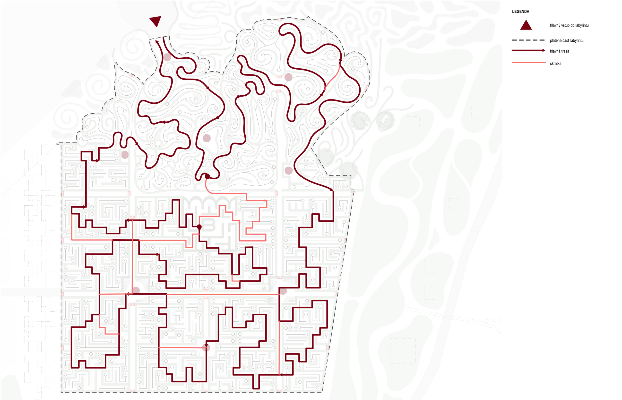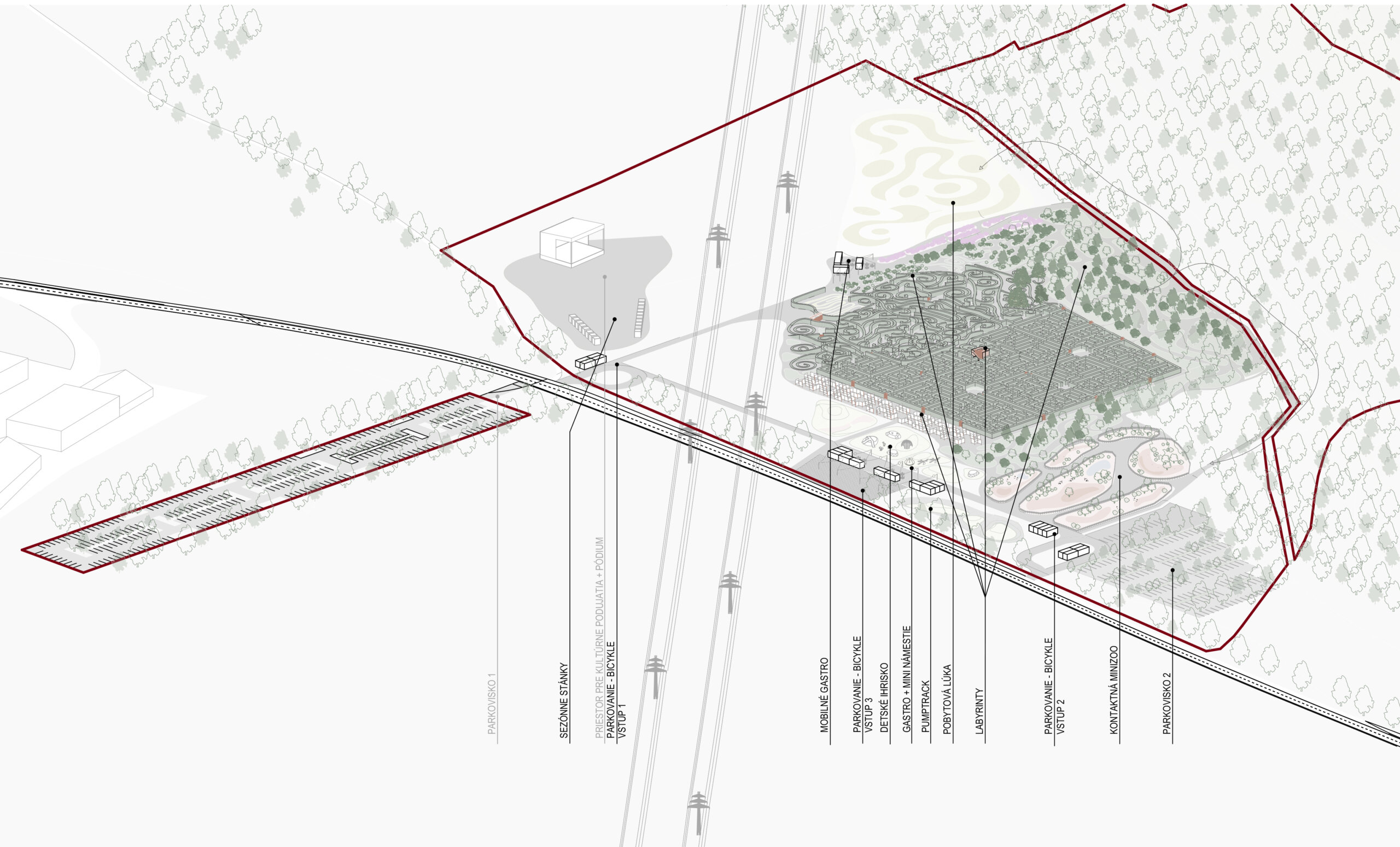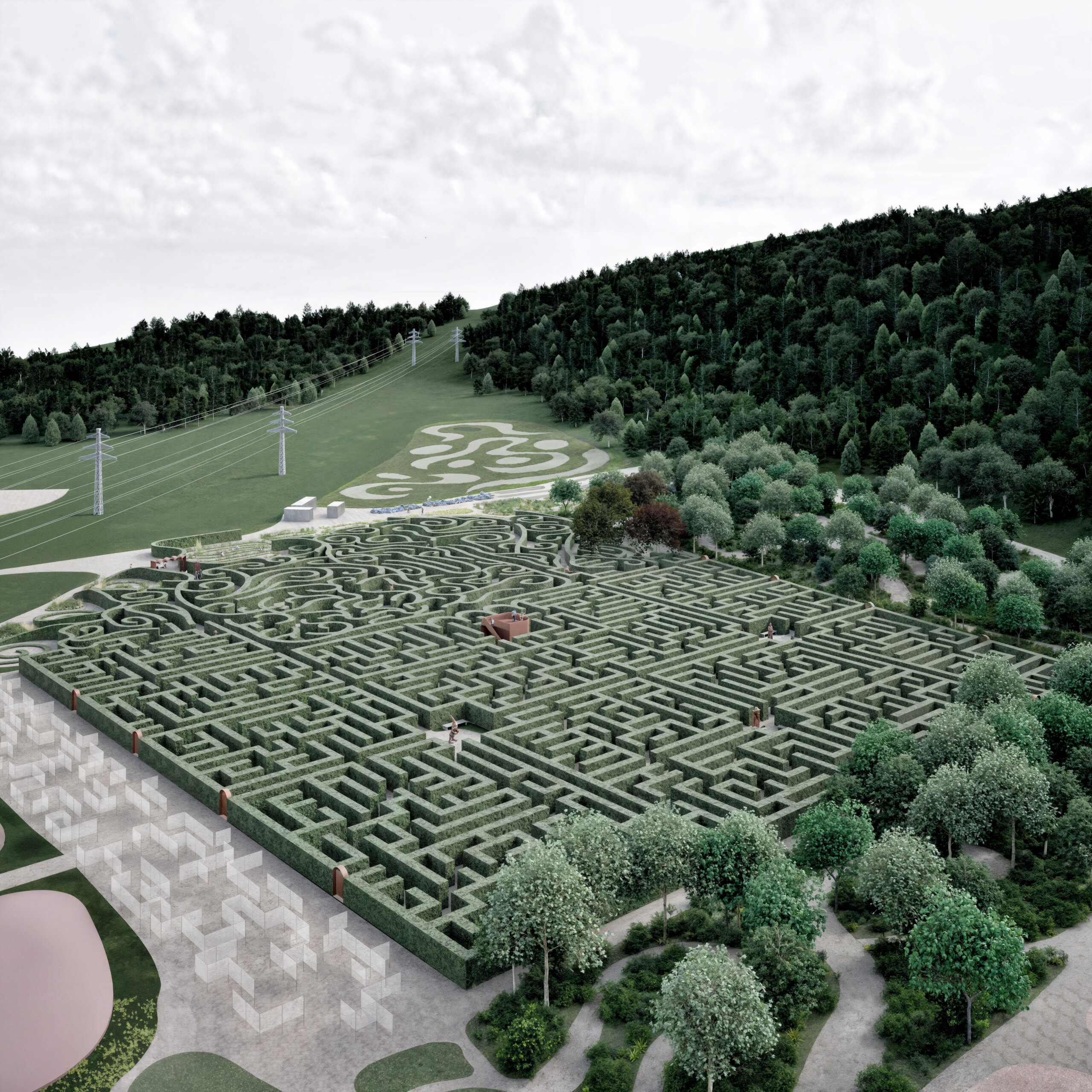 Dominantným prvkom riešeného územia je rozsiahly labyrint zo živého plota, ktorého kompozičným centrom bude rozhľadňa. Tá bude plniť funkciu orientačného bodu v rámci celého areálu a zároveň poskytne návštevníkom miesto oddychu a výhľadu na okolitú krajinu. Priestorové riešenie labyrintu je založené na kombinácii organických a ortogonálnych tvarov, ktoré spolu vytvárajú vyváženú kompozíciu prirodzene pôsobiacich línií a pravidelnej štruktúry, čím vzniká vizuálne aj funkčne zaujímavý priestorový celok. Vstup do labyrintu je situovaný na severnej strane, kde sa nachádza hlavná vstupná brána. Od vstupu sa živý plot postupne znižuje – v úvodnej časti dosahuje výšku približne 1,0 m, čím vytvára prirodzený nástup a vizuálne otvorenie priestoru. S postupom do vnútornej časti labyrintu výška živého plota narastá na 2,2 m, pričom v okolí rozhľadne sa ešte zvyšuje až na 2,4 m, čím sa zdôrazňuje centrálna dominanta a zvyšuje pocit uzavretosti v priestore. Chodníky medzi radmi živých plotov budú mať šírku 1,65 m. V dospelosti sa počíta so šírkou živého plotu 1 m. Vnútorná štruktúra labyrintu pozostáva z jednej hlavnej trasy, doplnenej o deväť tematických stanovíšť, na ktorých budú umiestnené sochy a interaktívne úlohy. Okrem hlavnej trasy je navrhnutá aj kratšia vedľajšia trasa, ktorá umožní alternatívne prechádzanie labyrintom. Z dôvodu bezpečnosti a komfortu návštevníkov sú v priestore labyrintu integrované únikové koridory vybavené bránkami a núdzovým osvetlením,