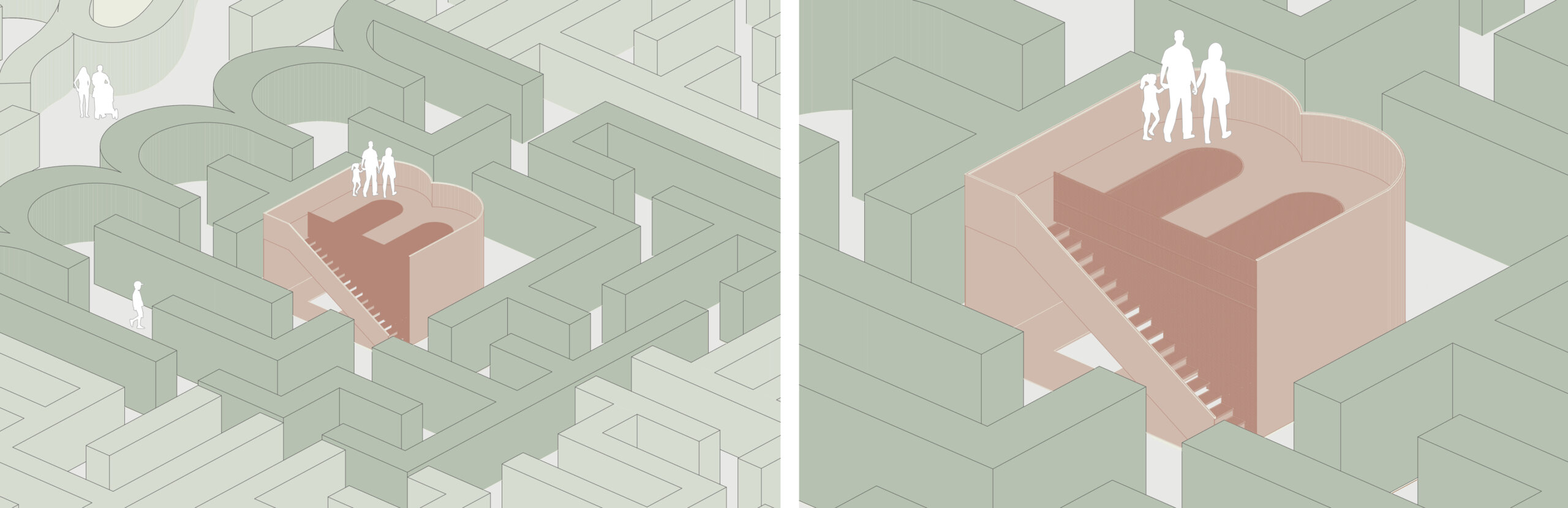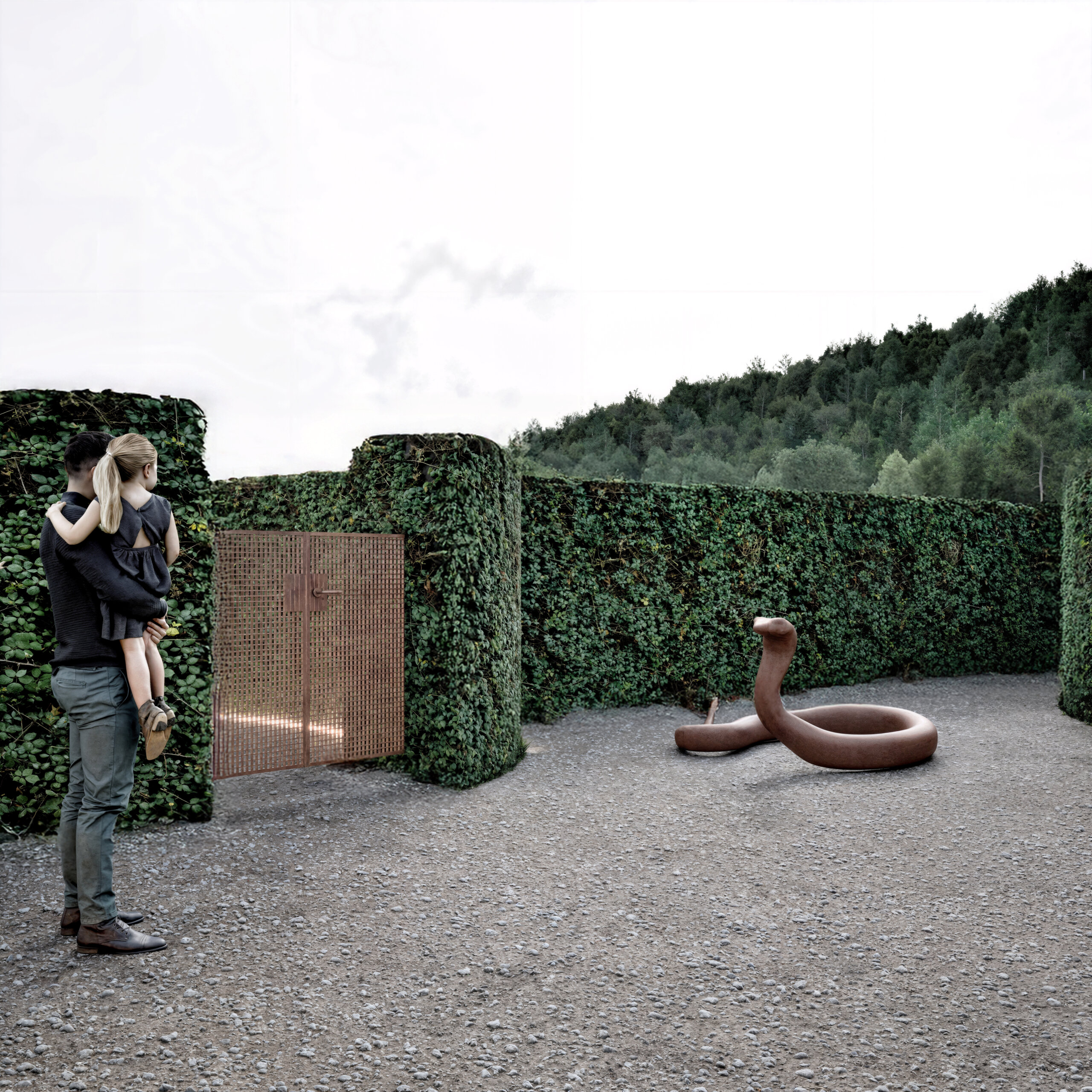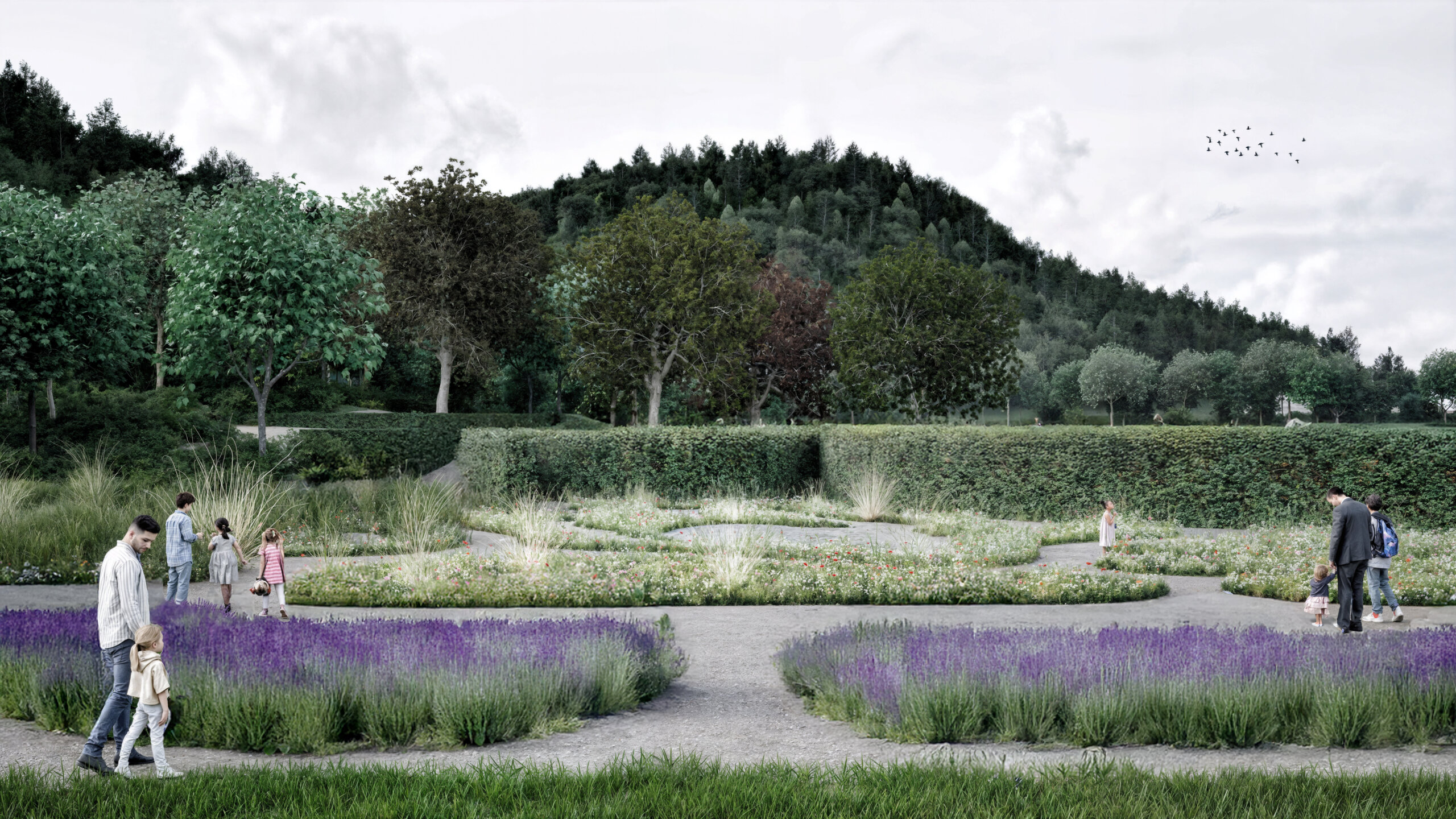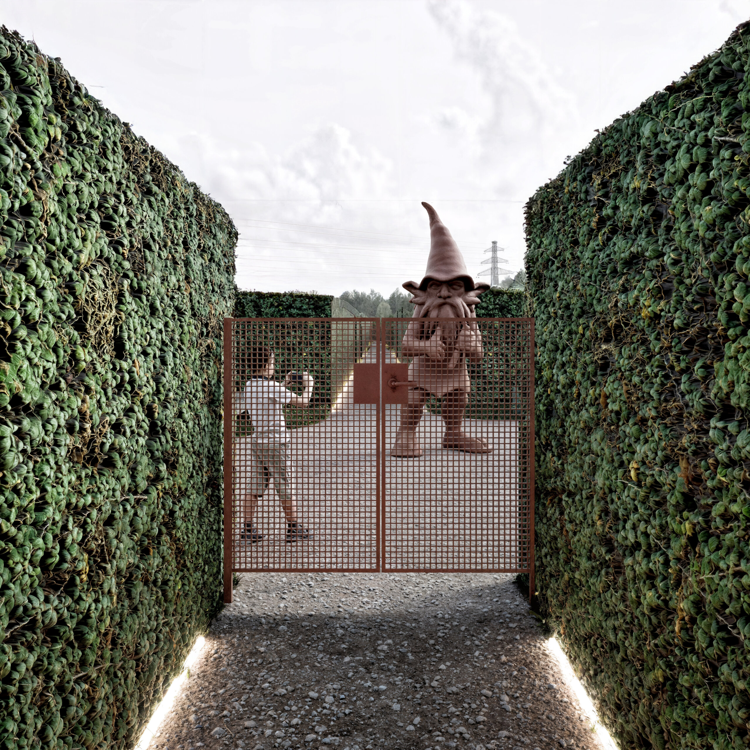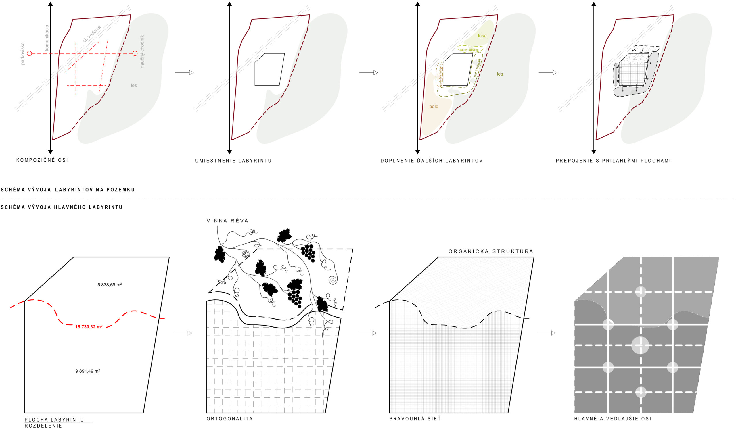 Dominantným prvkom riešeného územia je rozsiahly labyrint zo živého plota, ktorého kompozičným centrom bude rozhľadňa. Tá bude plniť funkciu orientačného bodu v rámci celého areálu a zároveň poskytne návštevníkom miesto oddychu a výhľadu na okolitú krajinu. Priestorové riešenie labyrintu je založené na kombinácii organických a ortogonálnych tvarov, ktoré spolu vytvárajú vyváženú kompozíciu prirodzene pôsobiacich línií a pravidelnej štruktúry, čím vzniká vizuálne aj funkčne zaujímavý priestorový celok. Vstup do labyrintu je situovaný na severnej strane, kde sa nachádza hlavná vstupná brána. Od vstupu sa živý plot postupne znižuje – v úvodnej časti dosahuje výšku približne 1,0 m, čím vytvára prirodzený nástup a vizuálne otvorenie priestoru. S postupom do vnútornej časti labyrintu výška živého plota narastá na 2,2 m, pričom v okolí rozhľadne sa ešte zvyšuje až na 2,4 m, čím sa zdôrazňuje centrálna dominanta a zvyšuje pocit uzavretosti v priestore. Chodníky medzi radmi živých plotov budú mať šírku 1,65 m. V dospelosti sa počíta so šírkou živého plotu 1 m. Vnútorná štruktúra labyrintu pozostáva z jednej hlavnej trasy, doplnenej o deväť tematických stanovíšť, na ktorých budú umiestnené sochy a interaktívne úlohy. Okrem hlavnej trasy je navrhnutá aj kratšia vedľajšia trasa, ktorá umožní alternatívne prechádzanie labyrintom. Z dôvodu bezpečnosti a komfortu návštevníkov sú v priestore labyrintu integrované únikové koridory vybavené bránkami a núdzovým osvetlením,