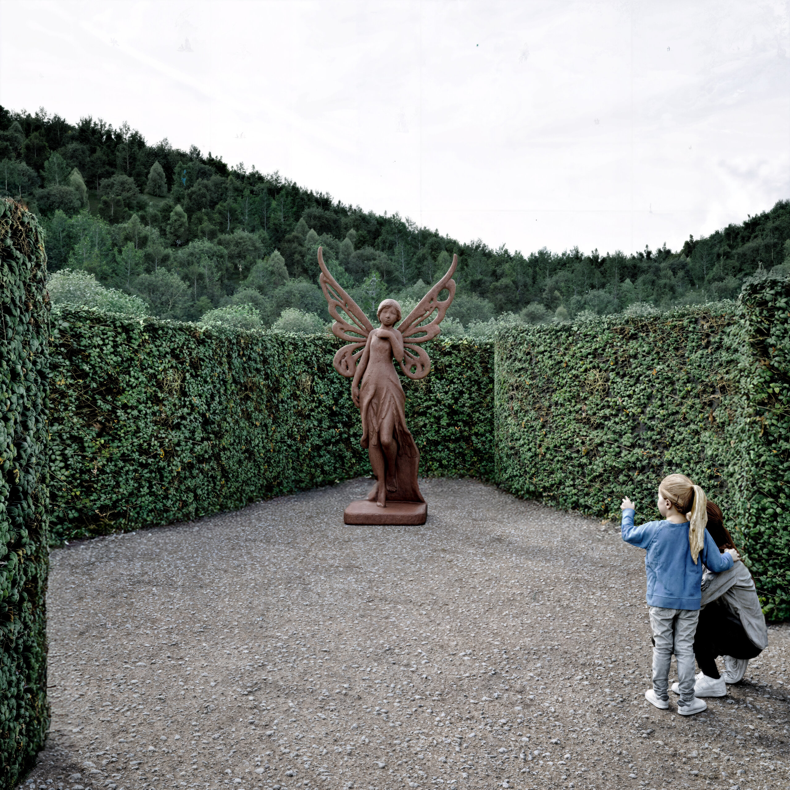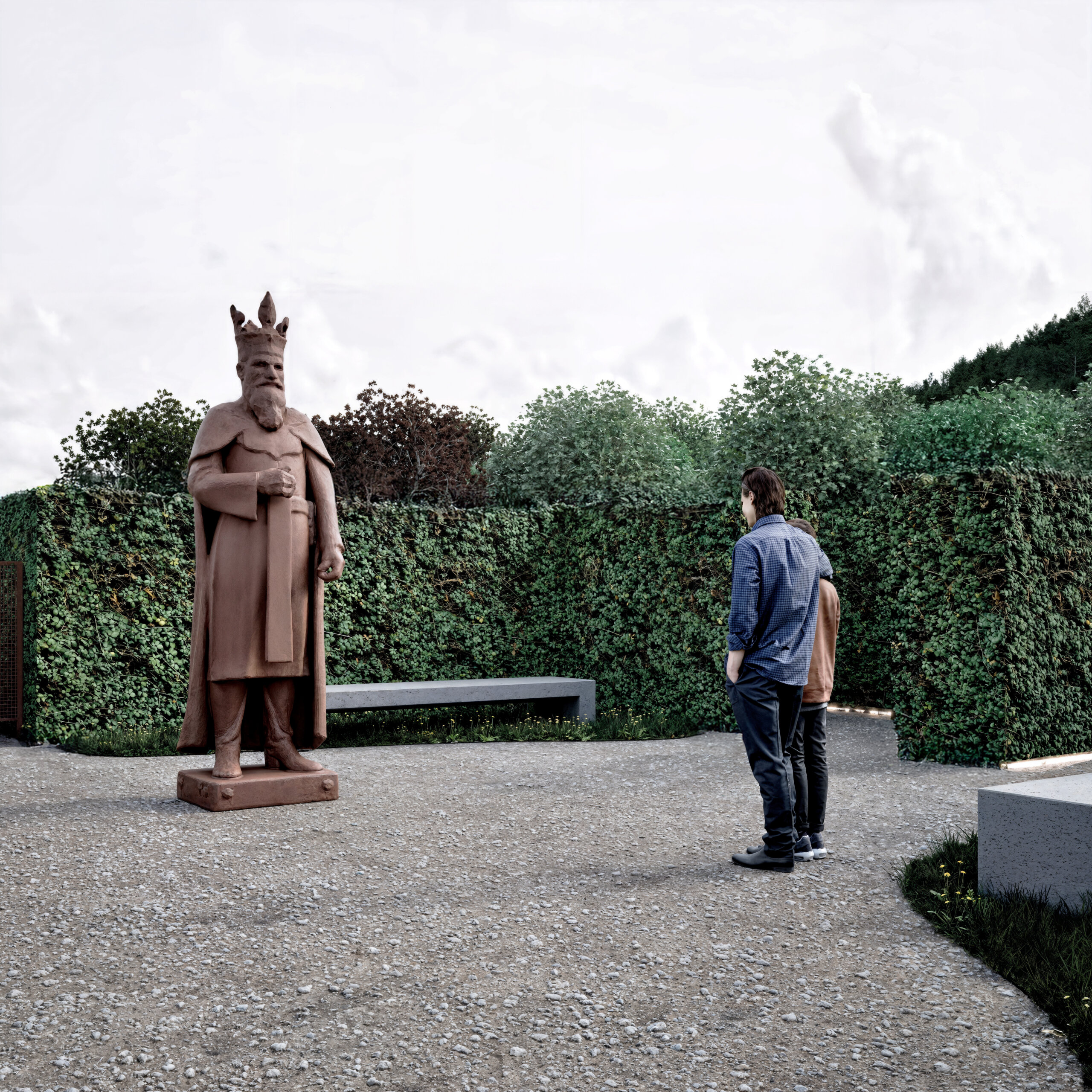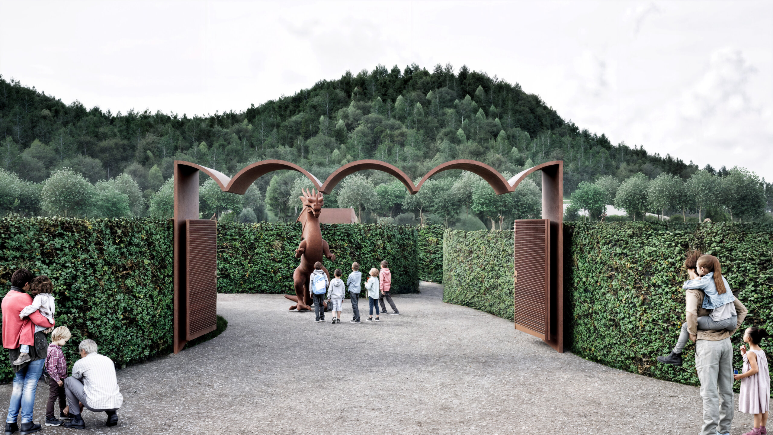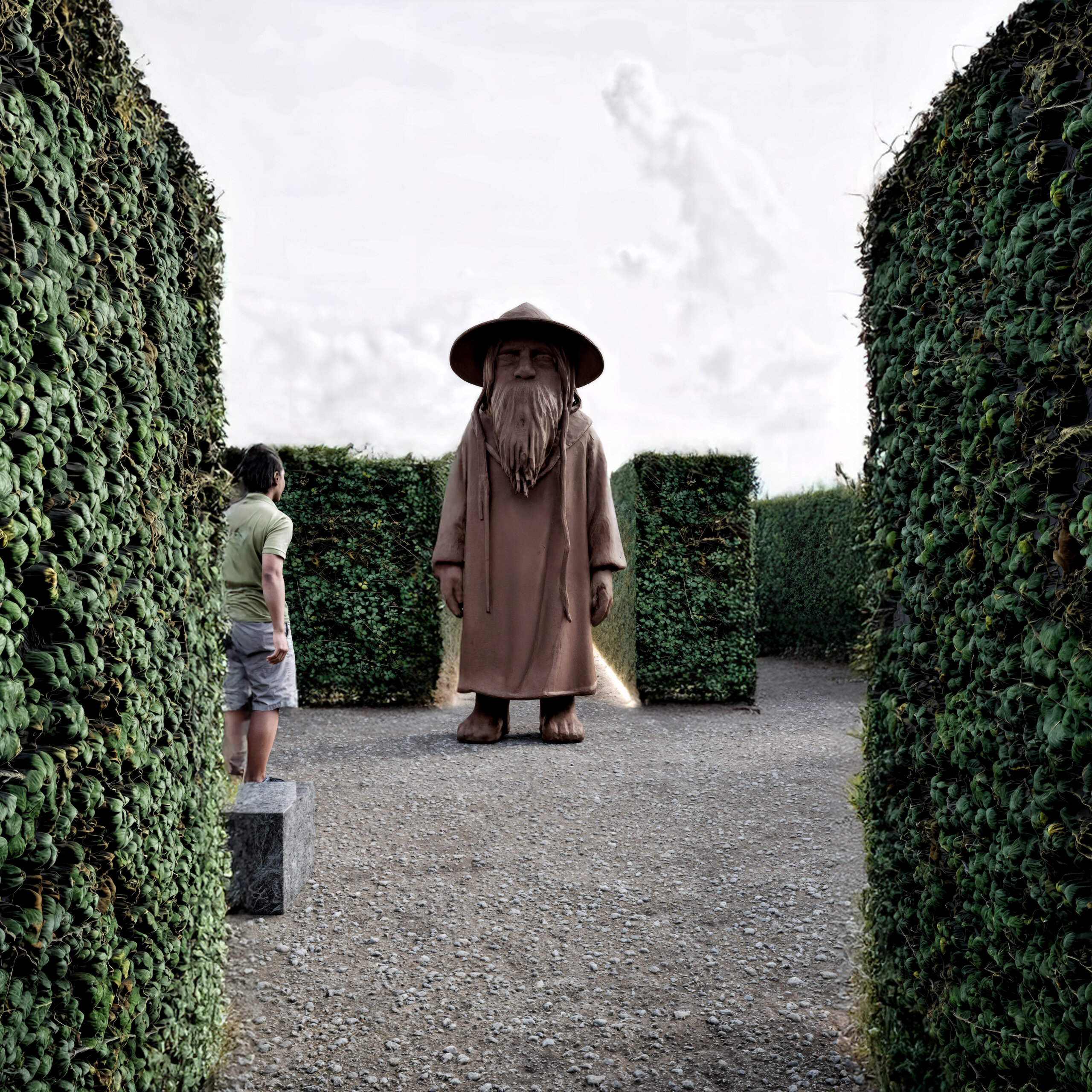 Dominantným prvkom riešeného územia je rozsiahly labyrint zo živého plota, ktorého kompozičným centrom bude rozhľadňa. Tá bude plniť funkciu orientačného bodu v rámci celého areálu a zároveň poskytne návštevníkom miesto oddychu a výhľadu na okolitú krajinu. Priestorové riešenie labyrintu je založené na kombinácii organických a ortogonálnych tvarov, ktoré spolu vytvárajú vyváženú kompozíciu prirodzene pôsobiacich línií a pravidelnej štruktúry, čím vzniká vizuálne aj funkčne zaujímavý priestorový celok. Vstup do labyrintu je situovaný na severnej strane, kde sa nachádza hlavná vstupná brána. Od vstupu sa živý plot postupne znižuje – v úvodnej časti dosahuje výšku približne 1,0 m, čím vytvára prirodzený nástup a vizuálne otvorenie priestoru. S postupom do vnútornej časti labyrintu výška živého plota narastá na 2,2 m, pričom v okolí rozhľadne sa ešte zvyšuje až na 2,4 m, čím sa zdôrazňuje centrálna dominanta a zvyšuje pocit uzavretosti v priestore. Chodníky medzi radmi živých plotov budú mať šírku 1,65 m. V dospelosti sa počíta so šírkou živého plotu 1 m. Vnútorná štruktúra labyrintu pozostáva z jednej hlavnej trasy, doplnenej o deväť tematických stanovíšť, na ktorých budú umiestnené sochy a interaktívne úlohy. Okrem hlavnej trasy je navrhnutá aj kratšia vedľajšia trasa, ktorá umožní alternatívne prechádzanie labyrintom. Z dôvodu bezpečnosti a komfortu návštevníkov sú v priestore labyrintu integrované únikové koridory vybavené bránkami a núdzovým osvetlením,