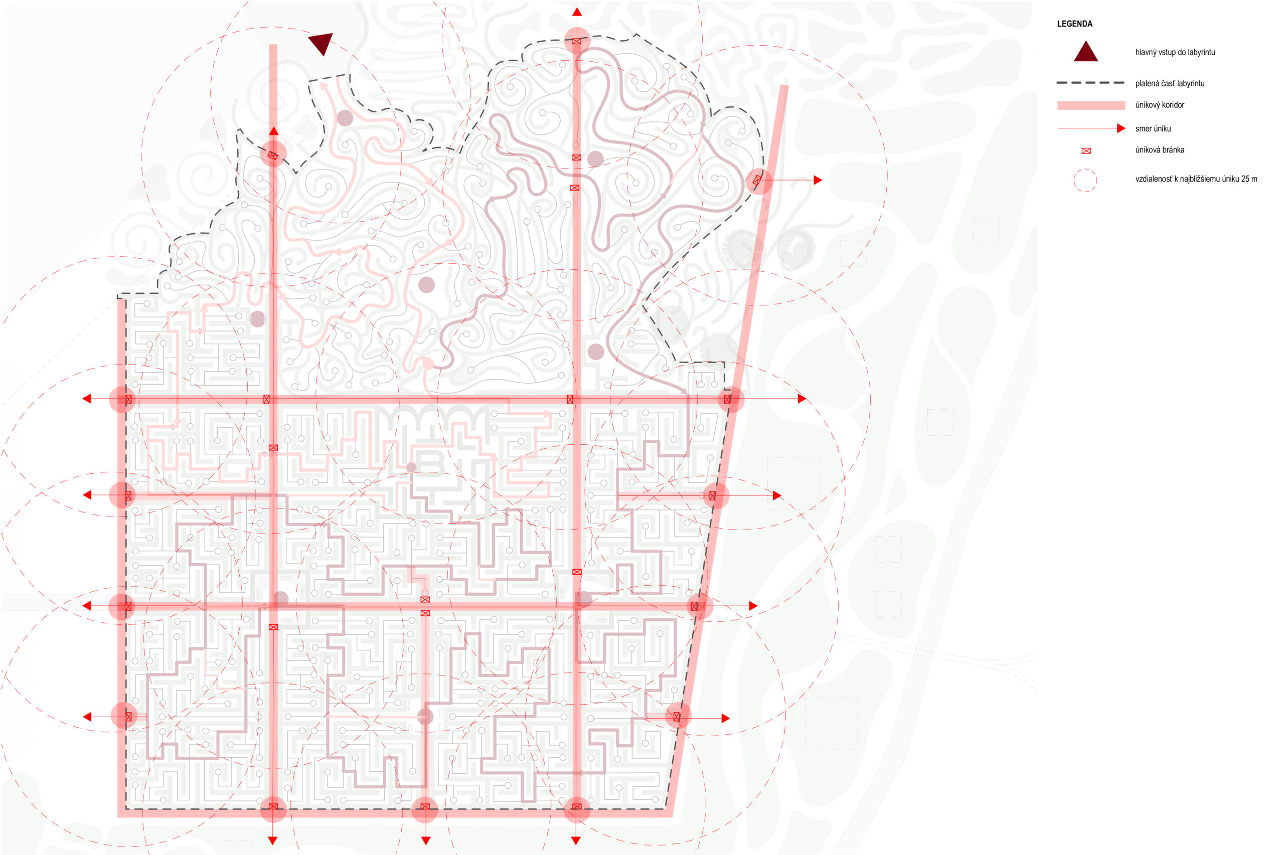 ktoré umožnia rýchly výstup z areálu v prípade potreby. Prevádzka labyrintu bude riešená ako spoplatnená zóna areálu, do ktorej bude umožnený vstup na základe platnej vstupenky zakúpenej v pokladni alebo prostredníctvom samoobslužného systému.