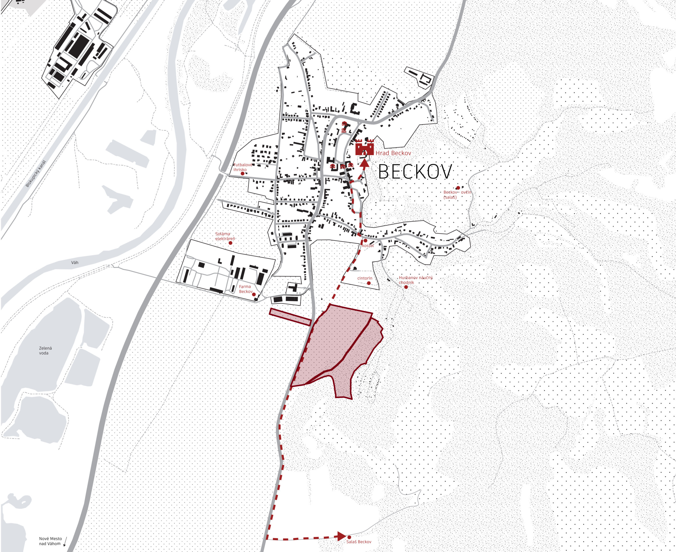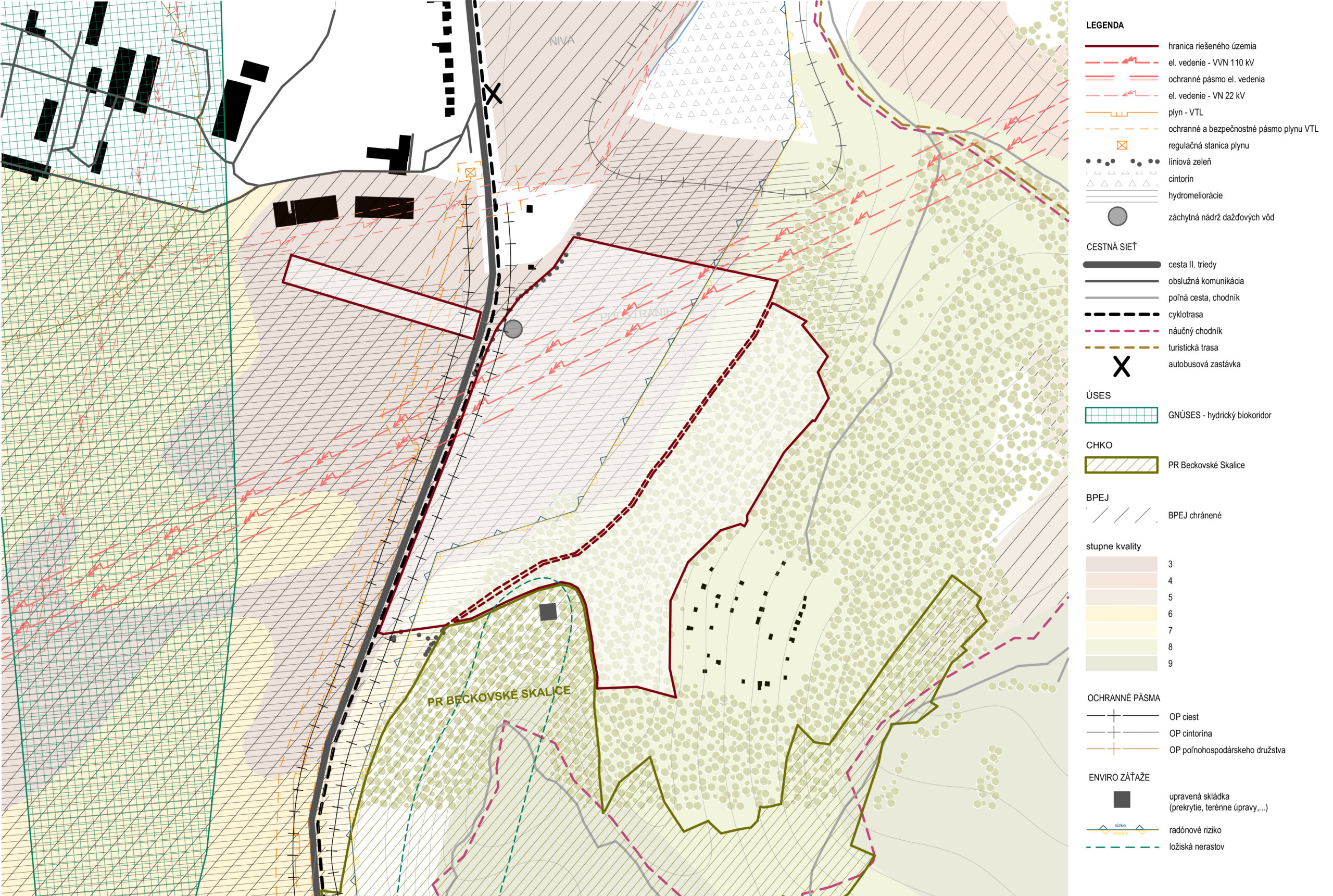 Územie sa nachádza v katastrálnom území obce Beckov, okres Nové Mesto nad Váhom. Podľa platného územného plánu obce je väčšina riešeného územia evidovaná ako orná pôda, pričom v niektorých častiach sa vyskytuje nelesná drevinná vegetácia. Pozemky majú priamy prístup na hlavnú cestnú komunikáciu prechádzajúcu obcou, popri ktorej sa plánuje výstavba novej cyklotrasy. Celková výmera riešeného územia predstavuje približne 108 303 m². Väčšina pozemkov je rovinatá a zatrávnená, v niektorých častiach sa nachádza strmší terén s vysokou zeleňou, ktorá zostane zachovaná. Návrh zón vychádza z požiadavky logickej previazanosti jednotlivých funkčných častí územia tak, aby tvorili ucelený a funkčný celok. Zároveň zohľadňuje charakter okolitého prostredia, existujúcu urbanistickú štruktúru a technické, prírodné či regulačné limity v území. Jednotlivé zóny sú navrhnuté s dôrazom na vzájomné prepojenie, ako aj na primeranú mierku a citlivé zasadenie do krajiny. Dôležitou súčasťou návrhu bolo zohľadnenie existujúcich obmedzení, najmä nadzemného elektrického vedenia vysokého napätia, ktoré prechádza riešeným územím. S tým súvisí aj ochranné pásmo, ktoré obmedzuje využitie časti pozemkov. Návrh je spracovaný tak, aby rešpektoval tieto limity, spĺňal technické požiadavky a zároveň efektívne využil dostupný priestor.