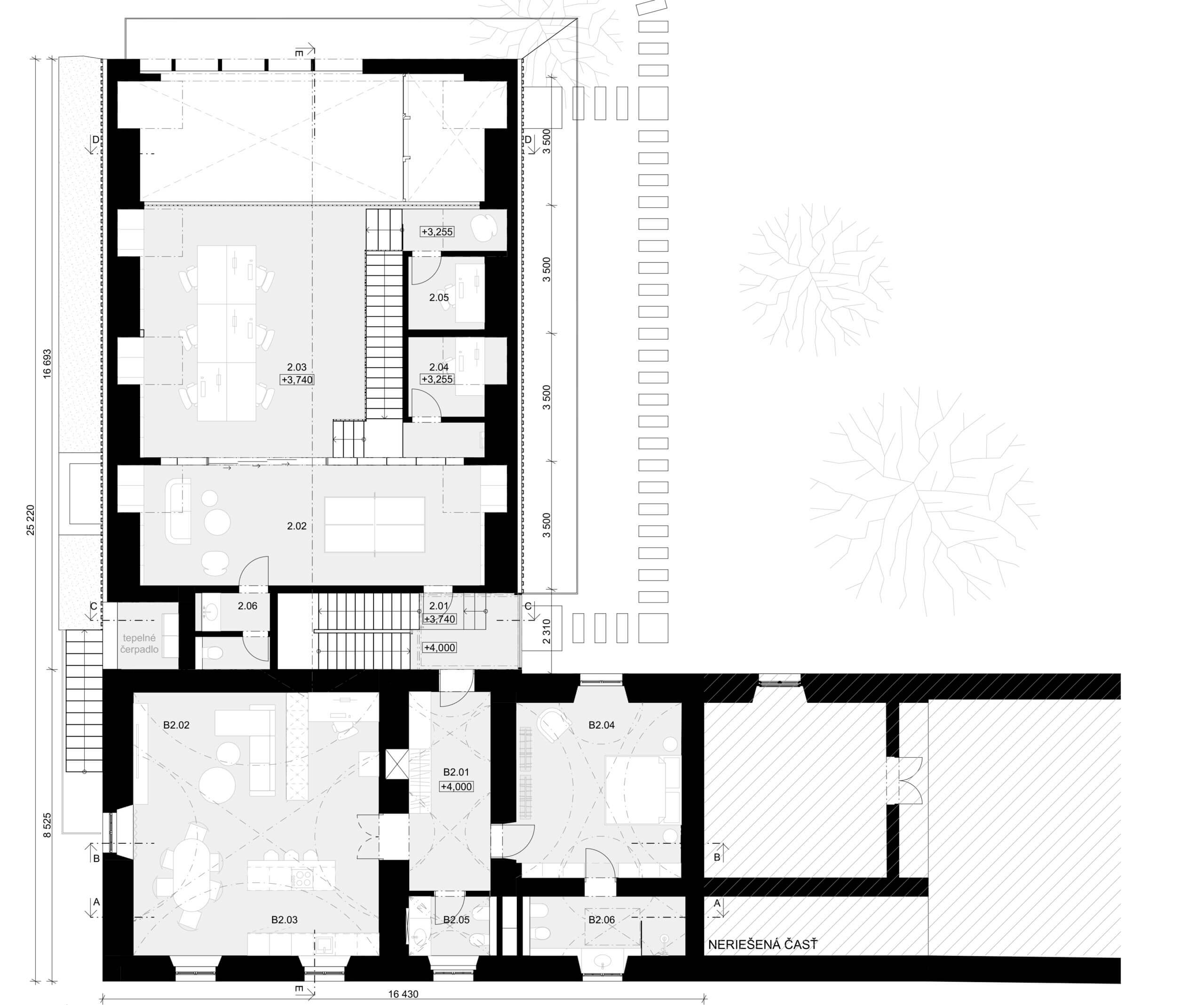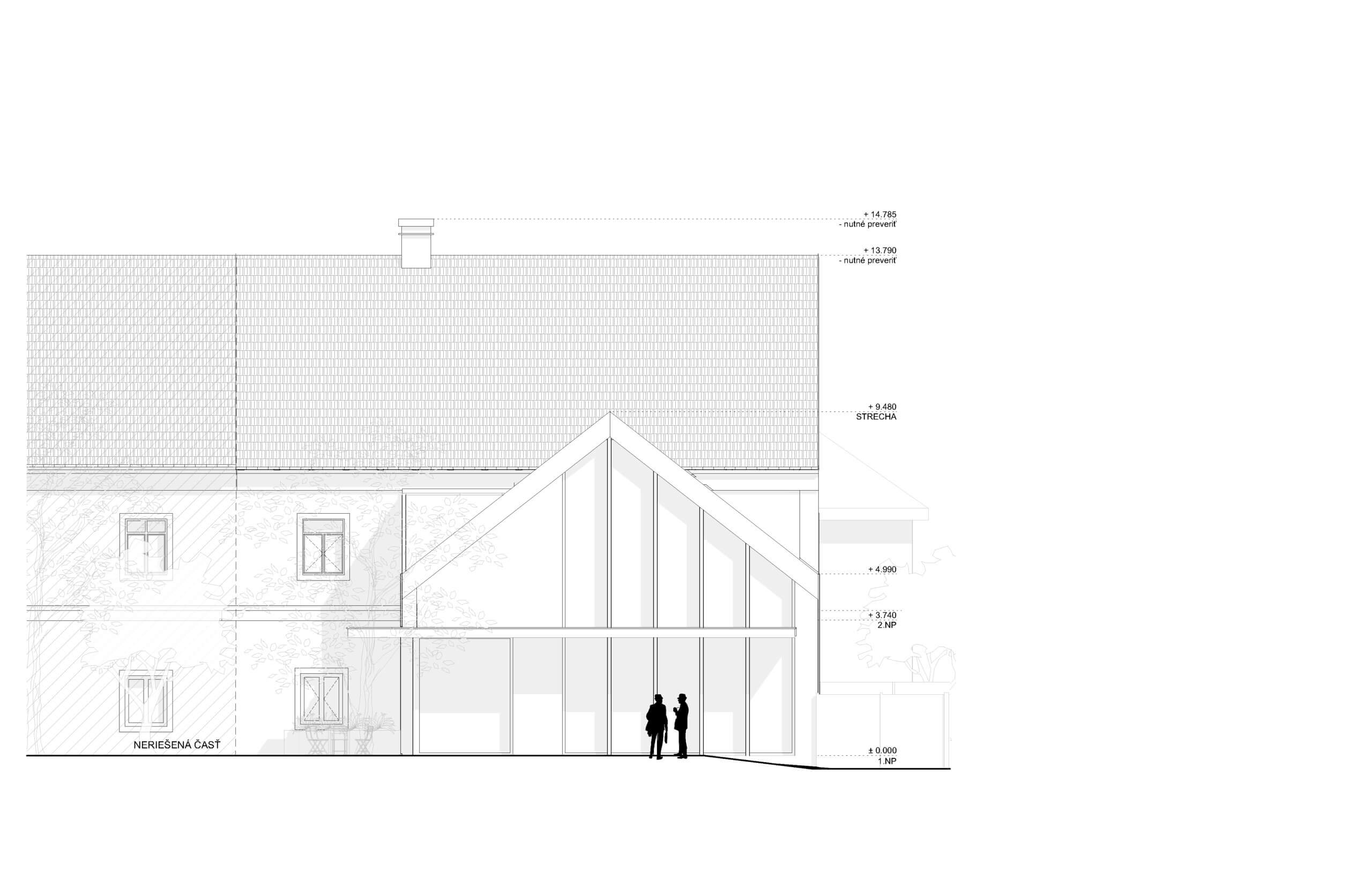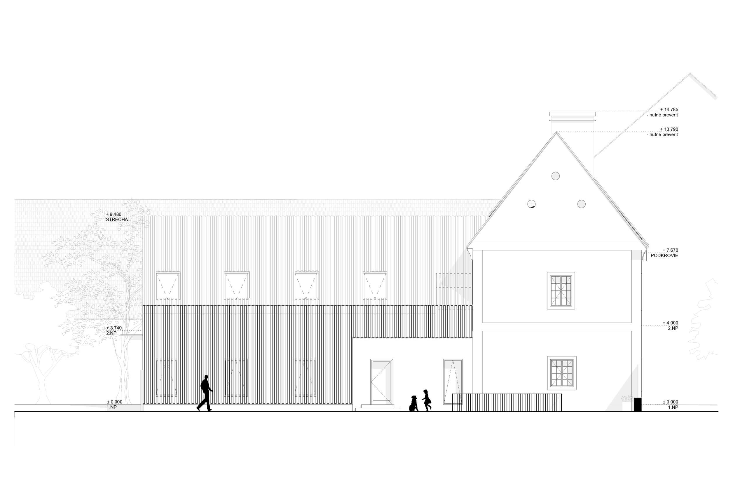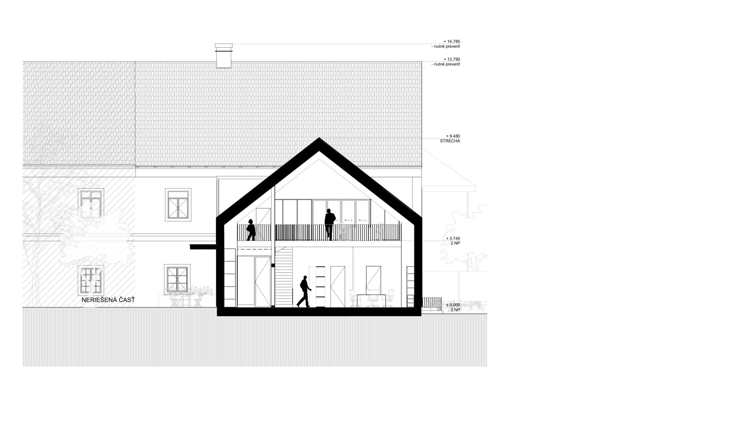 V mieste pôvodných prístavieb je navrhnutý novotvar novej prístavby. Ten rešpektuje pôvodné nosné murivá a pristavuje sa s novou nosnou konštrukciou. V mieste styku prístavby a pôvodného objektu je navrhnuté schodisko, ktoré bude slúžiť na prístup do apartmánu na 2.NP pôvodného objektu a aj ako prístup na 2. poschodie do priestorov kancelárie. Daný styk je vyriešený preskleným kubusom, ktorý sa nachádza v mieste pôvodného murovaného kubusu. Od súkromného pozemku investora je navrhnutý vedľajší vstup do súkromnej kancelárie, ktorú bude v jeho užívaní. Z predmetnej kancelárie je možný prístup do kuchynky, samostatného WC s predsienkou a serverovne, z ktorej bude ďalej prístup do miestnosti pre upratovačku umiestnenej pod schodmi. V rámci kancelárie je navrhnutá menšie printová zóna. Zo súkromnej kancelárie bude prístup do hlavného kancelárskeho priestor „open space“. Do tejto kancelárie je hlavý vstup orientovaný z nádvoria cez zádverie. Zo zádveria je možný aj priamy vstup do menšej zasadacej miestnosti, cez ktorú je ďalej možný prístup do kuchynky. Kuchynka ako aj zasadacie miestnosť je prechodná a prístupná aj priamo z exteriéru, kde pred týmito priestormi sa bude nachádzať spoločná terasa. Kuchynka bude prístupná aj zo zádveria, kde sa bude nachádzať schodisko z dôvodu lepšieho prístupu z kancelárie na druhom poschodí. V spoločnej kancelárii „open space“ bude priestor členený na viacero zón: 1. zóna pre návštevy, v ktorej sa bude nachádzať pohovka s konferenčným stolíkom, 2. zóna na prácu, kde sú navrhnuté kancelárske stoly so sedením, 3. printová zóna, kde je umiestnená tlačiareň, úložné priestory, archív. Nad touto zónou sa bude nachádzať schodisko, cez ktoré bude prístupné druhý „open space“ na druhom poschodí. K danej kancelárii prislúcha unisex WC s predsieňou.