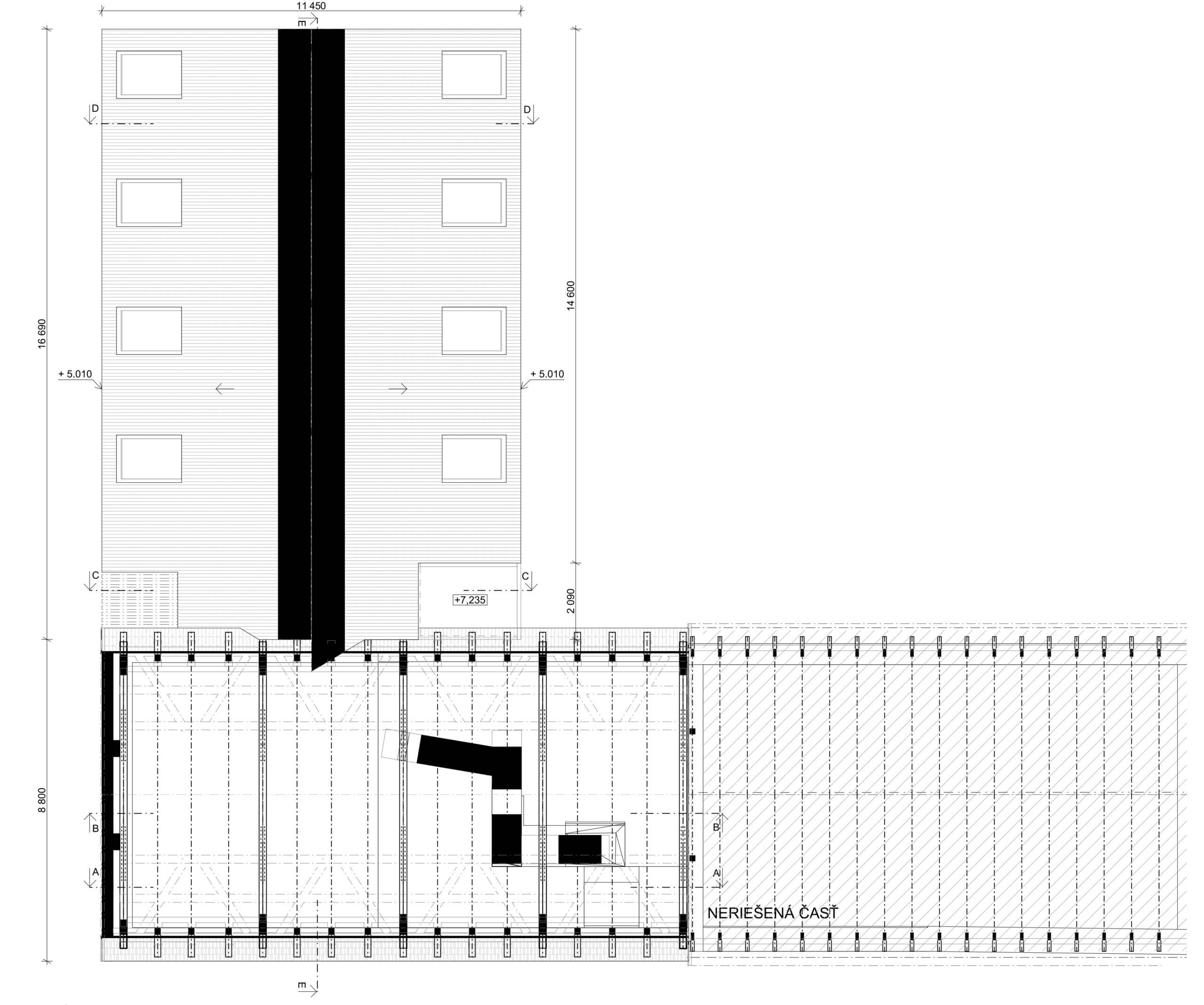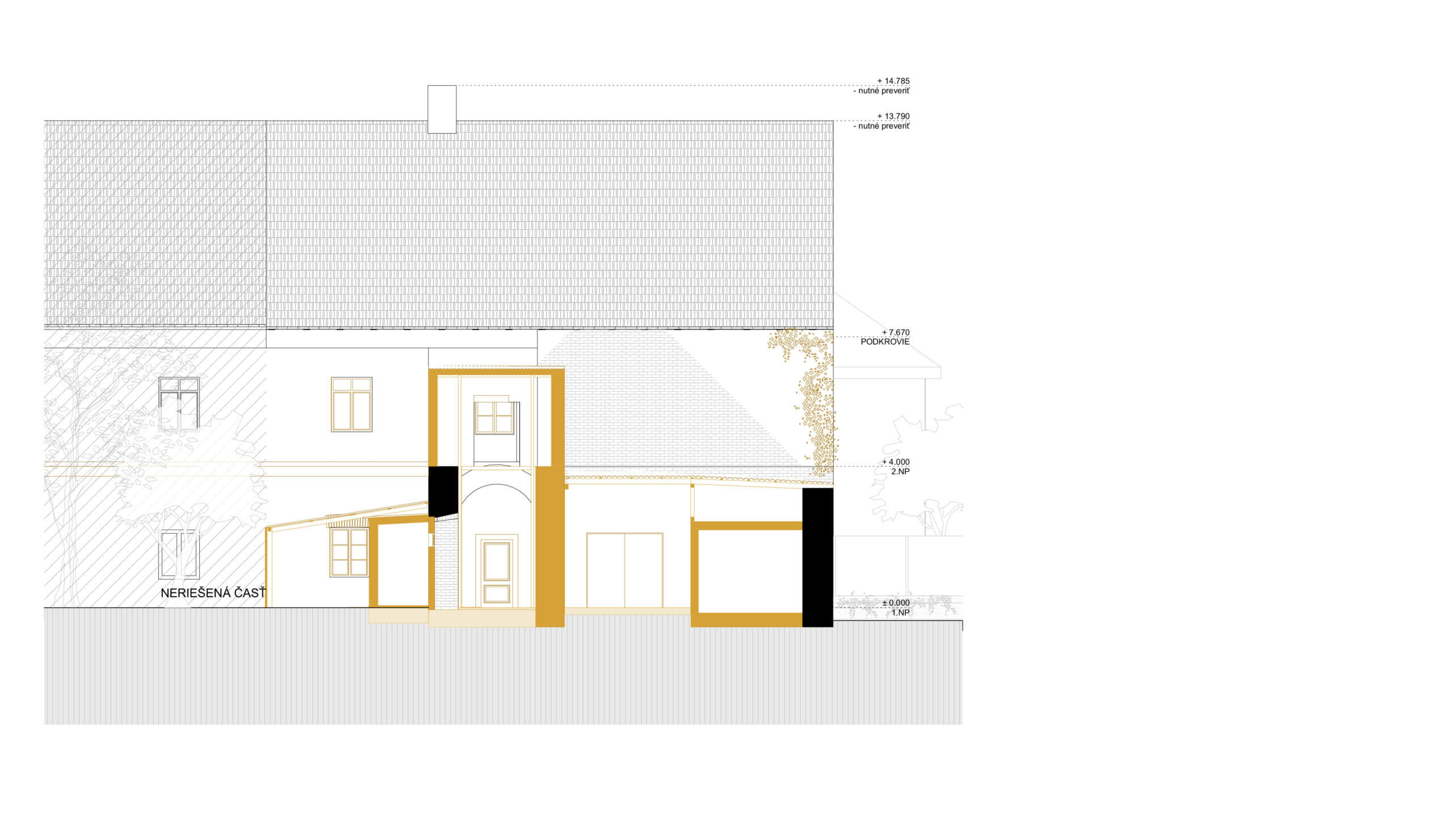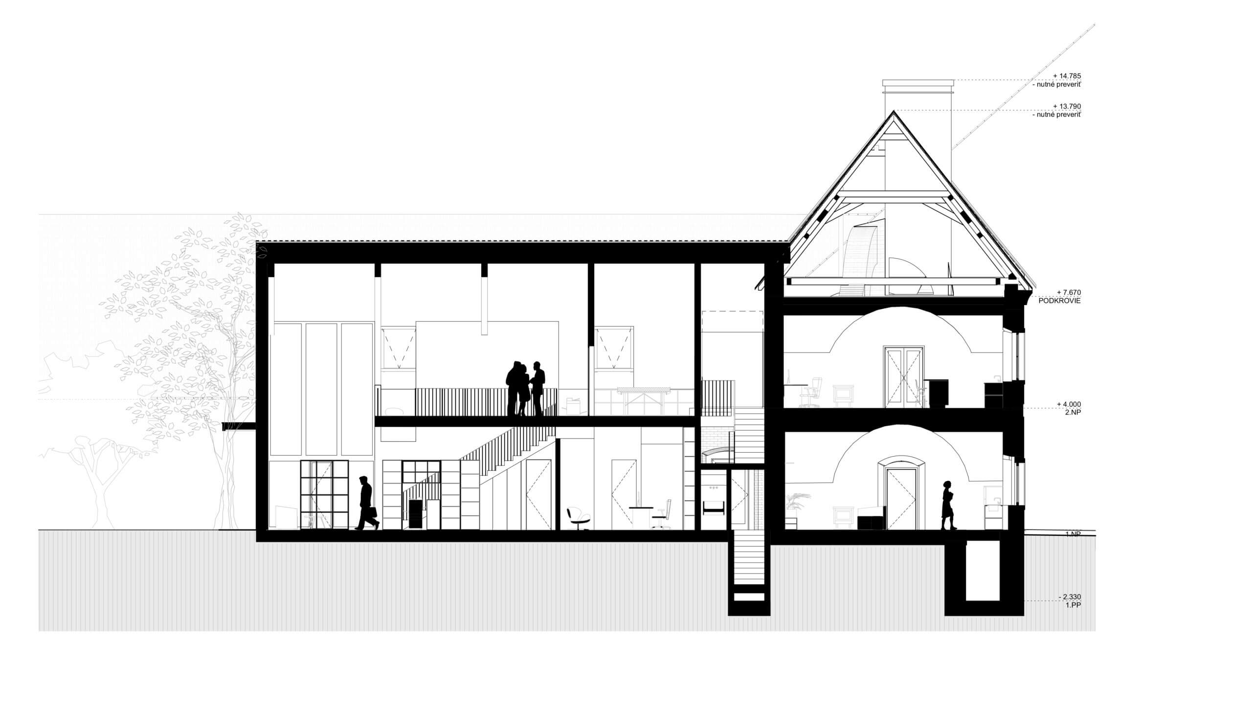 V mieste pôvodných prístavieb je navrhnutý novotvar novej prístavby. Ten rešpektuje pôvodné nosné murivá a pristavuje sa s novou nosnou konštrukciou. V mieste styku prístavby a pôvodného objektu je navrhnuté schodisko, ktoré bude slúžiť na prístup do apartmánu na 2.NP pôvodného objektu a aj ako prístup na 2. poschodie do priestorov kancelárie. Daný styk je vyriešený preskleným kubusom, ktorý sa nachádza v mieste pôvodného murovaného kubusu. Od súkromného pozemku investora je navrhnutý vedľajší vstup do súkromnej kancelárie, ktorú bude v jeho užívaní. Z predmetnej kancelárie je možný prístup do kuchynky, samostatného WC s predsienkou a serverovne, z ktorej bude ďalej prístup do miestnosti pre upratovačku umiestnenej pod schodmi. V rámci kancelárie je navrhnutá menšie printová zóna. Zo súkromnej kancelárie bude prístup do hlavného kancelárskeho priestor „open space“. Do tejto kancelárie je hlavý vstup orientovaný z nádvoria cez zádverie. Zo zádveria je možný aj priamy vstup do menšej zasadacej miestnosti, cez ktorú je ďalej možný prístup do kuchynky. Kuchynka ako aj zasadacie miestnosť je prechodná a prístupná aj priamo z exteriéru, kde pred týmito priestormi sa bude nachádzať spoločná terasa. Kuchynka bude prístupná aj zo zádveria, kde sa bude nachádzať schodisko z dôvodu lepšieho prístupu z kancelárie na druhom poschodí. V spoločnej kancelárii „open space“ bude priestor členený na viacero zón: 1. zóna pre návštevy, v ktorej sa bude nachádzať pohovka s konferenčným stolíkom, 2. zóna na prácu, kde sú navrhnuté kancelárske stoly so sedením, 3. printová zóna, kde je umiestnená tlačiareň, úložné priestory, archív. Nad touto zónou sa bude nachádzať schodisko, cez ktoré bude prístupné druhý „open space“ na druhom poschodí. K danej kancelárii prislúcha unisex WC s predsieňou.