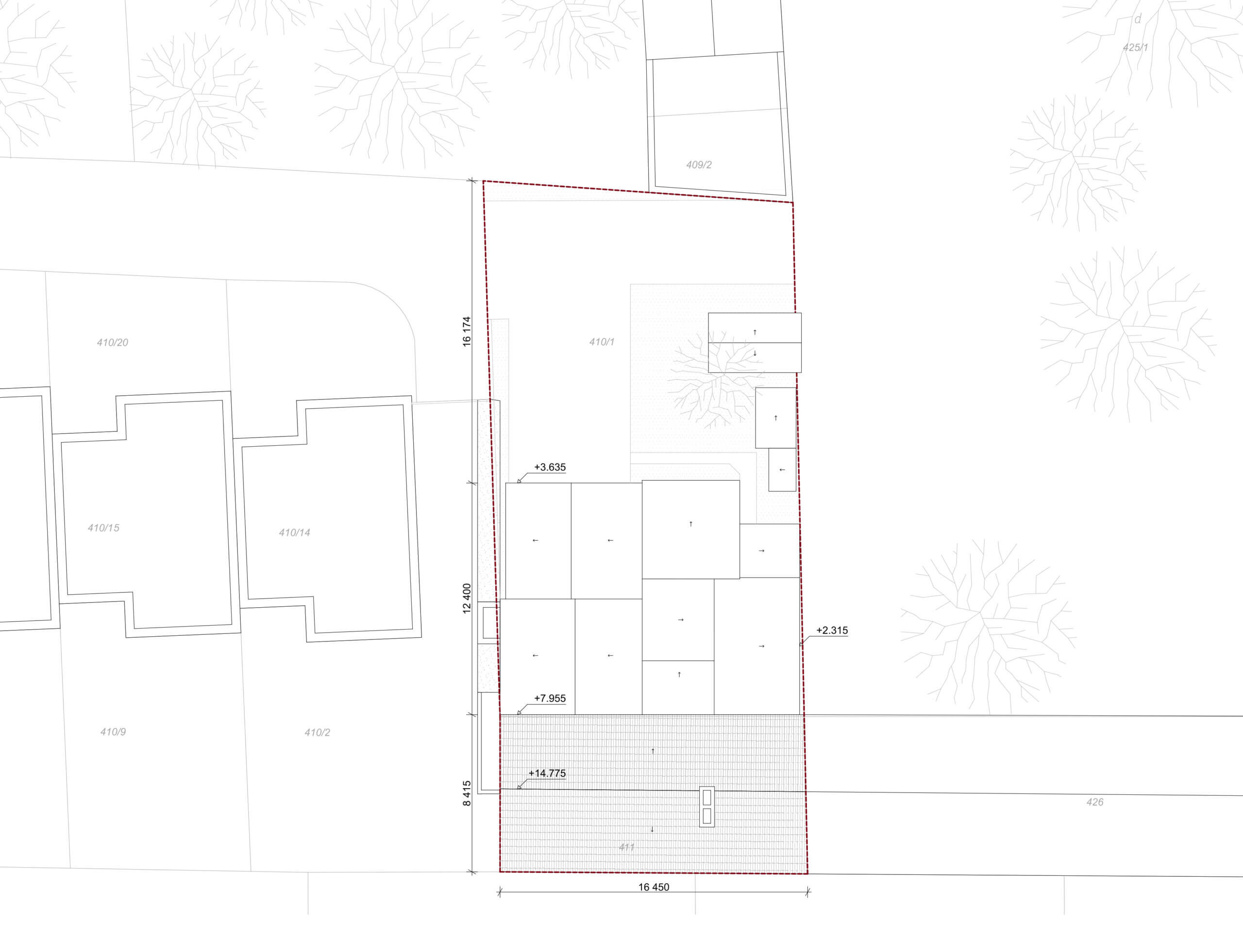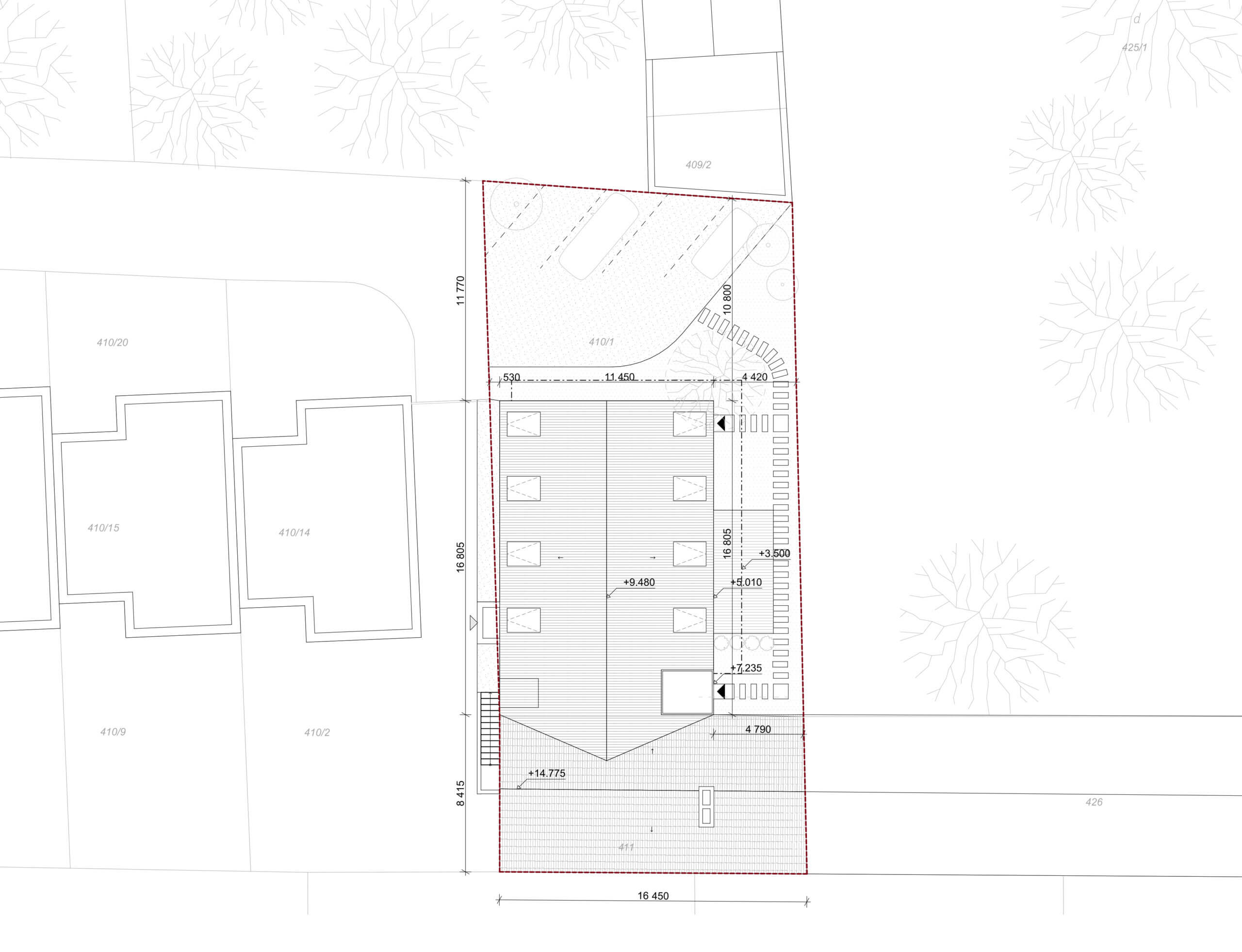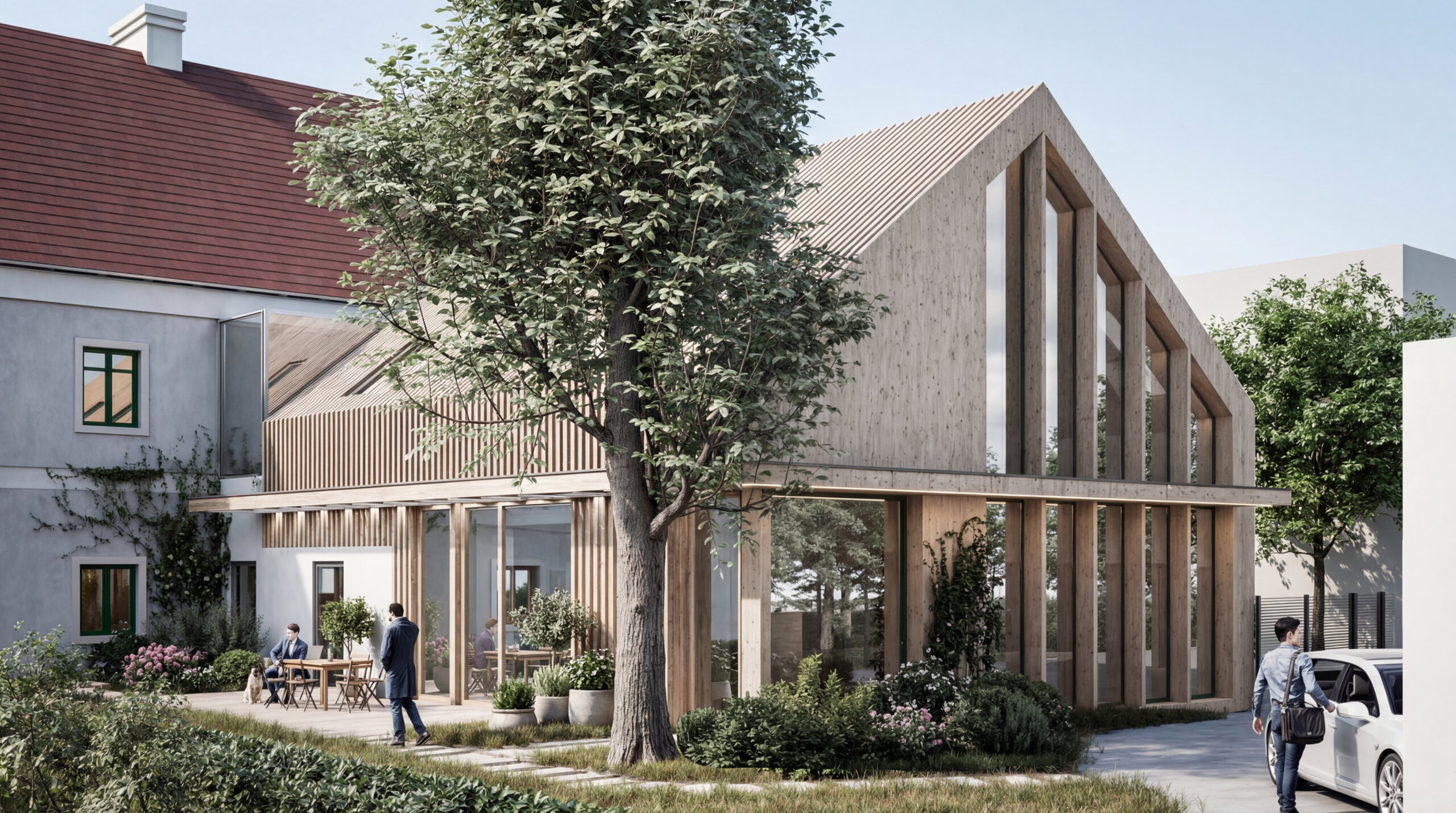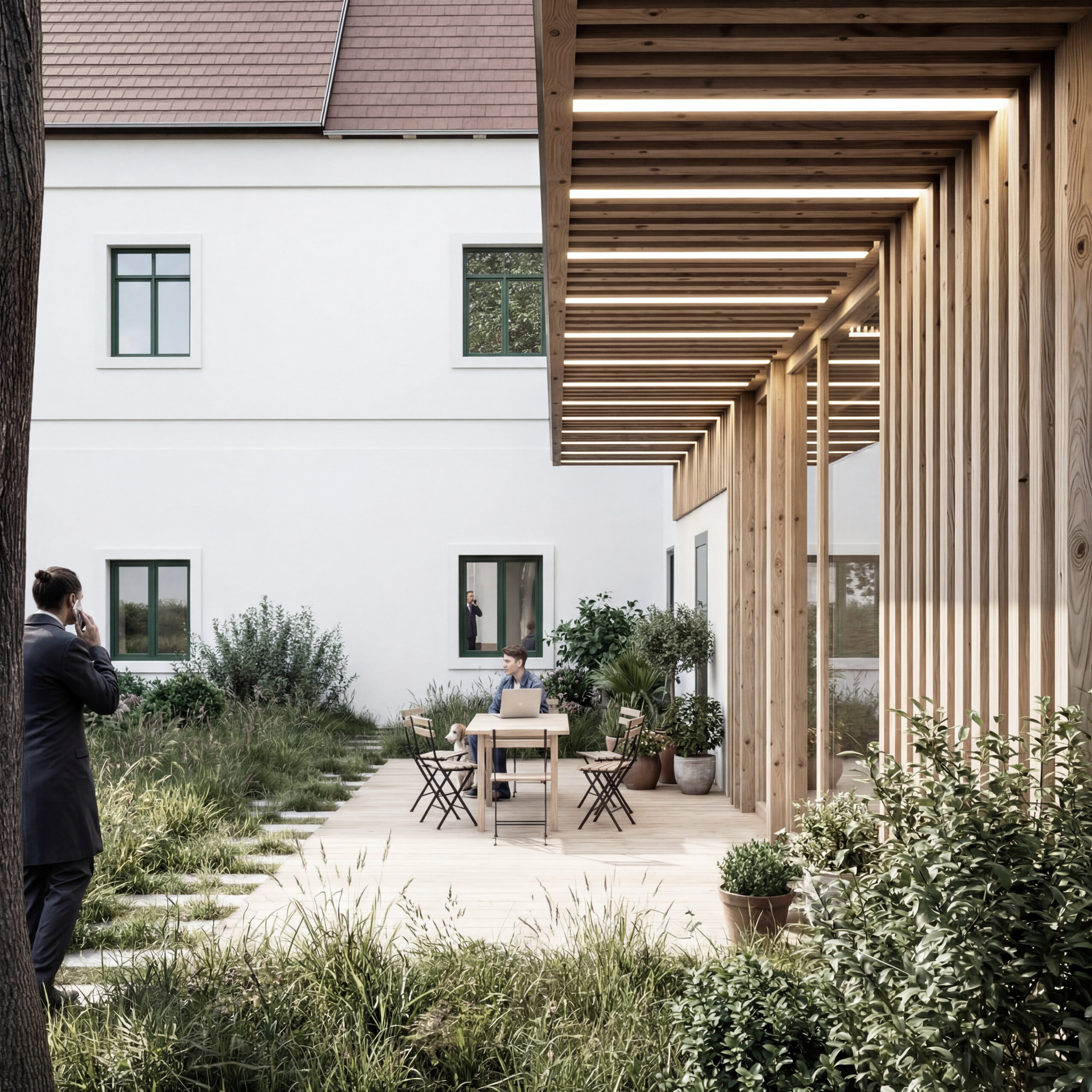 V mieste pôvodných prístavieb je navrhnutý novotvar novej prístavby. Ten rešpektuje pôvodné nosné murivá a pristavuje sa s novou nosnou konštrukciou. V mieste styku prístavby a pôvodného objektu je navrhnuté schodisko, ktoré bude slúžiť na prístup do apartmánu na 2.NP pôvodného objektu a aj ako prístup na 2. poschodie do priestorov kancelárie. Daný styk je vyriešený preskleným kubusom, ktorý sa nachádza v mieste pôvodného murovaného kubusu. Od súkromného pozemku investora je navrhnutý vedľajší vstup do súkromnej kancelárie, ktorú bude v jeho užívaní. Z predmetnej kancelárie je možný prístup do kuchynky, samostatného WC s predsienkou a serverovne, z ktorej bude ďalej prístup do miestnosti pre upratovačku umiestnenej pod schodmi. V rámci kancelárie je navrhnutá menšie printová zóna. Zo súkromnej kancelárie bude prístup do hlavného kancelárskeho priestor „open space“. Do tejto kancelárie je hlavý vstup orientovaný z nádvoria cez zádverie. Zo zádveria je možný aj priamy vstup do menšej zasadacej miestnosti, cez ktorú je ďalej možný prístup do kuchynky. Kuchynka ako aj zasadacie miestnosť je prechodná a prístupná aj priamo z exteriéru, kde pred týmito priestormi sa bude nachádzať spoločná terasa. Kuchynka bude prístupná aj zo zádveria, kde sa bude nachádzať schodisko z dôvodu lepšieho prístupu z kancelárie na druhom poschodí. V spoločnej kancelárii „open space“ bude priestor členený na viacero zón: 1. zóna pre návštevy, v ktorej sa bude nachádzať pohovka s konferenčným stolíkom, 2. zóna na prácu, kde sú navrhnuté kancelárske stoly so sedením, 3. printová zóna, kde je umiestnená tlačiareň, úložné priestory, archív. Nad touto zónou sa bude nachádzať schodisko, cez ktoré bude prístupné druhý „open space“ na druhom poschodí. K danej kancelárii prislúcha unisex WC s predsieňou.