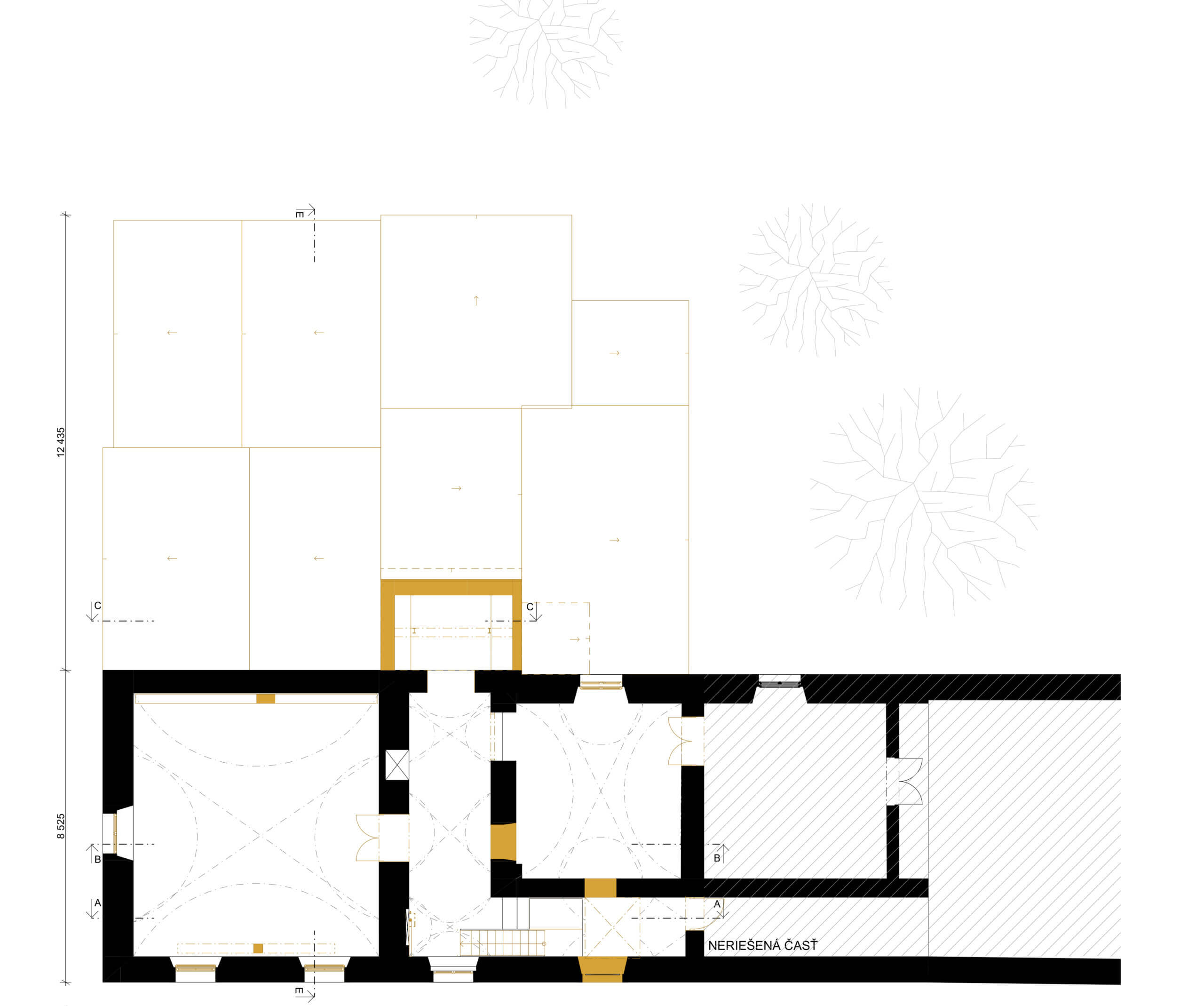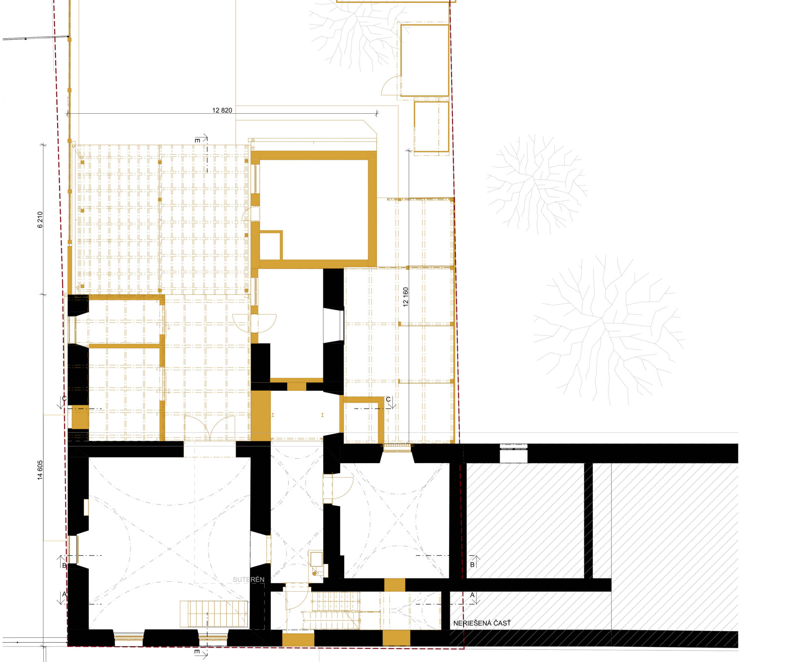 Pod pôvodnou časťou krídla sa nachádza menší suterén, ktorý v minulosti zrejme slúžil ako sklad, prípadne vínna pivnička. Do daného priestoru sa dá dostať cez schody, ktoré v minulosti boli zrejme v inom tvare. V súčasnej podobe nemajú podestu. V návrhu sú odstránené a zaslepené. Dôvodom je lepšie využitie priestoru na prvom poschodí. Do súterénu sú navrhnuté dve nové schodiská. Jedno exteriérové, ktoré bude prístupné z pozemku investora a druhé interiérové, ktoré bude prístupné z navrhovanej prístavby. Suterén bude slúžiť ako technická miestnosť pre objekt, alebo ako skladový priestor.