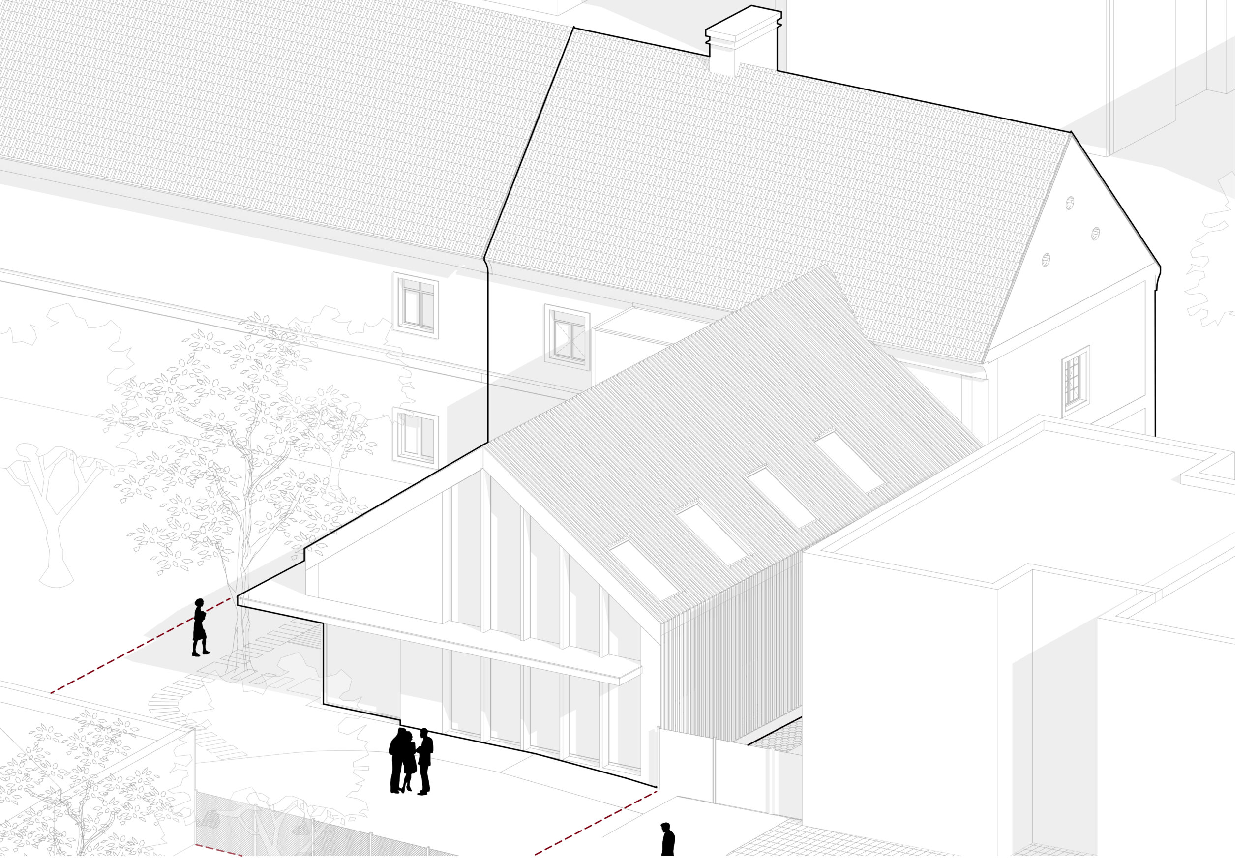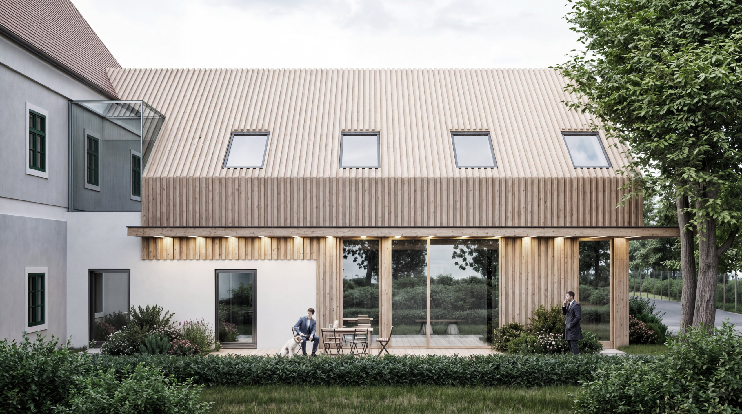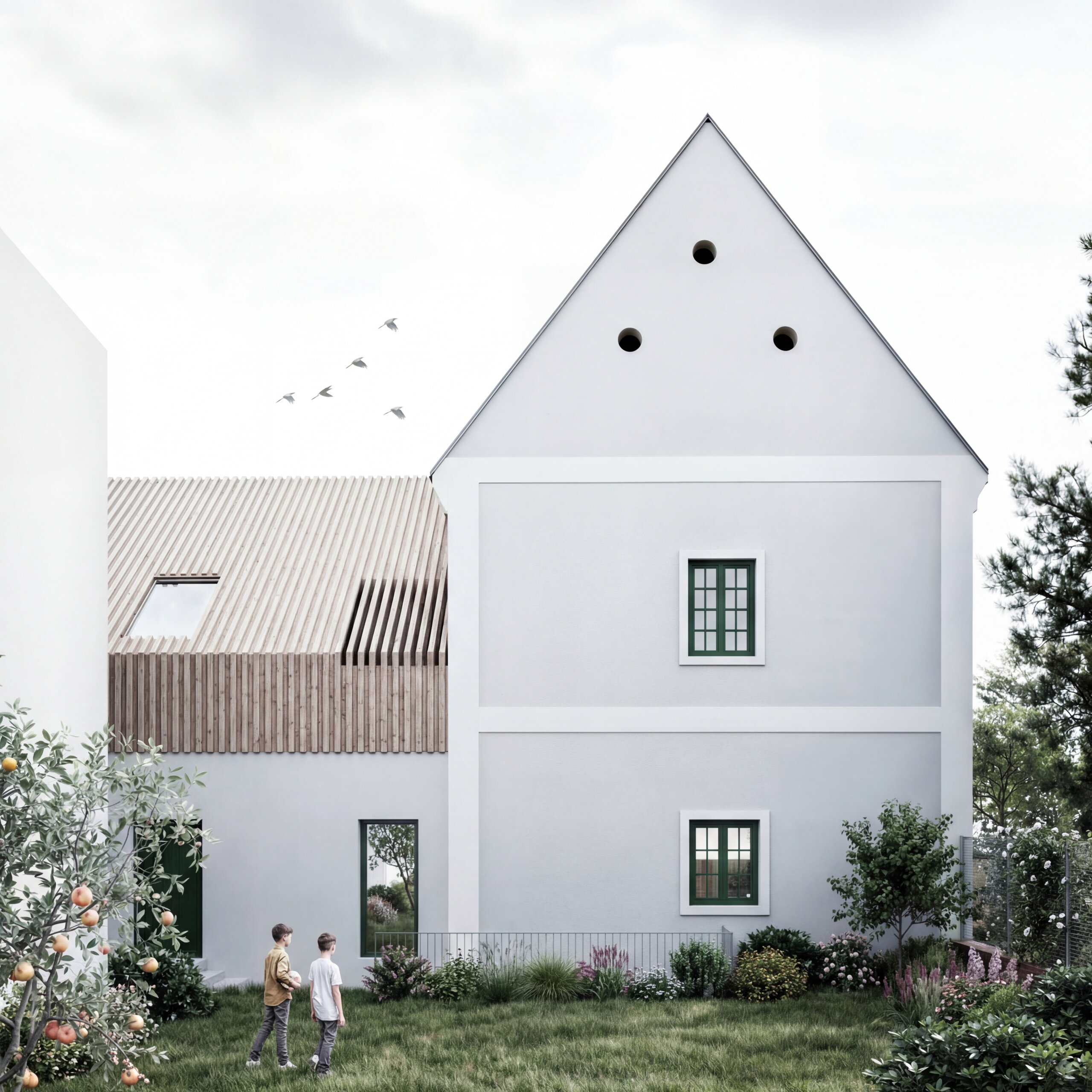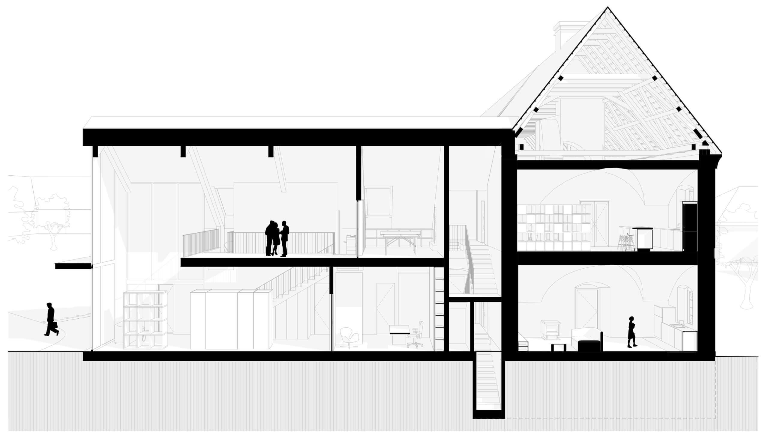 Riešený objekt pozostáva z dvoch objemov, ktoré na seba nadväzujú. Pôvodná časť zachovaného krídla, do ktorej je navrhnuté krátkodobé ubytovanie vo forme dvoch dvojizbových apartmánov a prístavba vo forme novotvaru, kde sú navrhnuté kancelárske priestory so zázemím.