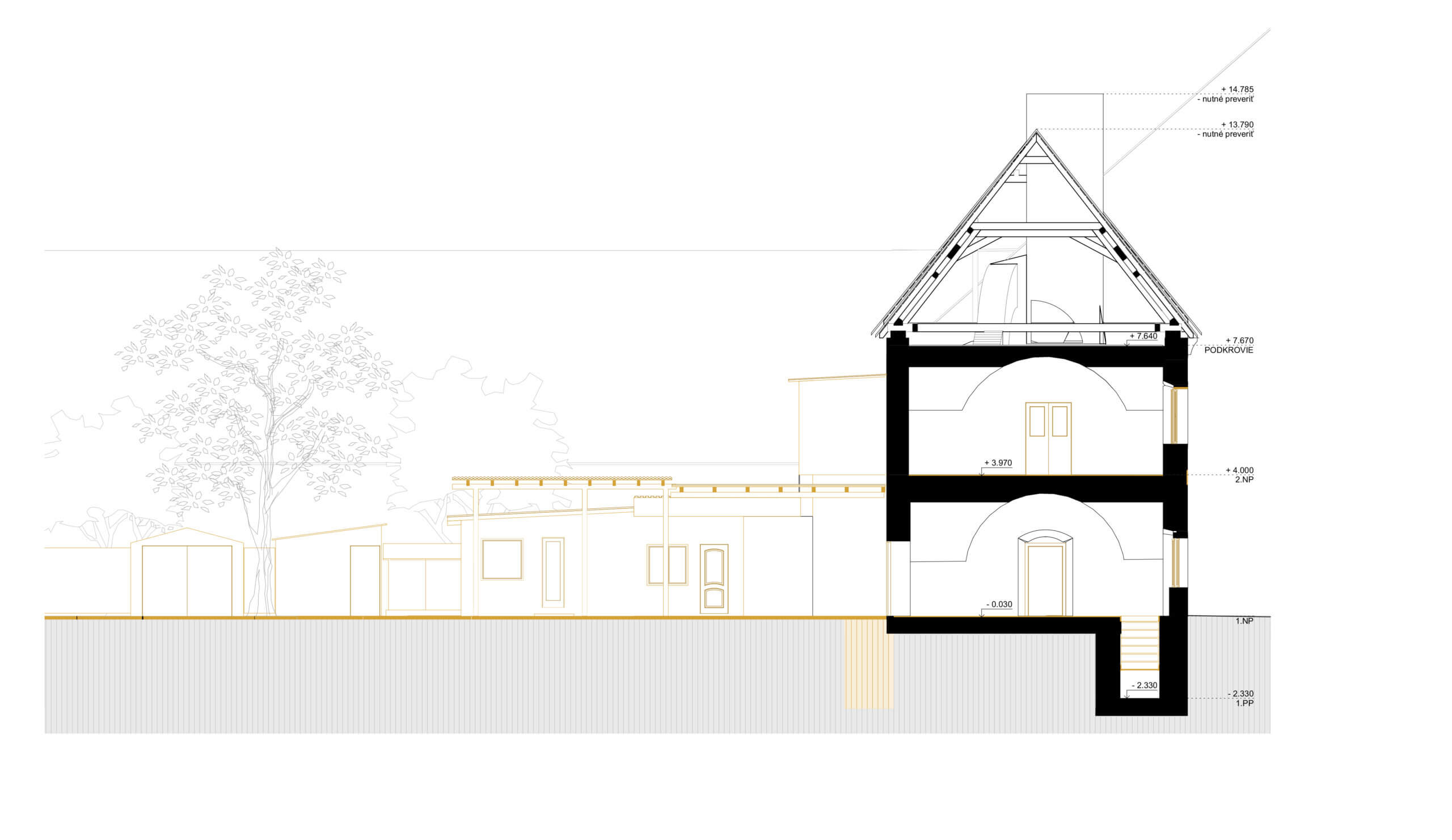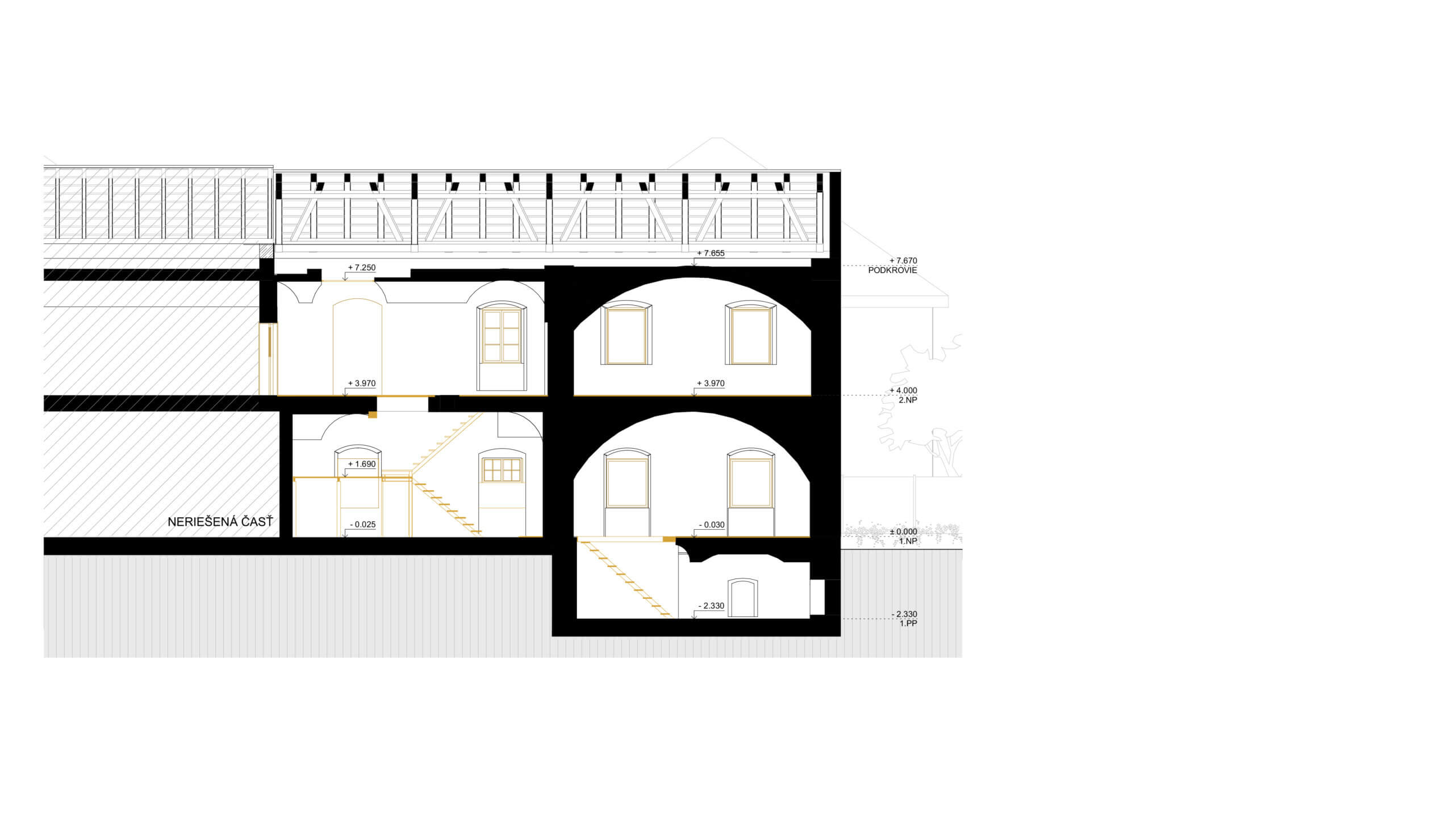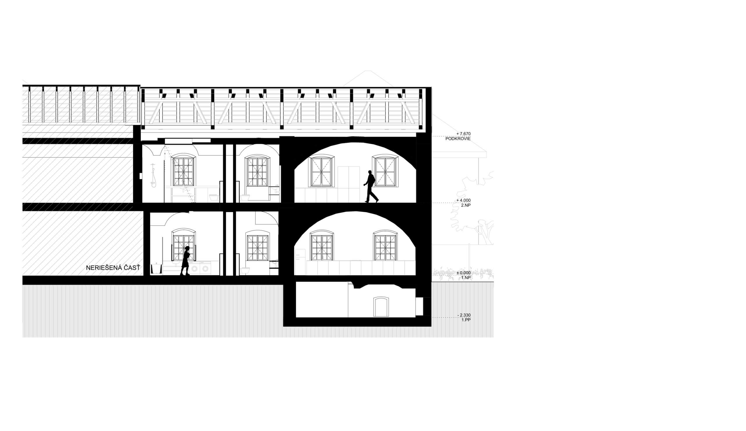 V prístavbe sa neuvažuje so suterénom. Do pôvodného suterénu pod obnovovanou budovou bude viesť schodisko zo schodiskového priestoru prístavby.