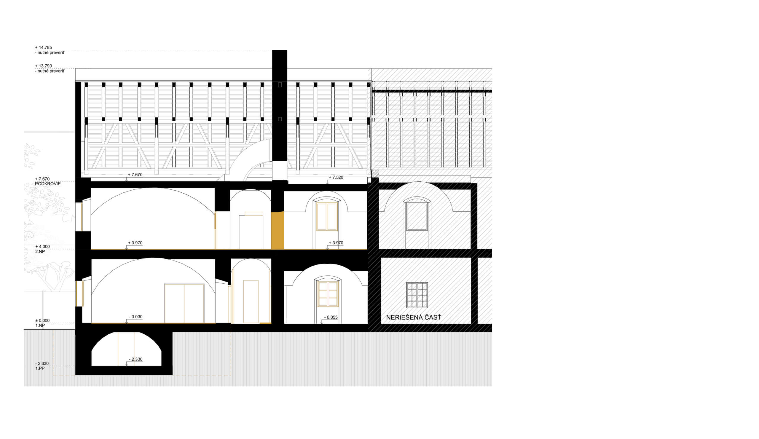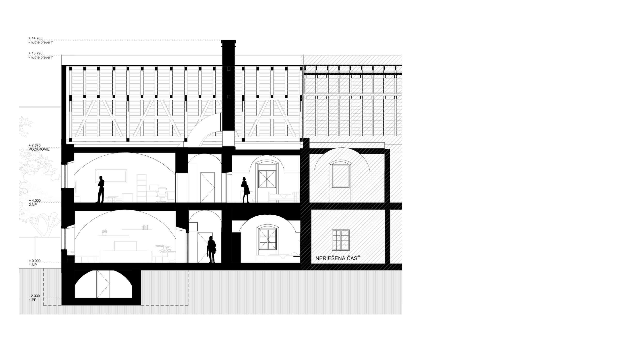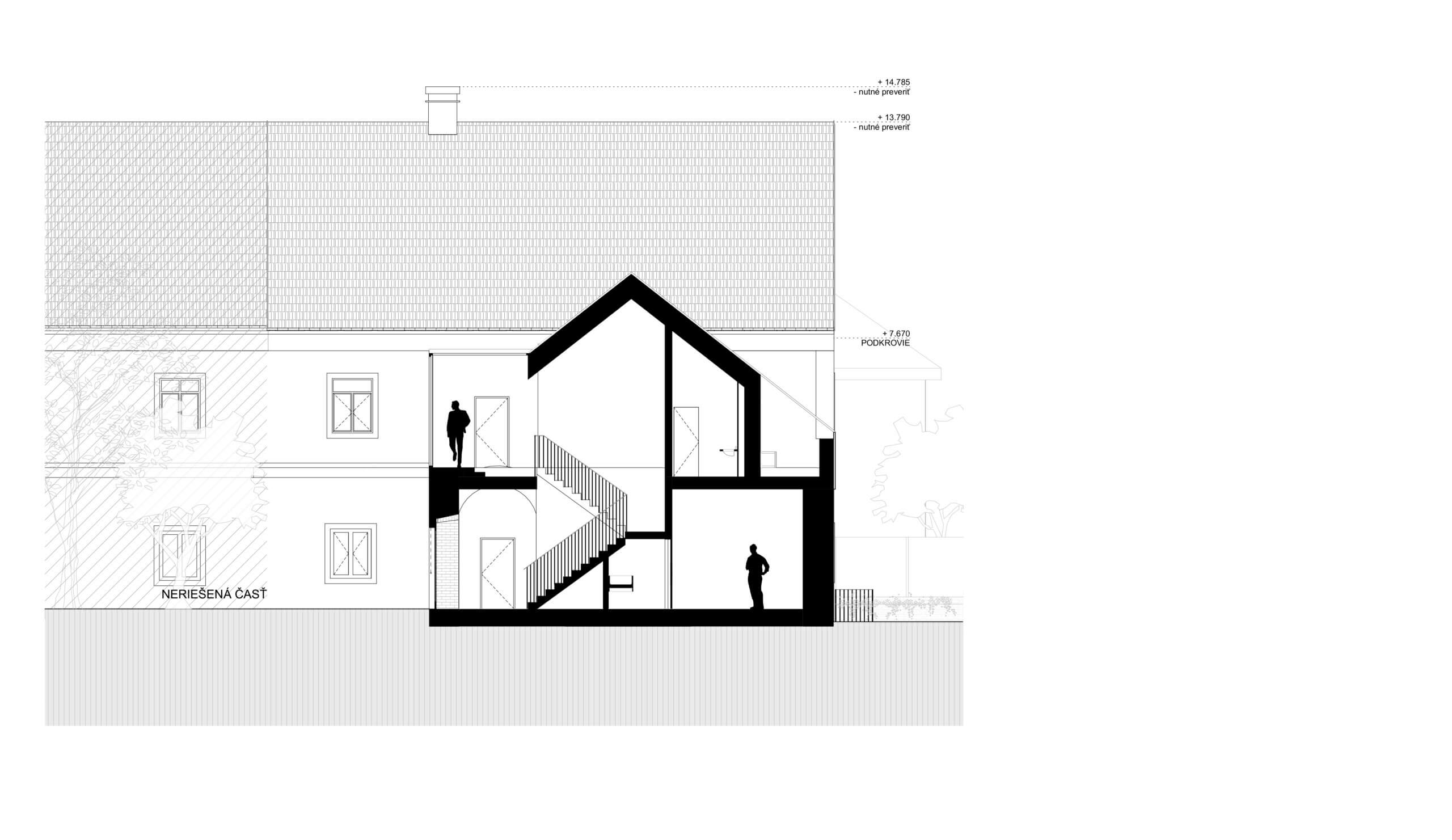 Výstup do krovu je navrhnuté cez padacie dvierka. Podkrovie z dôvodu ťažkého prístupu nebude využívané. Do podkrovia môže byť umiestnená technológia, ktorá môže slúžiť pre obnovovanú časť krídla a prístavbu, do ktorej môžu priamo viesť vodorovné rozvody. Prípadne môže toto poschodie slúžiť pre skladové účely.