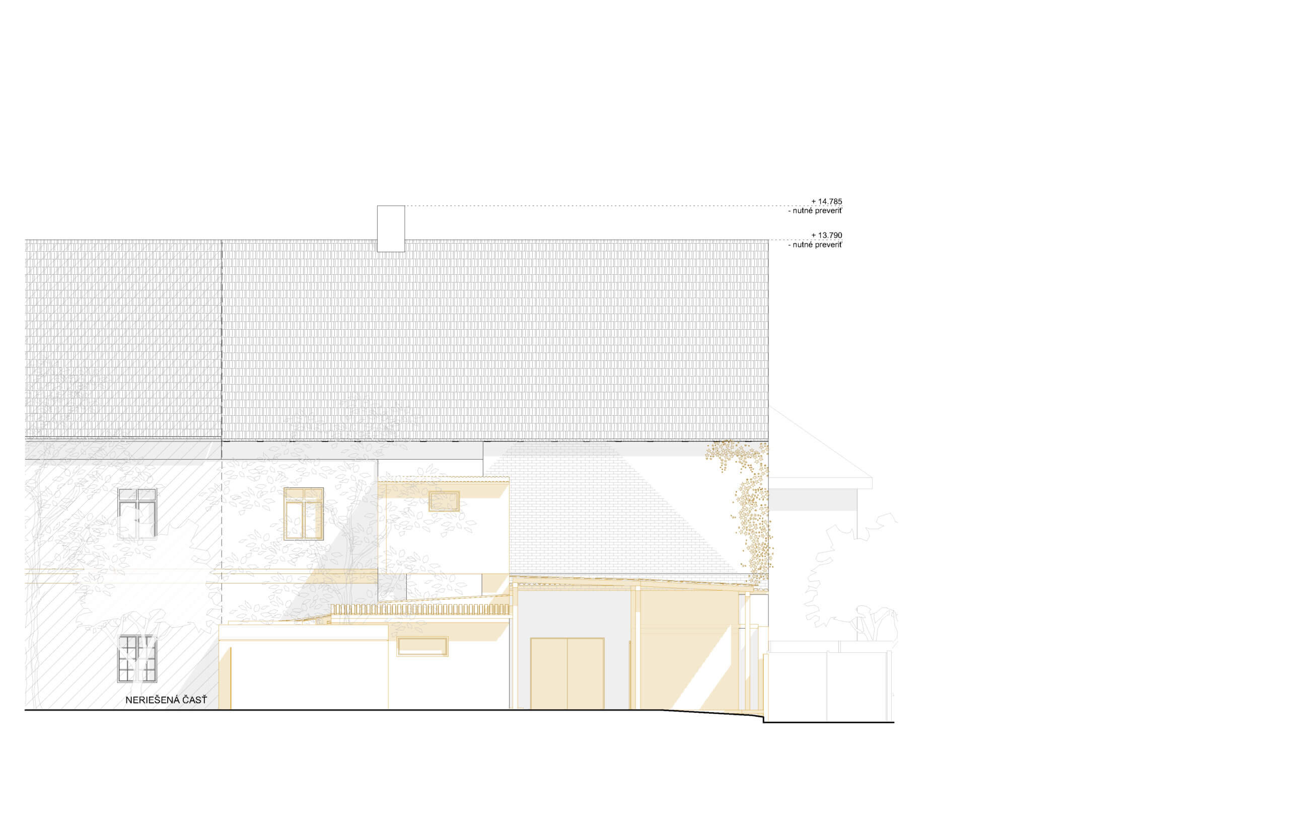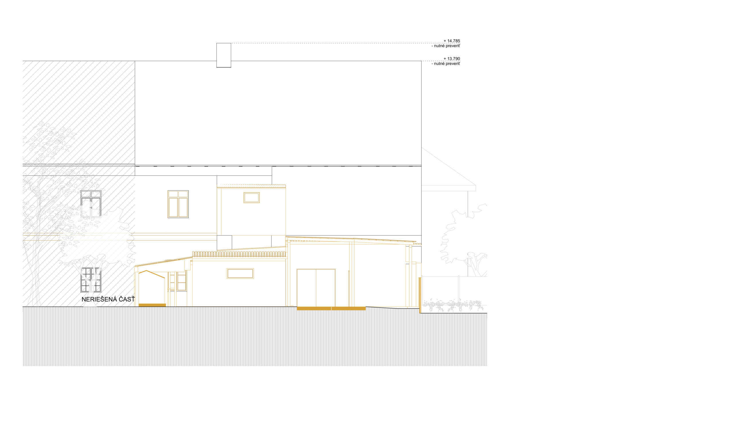 Hlavným zámerom obnovy predmetnej časti pôvodného krídla je návrat k architektonickým hodnotám, kedy bola pamiatka postavená, t.j. za Márie Terézie v 18. stor. Hmotová kompozícia stavby vychádza z pamiatkového zámeru, na základe ktorého pri návrhu nedošlo k hmotovým zmenám pamiatky. Okenné a dverné otvory sa nezachovali a budú musieť byť nahradené novými oknami, ktorých výraz a proporcie budú vychádzať z architektonicko-historického výskumu spracovaného pre severné krídlo tej istej pamiatky. Niektoré šambrány okolo okien, vlysy a rímsy pri streche sa zachovali a vďaka ich zameraniu môžeme odčítať ich rozmery a proporcie a rekonštruovať ich do pôvodného stavu. Z pohľadu novej funkcie, ktorou je krátkodobé ubytovanie sú okenné otvory v prijateľných dimenziách a nie je potrebné ich zväčšovať. Iba v miestach, kde boli dodatočne zamurované. Ich pôvodné šambrány budú obnovené. Celá fasáda a strecha pamiatky bude farebne kopírovať svoj pôvodný stav – biela omietka a červená keramická krytina.