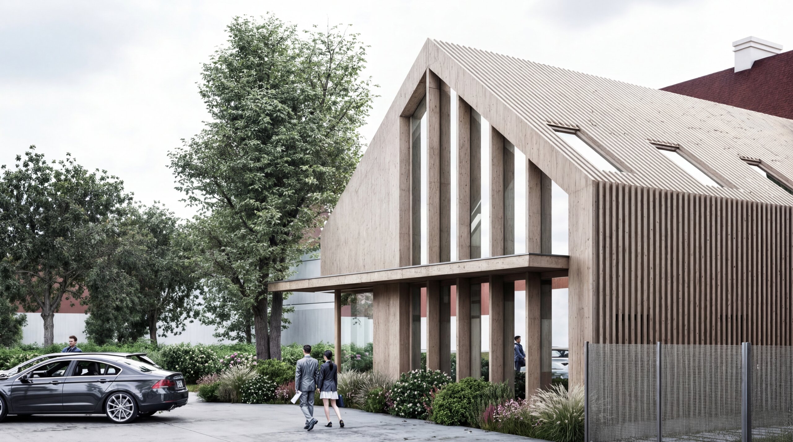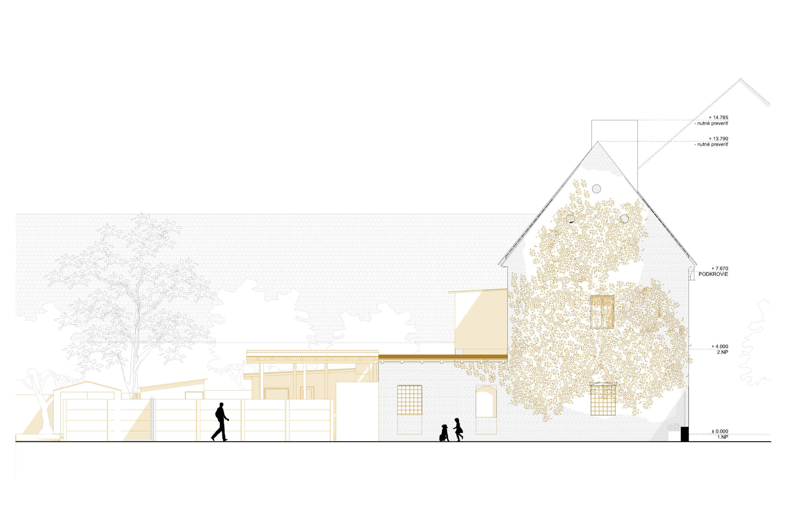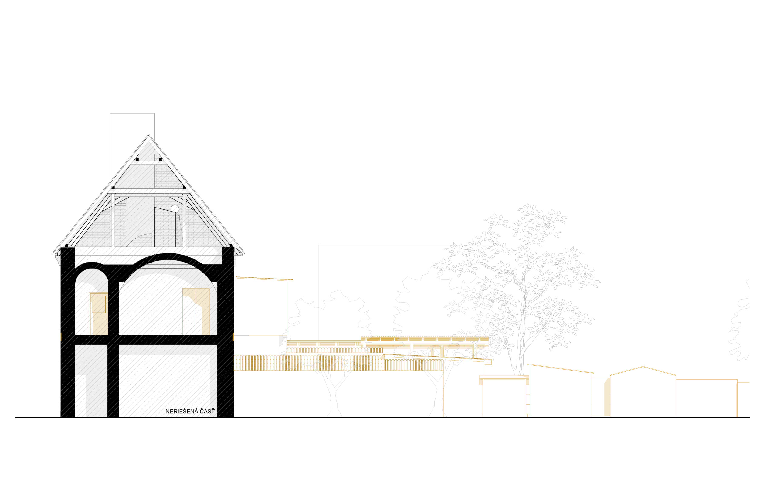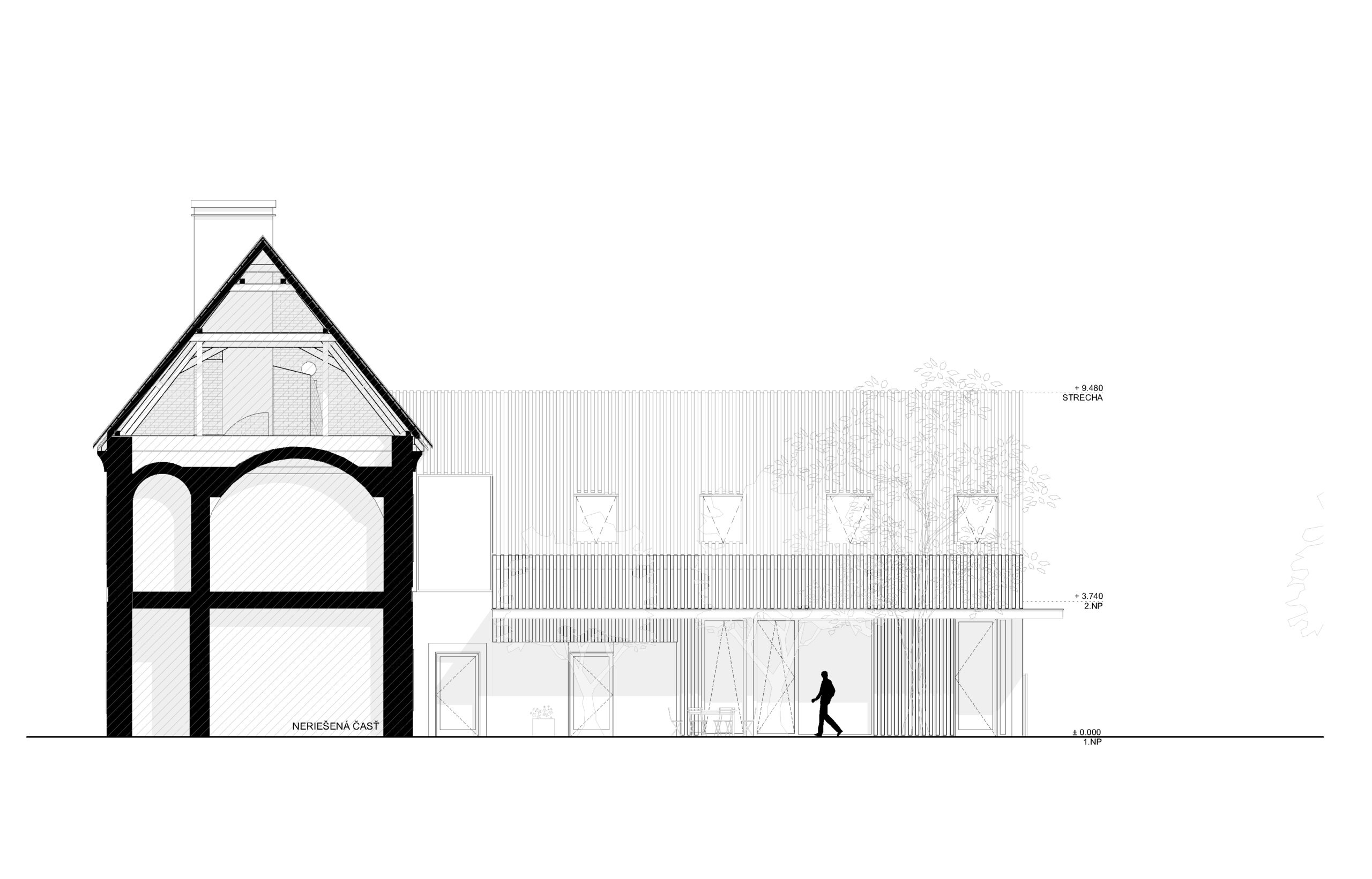 Prístavba, v ktorej sa budú nachádzať kancelárske priestory bude hmotovo (v priečnom reze) rešpektovať pôvodný tvar zrúteného krídla. Ohraničenie je odčítané z čitateľného otlačku v pôvodnej streche a v zachovalom pôvodnom murive, ktoré definuje šírku hmoty novotvaru. Medzi prístavbou a pôvodnou stavbou je navrhnutý presklený kubus (nad pôvodnými murovanými stenami), ktorý sa nachádza v mieste pôvodného murovaného kubusu pristaveného v minulom storočí. Jeho hmotové zachovanie je z dôvodu potrebného prístupu na 2.NP. Presklenie kubusu však odľahčuje hmotu a nenarúša pôvodný vzhľad pamiatky. Do kubusu bude vložené schodisko, cez ktoré bude prístupné 2. poschodie kancelárií a apartmán na 2. poschodí. Vďaka kubusu je možný prístup do pôvodného otvoru bez nutnosti búrať do pôvodnej steny zachovaného krídla pamiatky. Pôvodné torzo (pôvodné steny), ktoré vystupuje z predmetného krídla bude zachované a nadstavané / pristavané novotvarom. V pôvodných murivách sú navrhnuté otvory v pôvodných pozíciách, no v súčasnom prevedení bez parapetov. Zachované murivá budú omietnuté omietkou ako pri obnovovanom krídle. Materiál novotvaru je uvažovaný z drevených lamiel, ktoré budú prechádzať z opláštenia steny až nad strechu, vďaka čomu sa dosiahne jednoliaty tvar prístavby. Čelo fasády prístavby bude vo veľkej miere presklené z dôvodu otvorenej galérie, ktorá sa nachádza za ňou. Materiálové prevedenie celej novostavby bude z dreva, ktoré poukazuje na súčasné prevedenie novotvaru bez akceptácie pôvodnej materiálovej bázy, nakoľko ku nej neboli v tejto časti pamiatky dochované dokumenty.