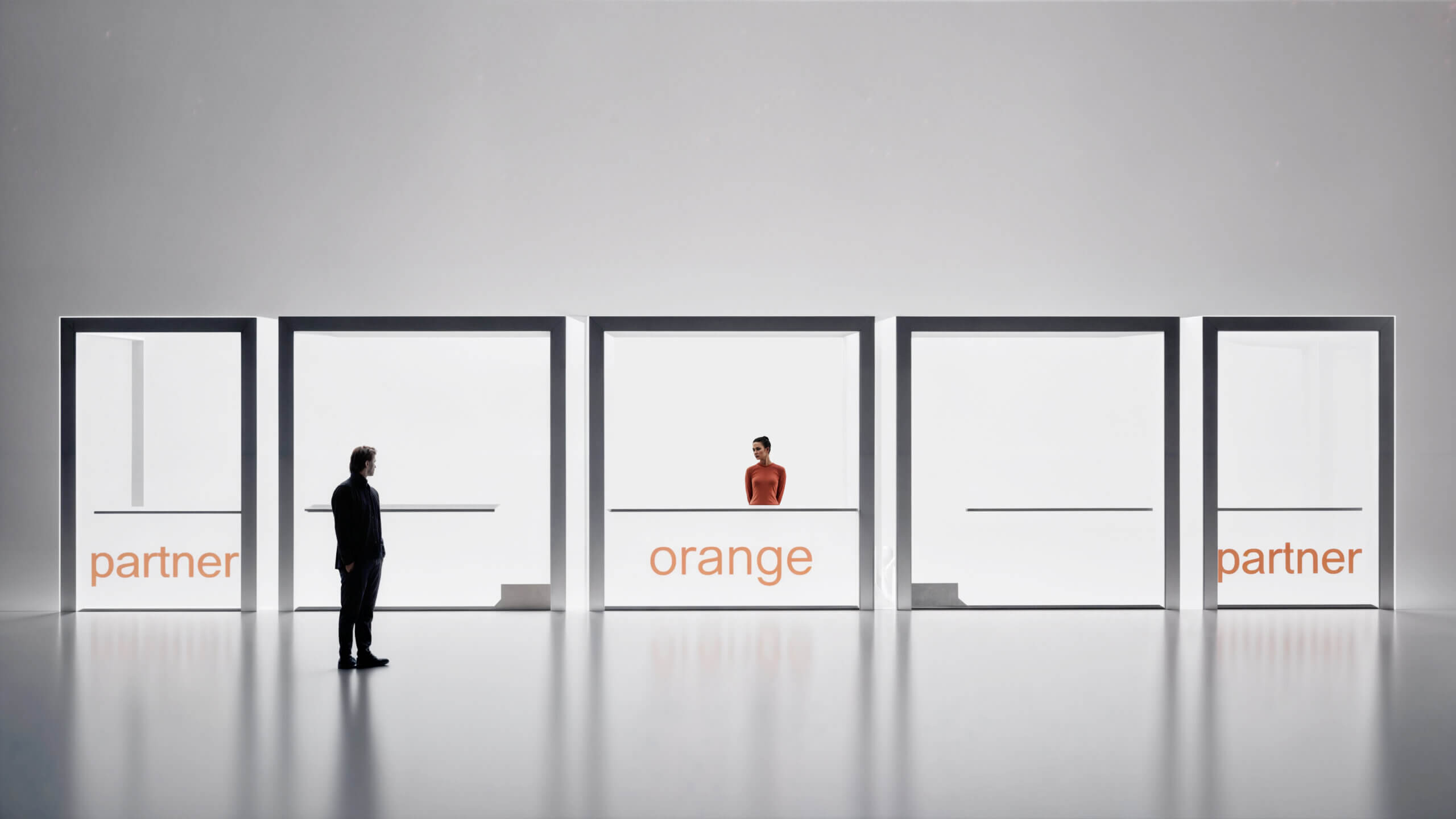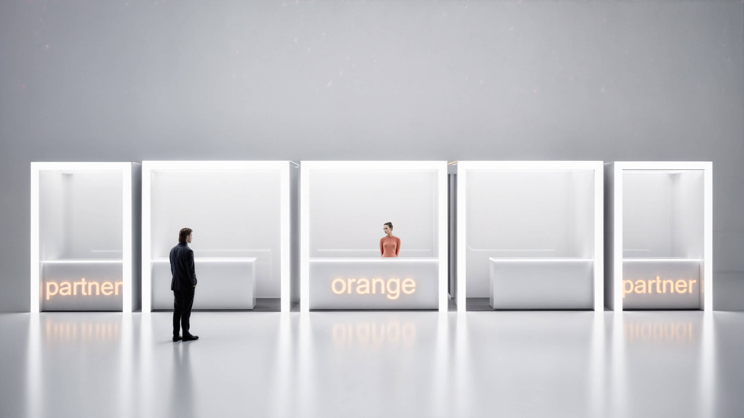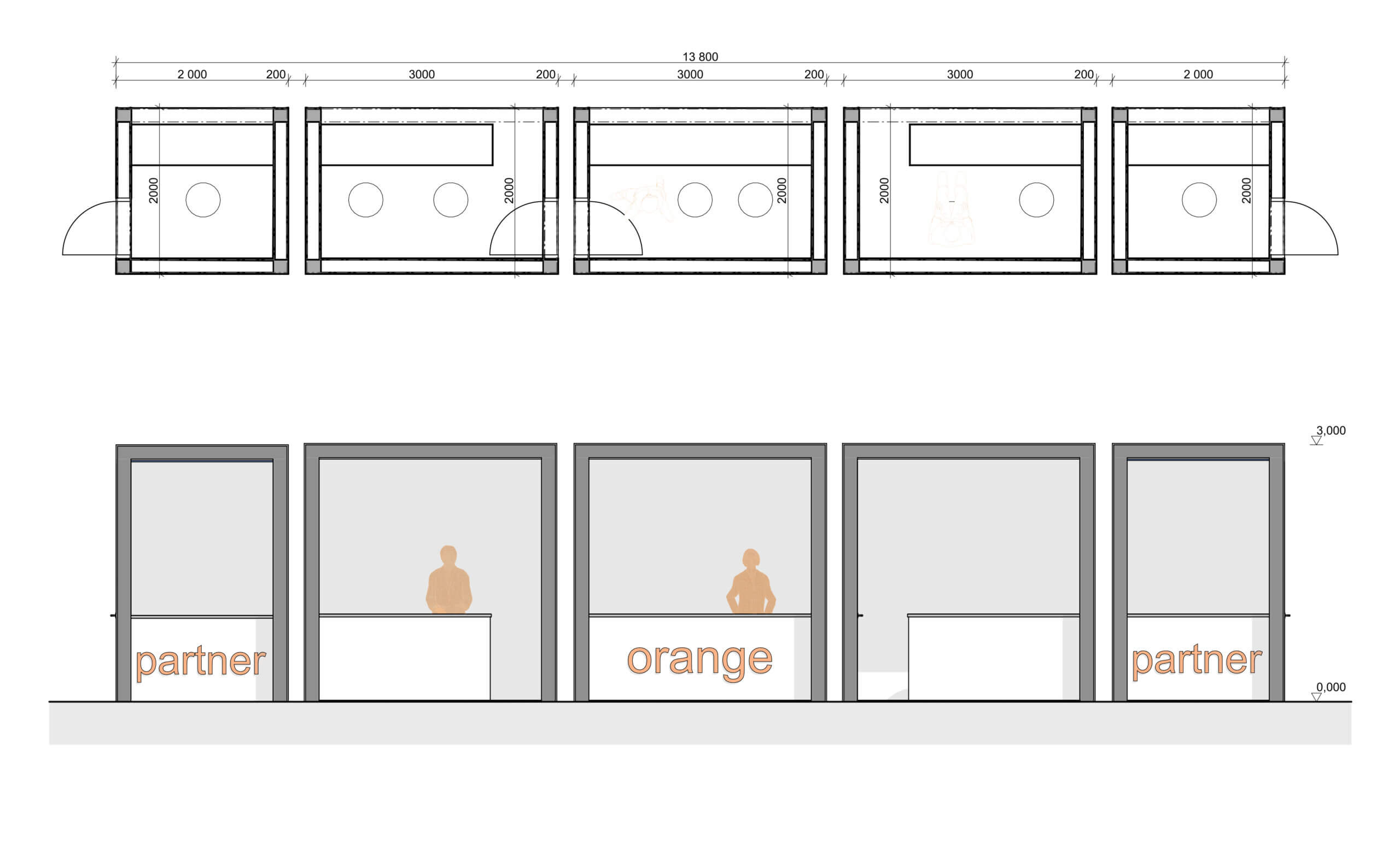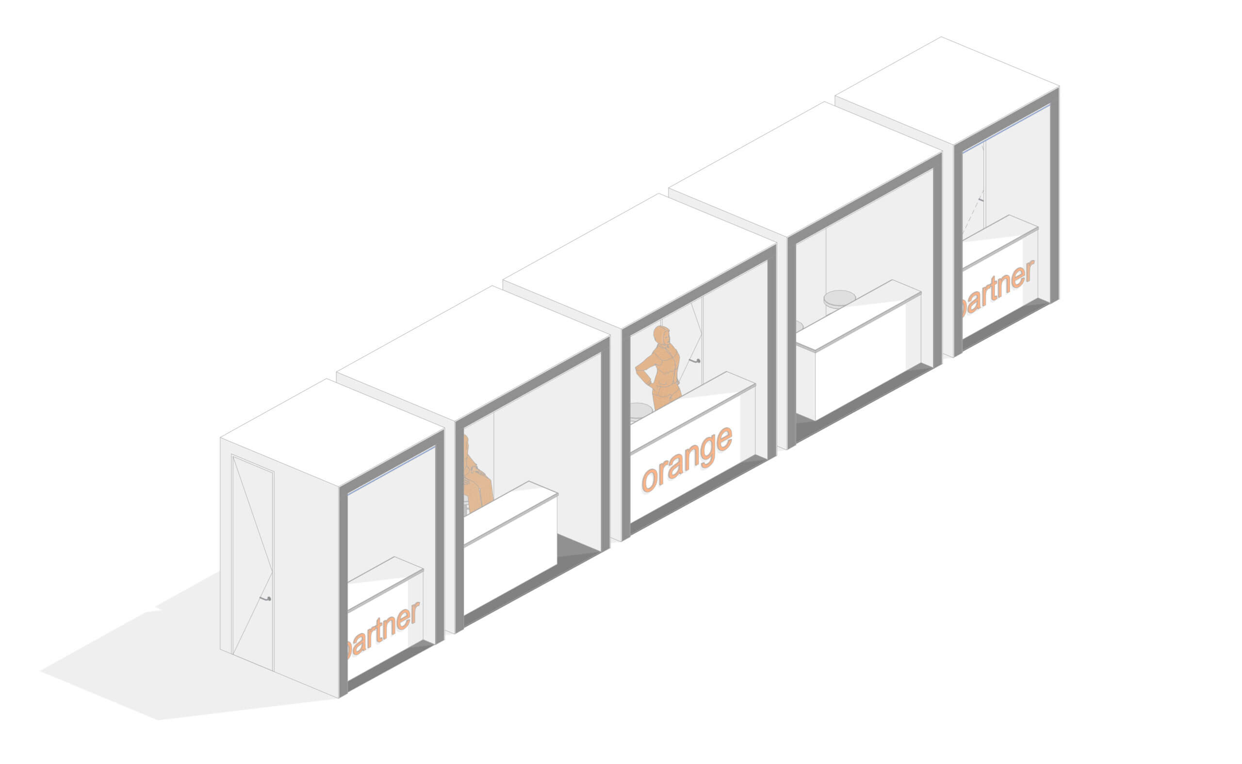 Návrh eventových stánkov bol súčasťou súťaže návrhov pre vytvorenie ORANGE FUN zóny. Stánky by mohli byť využívané v rámci festivalov, alebo na iných eventoch, ako napríklad v priestoroch starej tržnice a pod. Hlavným motívom je z pohľadovej strany štvorec, ktorý tvorí aj logo spoločnosti ORANGE. Zostava sa skladá z piatich segmentov – tri rovnaké moduly zo štvorcov 3 x 3 m (v pohľade) a dva rovnaké moduly zo štvorcov 2 x 3 m (v pohľade). Hĺbka všetkých modulov je 2 m. Stredný modul by slúžil pre spoločnosť ORANGE a bočné pre partnerov spoločnosti. Vo všetkých moduloch je obslužný pultík so sedením. Konštrukcia je navrhnutá ako oceľová, ktorá by bola zo všetkých strán uzatvorená. V rámci návrhu sa uvažovalo s dvoma alternatívami.