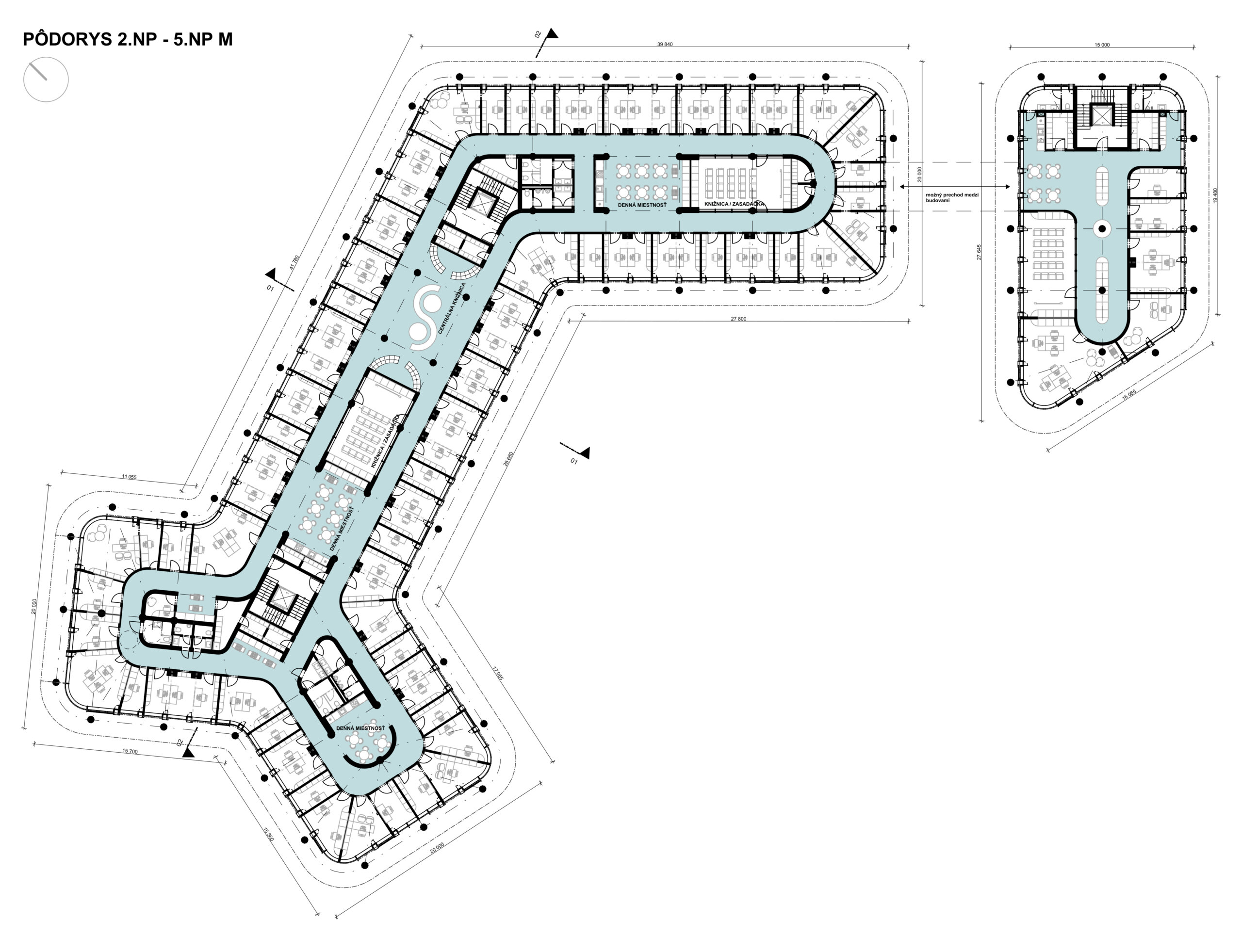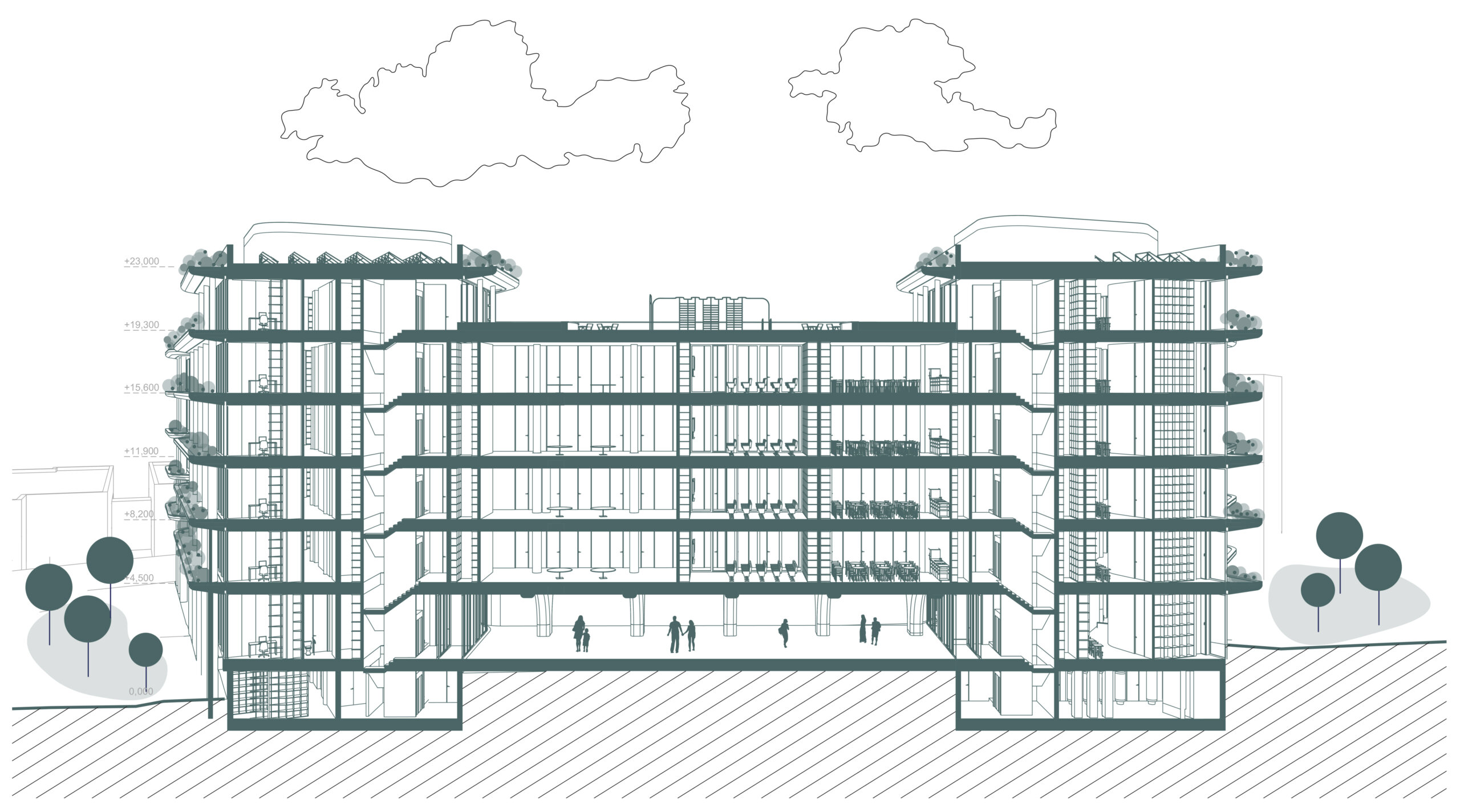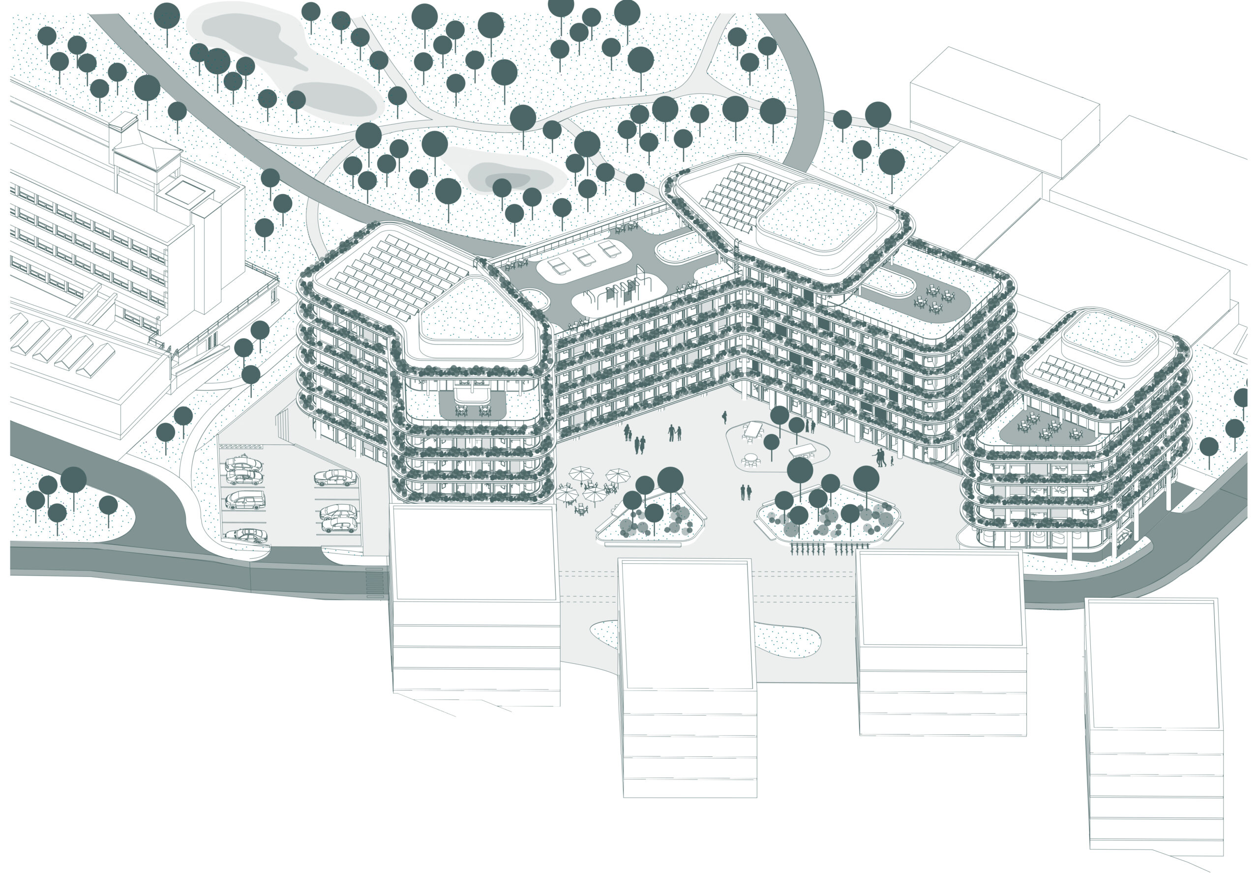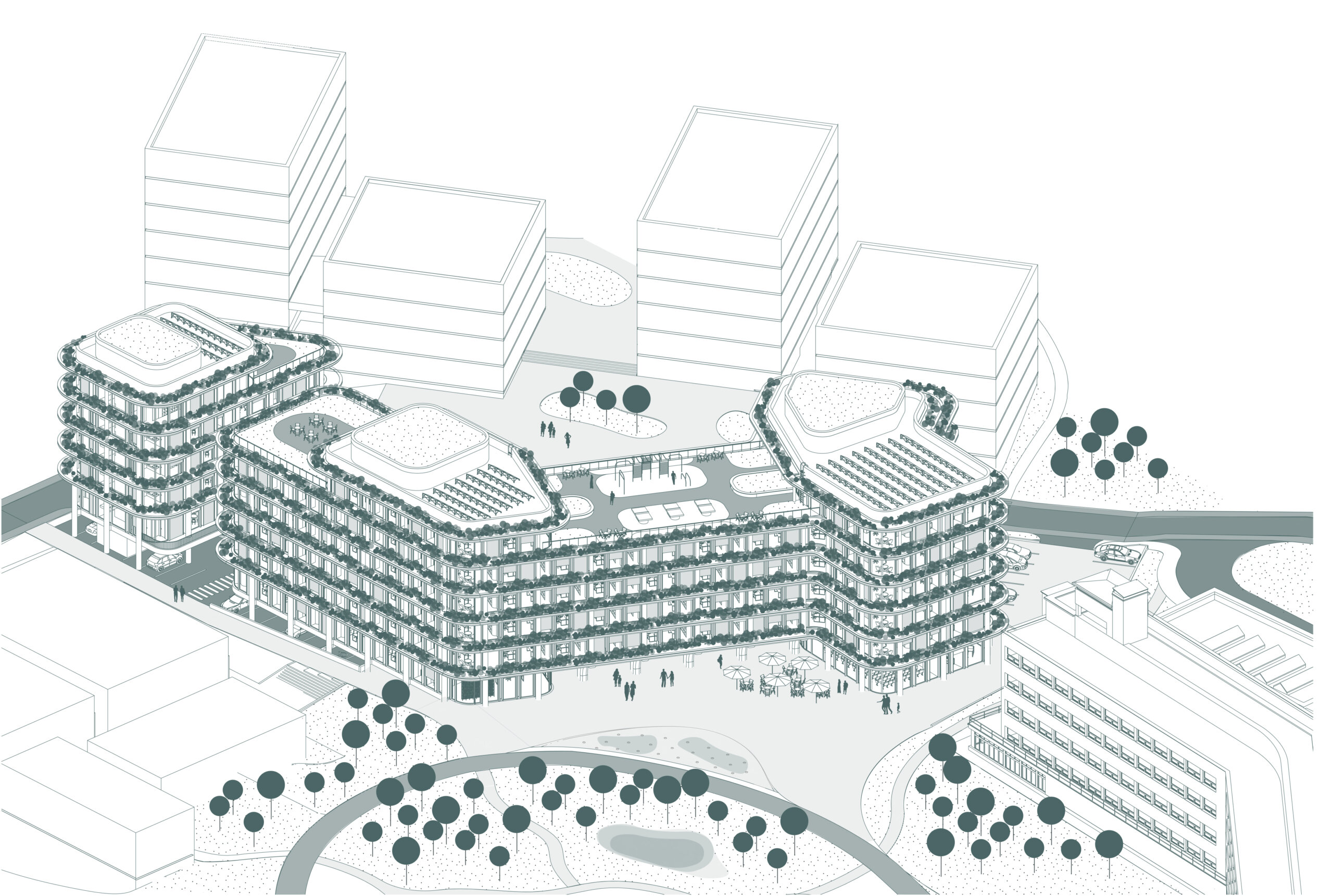 - vytvorenie vnútorného námestia medzi budovami, ktoré priamo prepláva ku parku Helix vďaka zdvihnutému partru
