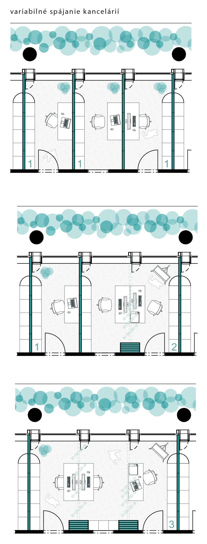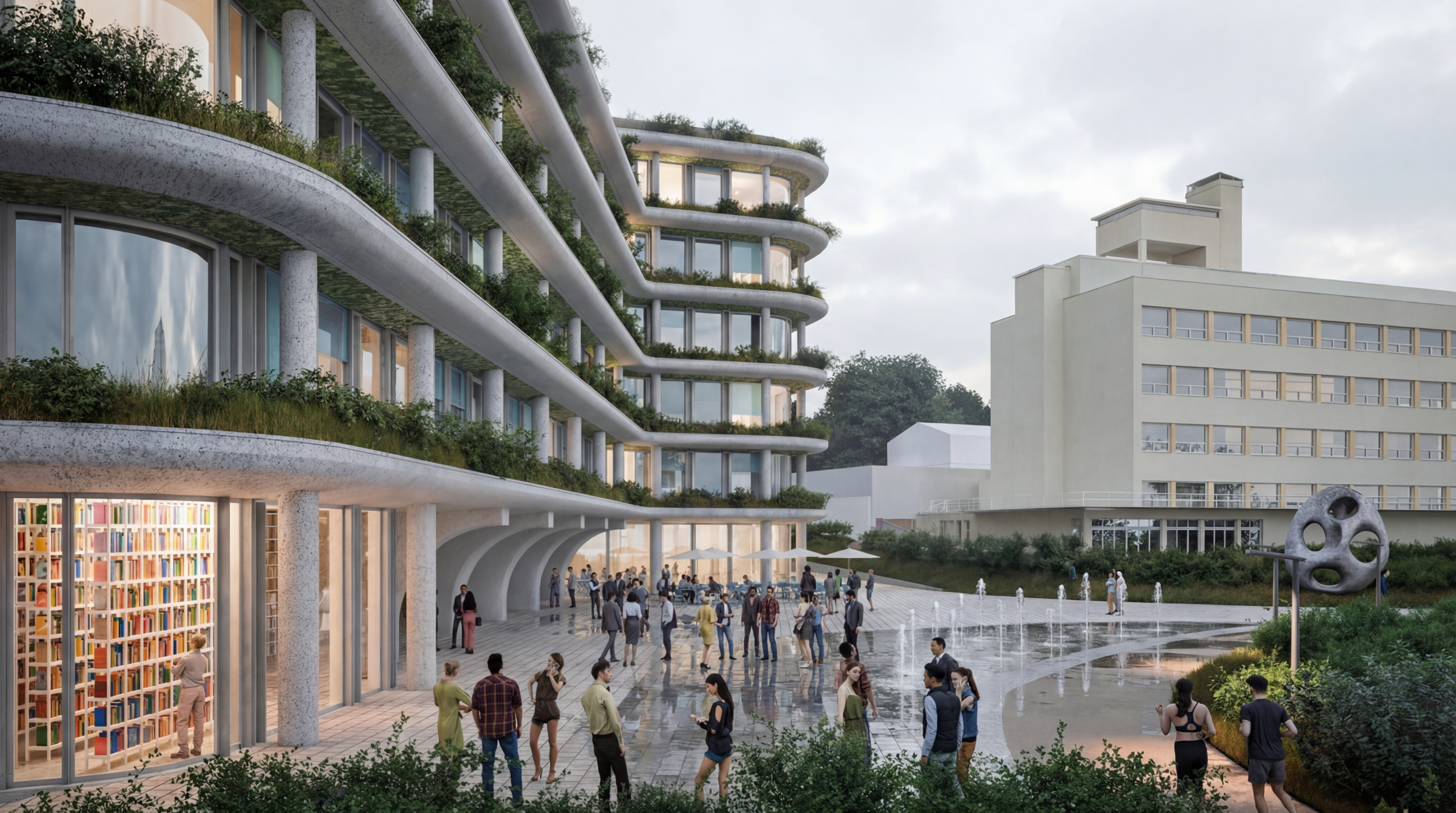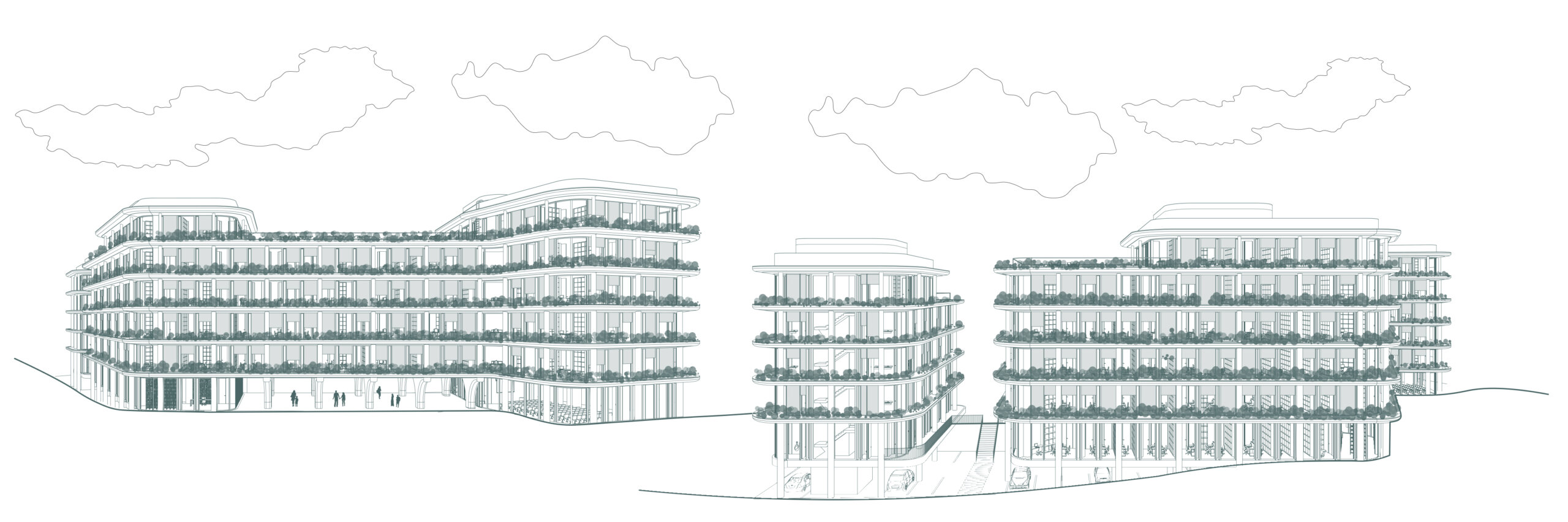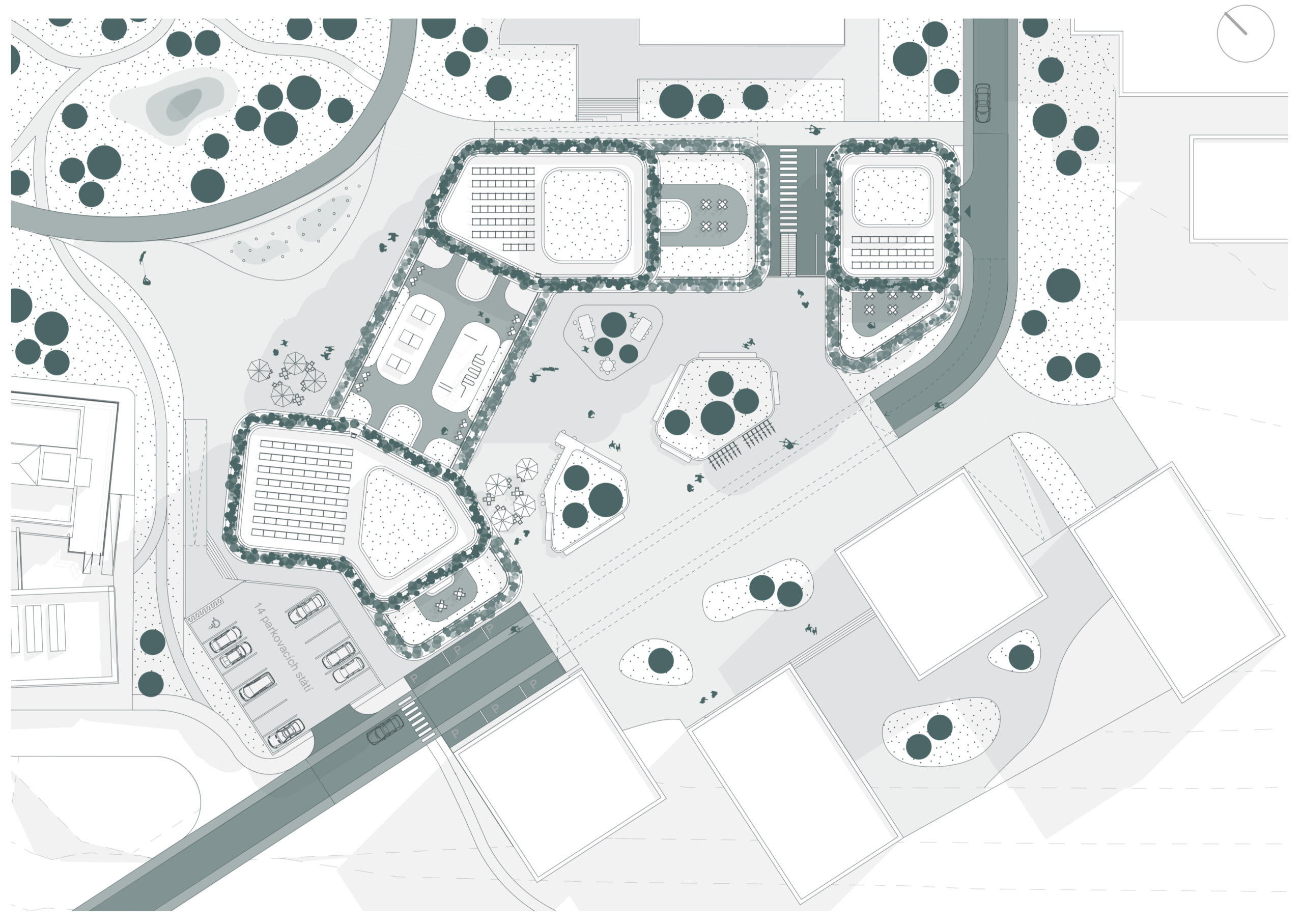 - vytvorenie vnútorného námestia medzi budovami, ktoré priamo prepláva ku parku Helix vďaka zdvihnutému partru
