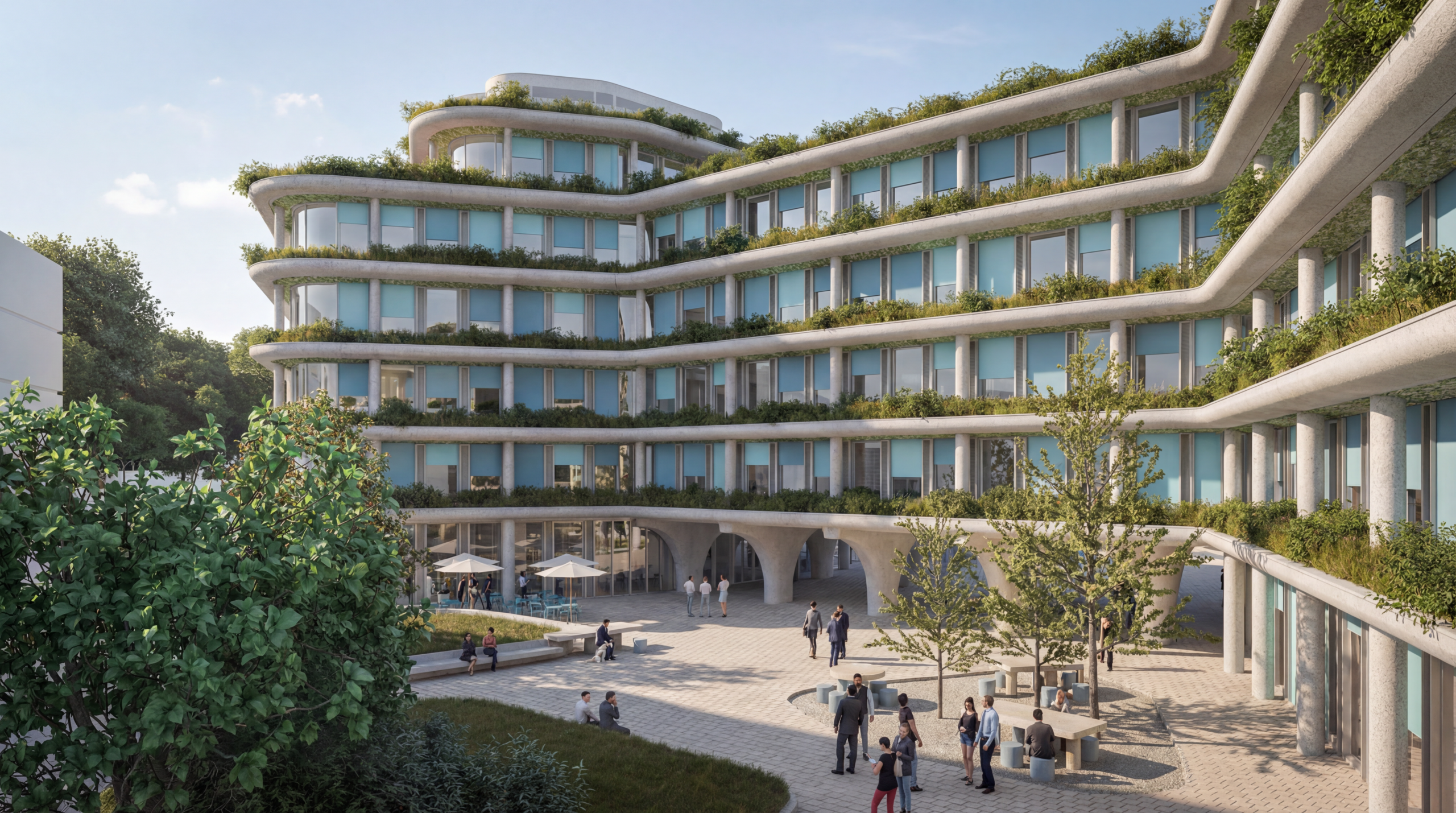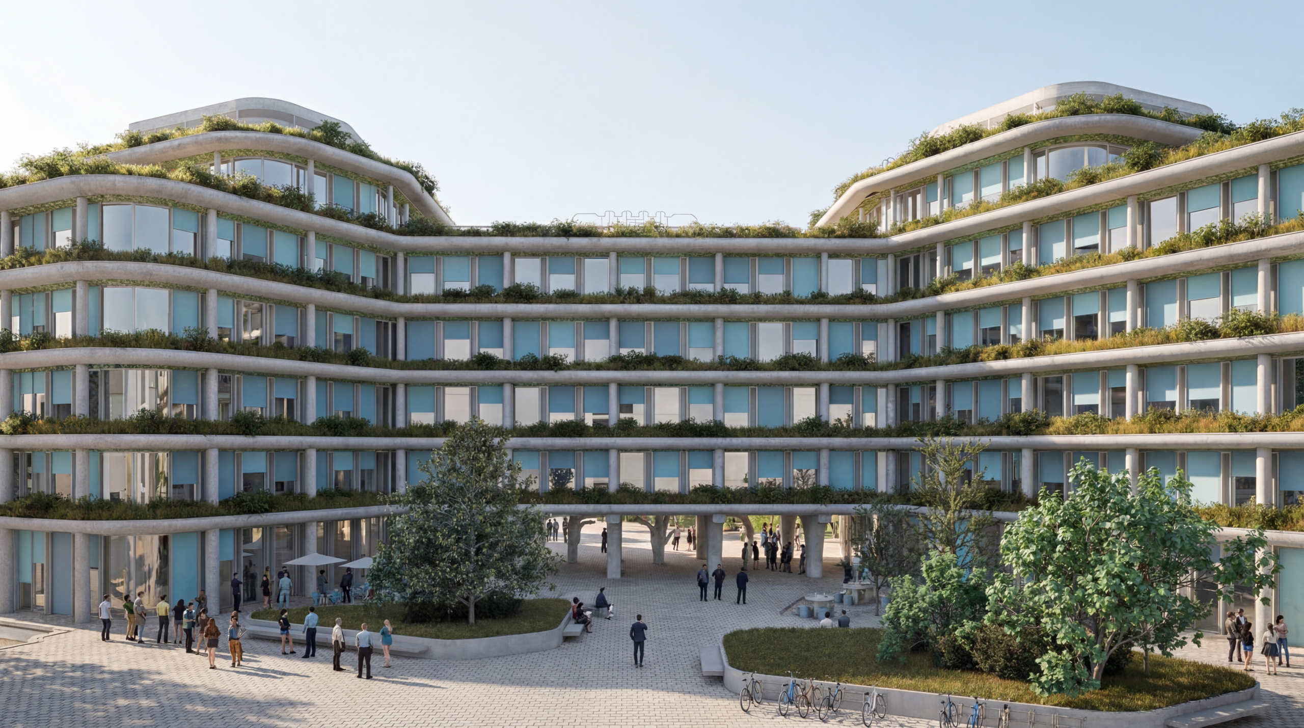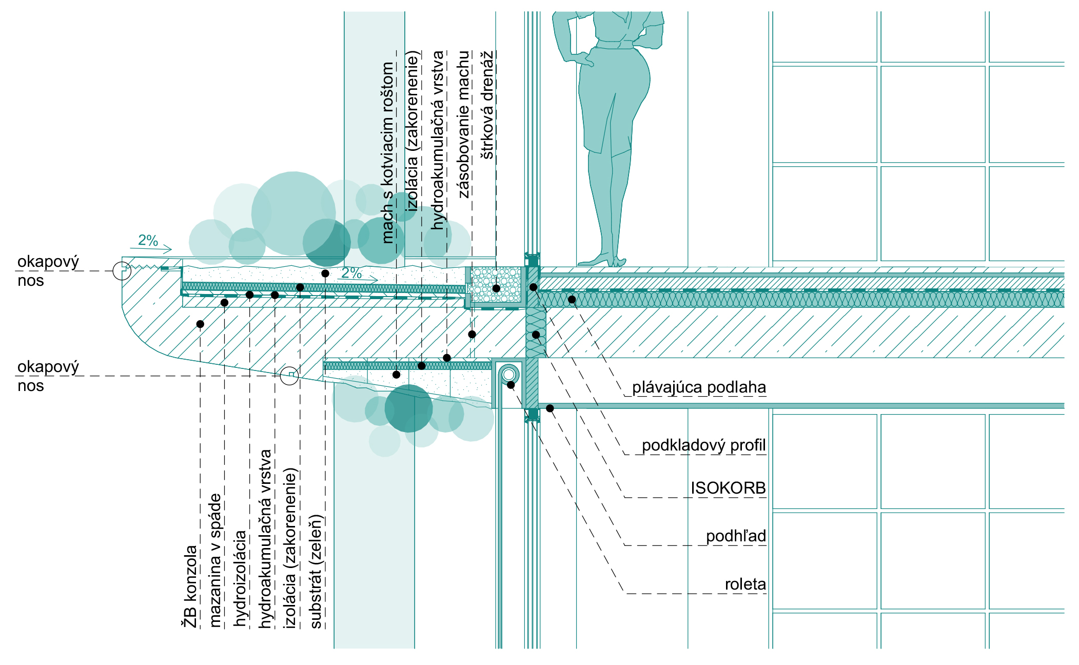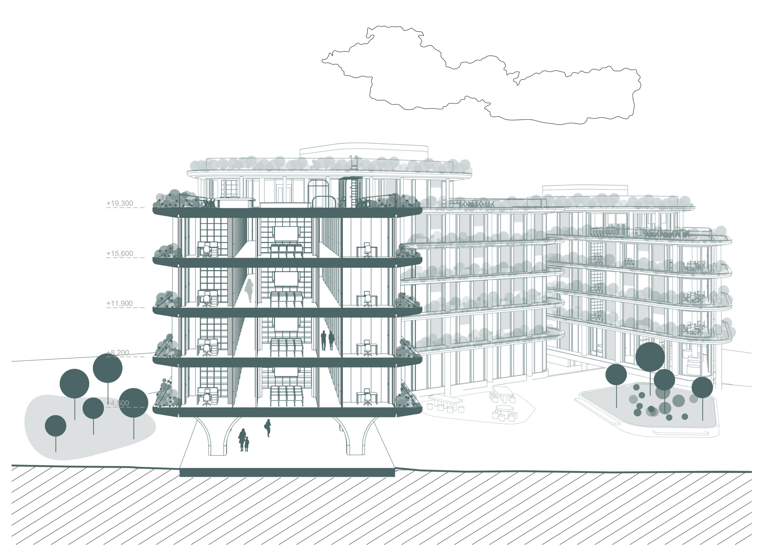 Stavba pôsobí ako súčasná, organicky modelovaná administratívna budova, ktorej výraz je založený na horizontálnom vrstvení podlaží, zaoblených nárožiach, výraznej prítomnosti zelene a vizuálnej ľahkosti spodného podlažia. Koncept je nositeľom prístupu „architektúra ako krajina“, kde každé podlažie vytvára horizontálnu líniu pripomínajúcu terasu (platformu) s vegetáciou. Polo-intenzívna vegetácia je zmäkčujúcim prvkom na priečelí, ktorý zároveň zlepšuje okolitú klímu (zachytávanie prachu, zníženie teploty v lete…). Vďaka veľkým preskleniam je v zime zabezpečené dostatočné množstvo solárnych ziskov. V letnom období je prehrievanie riešené prirodzeným tienením konzolového vyloženia a roletami, ktorých farebnosť bola vybratá na základe ideálnych farieb znižujúcich stres a podporujúcich koncentráciu. Pred fasádou je navrhnutý priznaný nosný systém zo železobetónových stĺpov, ktoré budú tak ako ja konzoly v danej materialite priznané a povrchovo upravené pieskovaním, alebo štokovaním. Strecha na 6.NP je navrhnutá ako pobytová s možnosťou využitia na športové aktivity, oddych a podporu komunitného fungovania užívateľov a zlepšovanie medziľudských vzťahov.